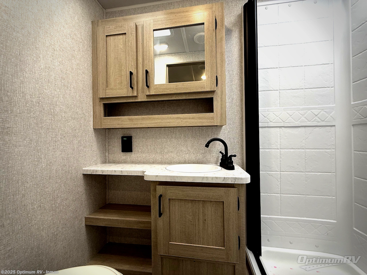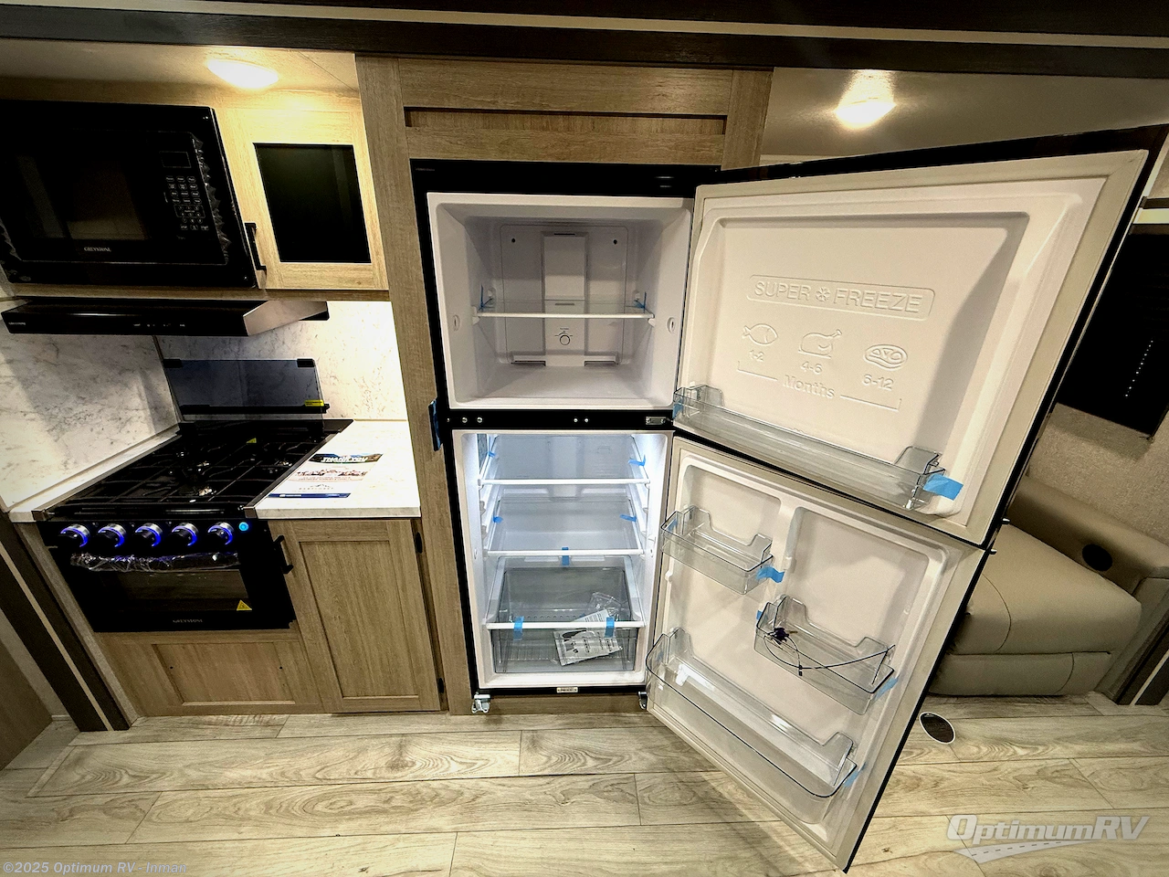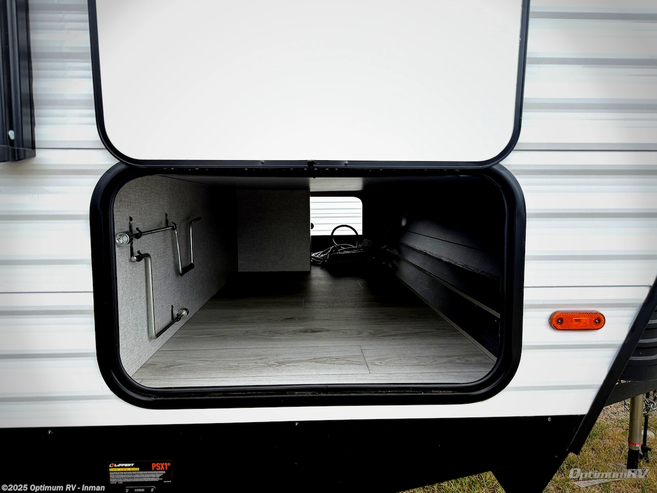 Head to the lake in this travel trailer with a large slide out for more space and comfort! Once you arrive, you can put out the 18' power awning, unload the pass-through storage, and make lunch on the outdoor kitchen with a pull-out griddle and refrigerator. The booth dinette inside can be used as dining space, and there is storage underneath here for added convenience. A jiffy sofa within the slide can be switched out for an optional theater seat if you don't need the extra sleeping space. You will also find a full interior kitchen in the rear corner, and the full bath in the other rear corner is sure to come in handy. When you're ready for some shut-eye, the king bed in the front bedroom will feel just like home. There are also dual wardrobes and nightstands to keep your things tidy!