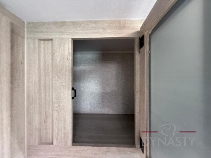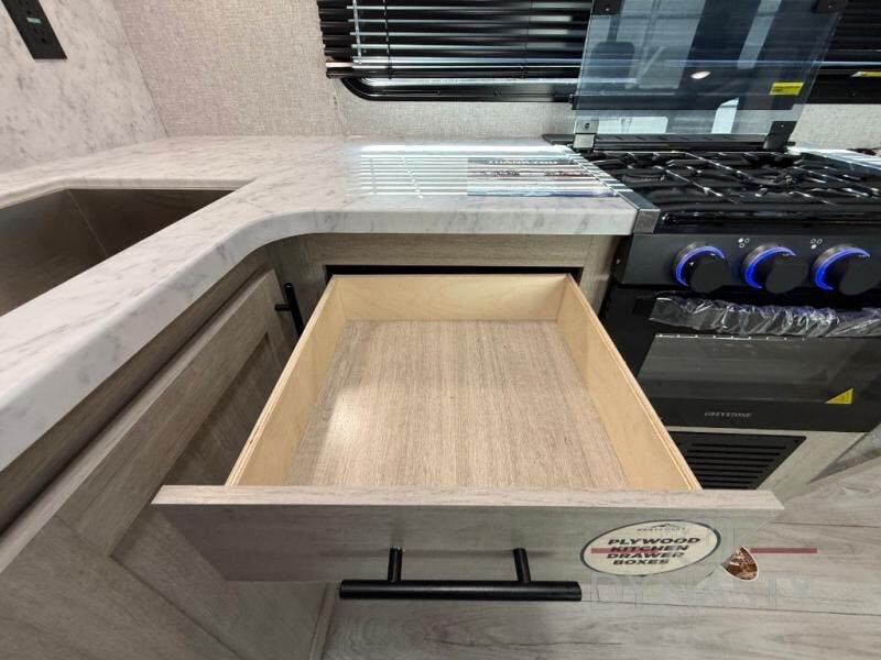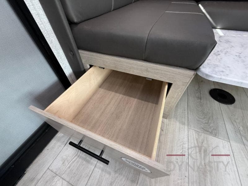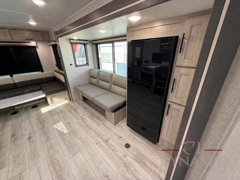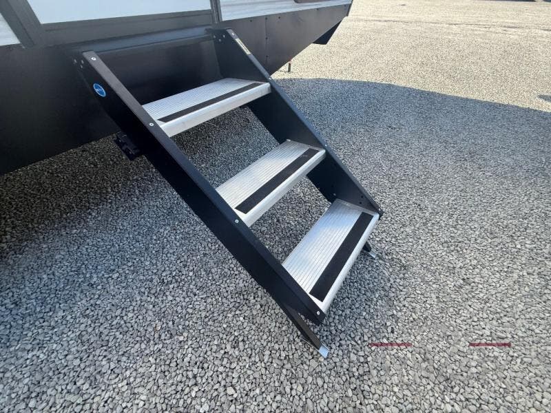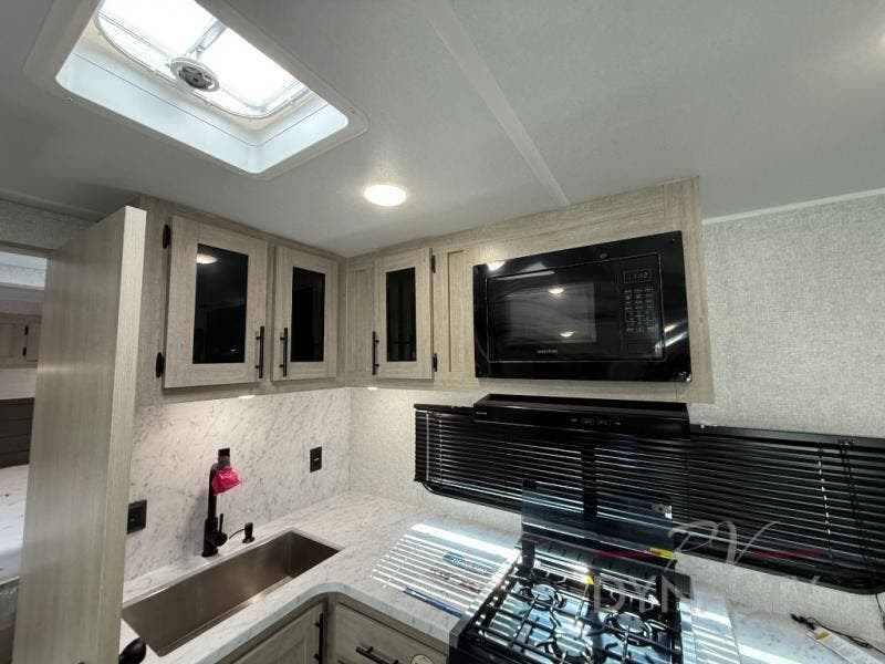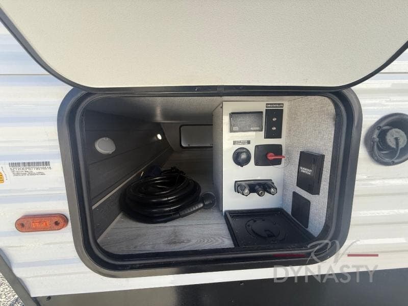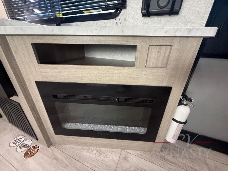 When you are wanting a little more interior space in your next travel trailer, take a look inside! This large slide out widens the main living space so you can easily make meals using full amenities without having to move for someone walking from the front bedroom and walk-through bath to the U-shaped dinette in the back. For sleeping, there is a king-size bed with storage on both sides at the very front of this unit giving you privacy from the rest, and even a private second entry/exit door from within the bedroom. You will find storage beneath the bed for larger items or extra blankets, plus a space saving sliding door. The U-shaped dinette and jackknife sofa offer comfortable seating as well as extra sleeping space for overnight guests, and the fireplace is just a nice feature to enjoy. On the outside, an 18' awning provides a large outdoor living area protected from the elements, and the oversized pass-through will house all of your exterior gear like lawn chairs, outdoor games and rugs, plus so much more!
