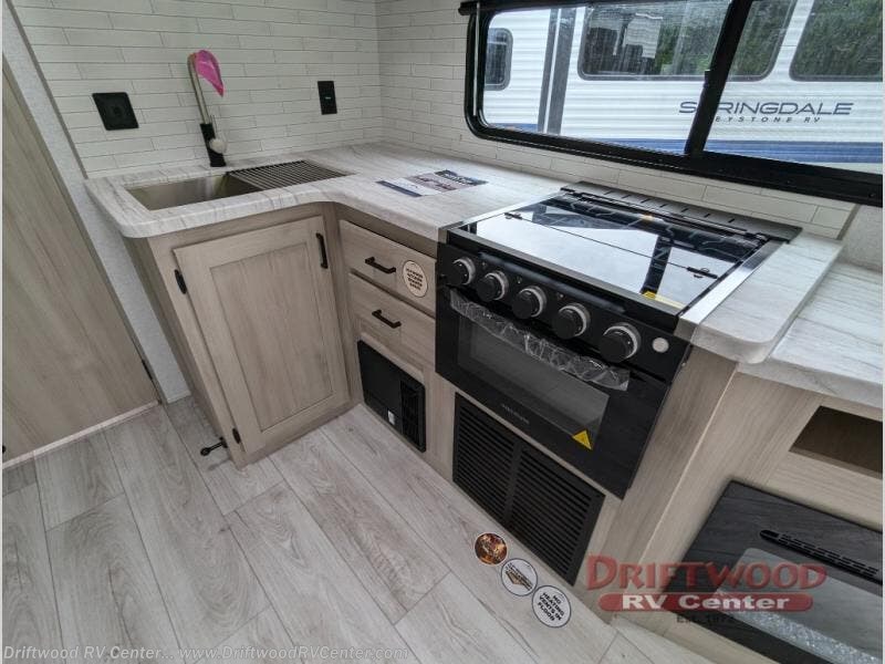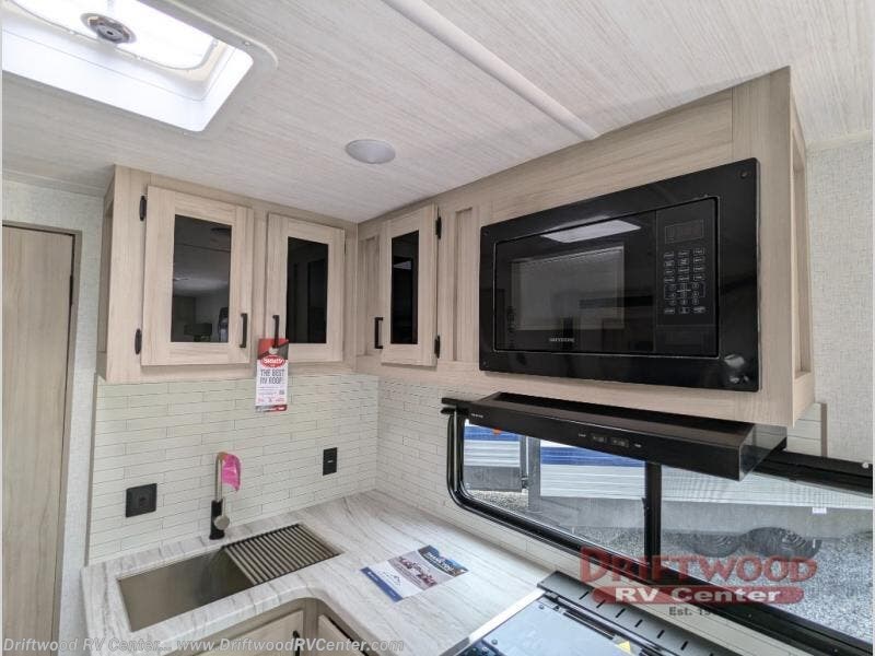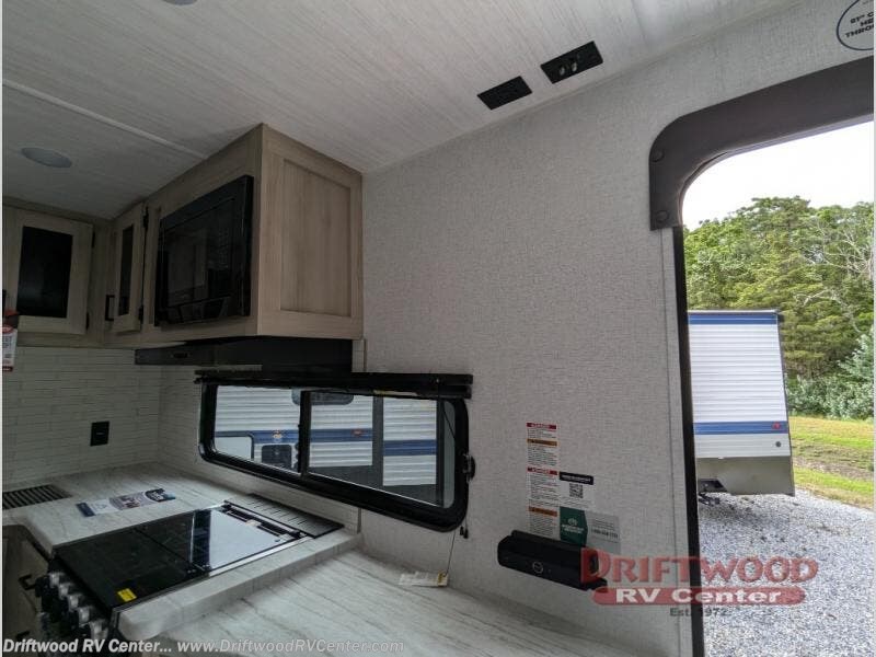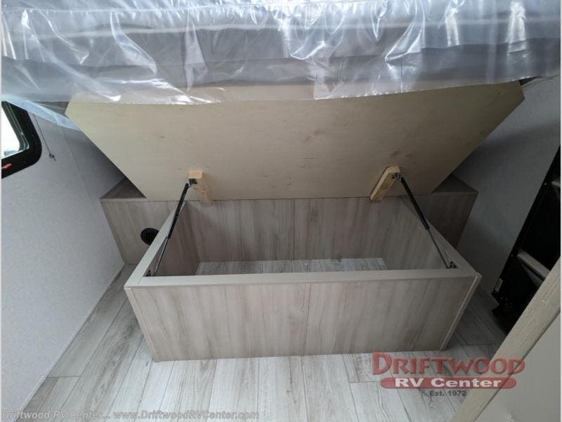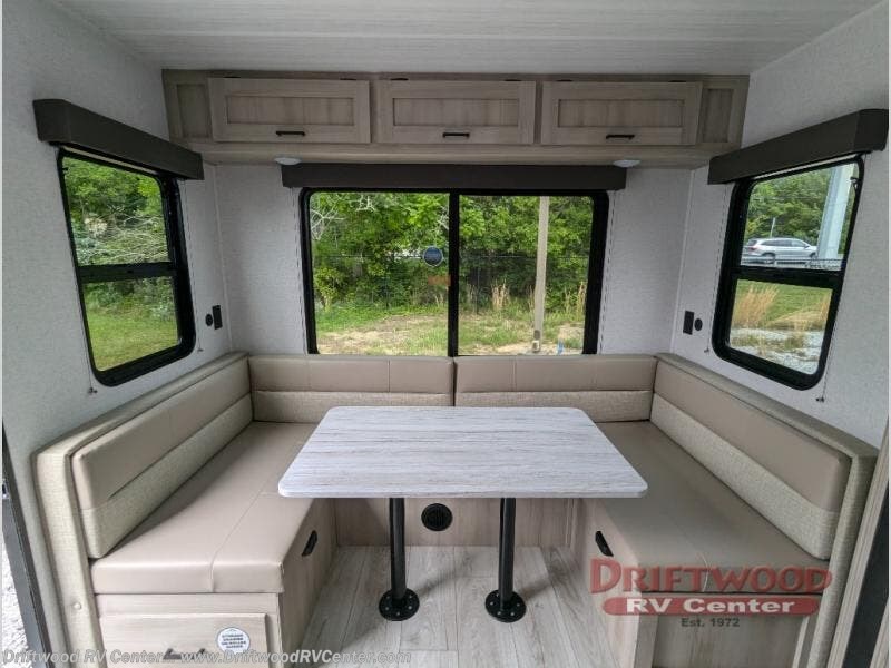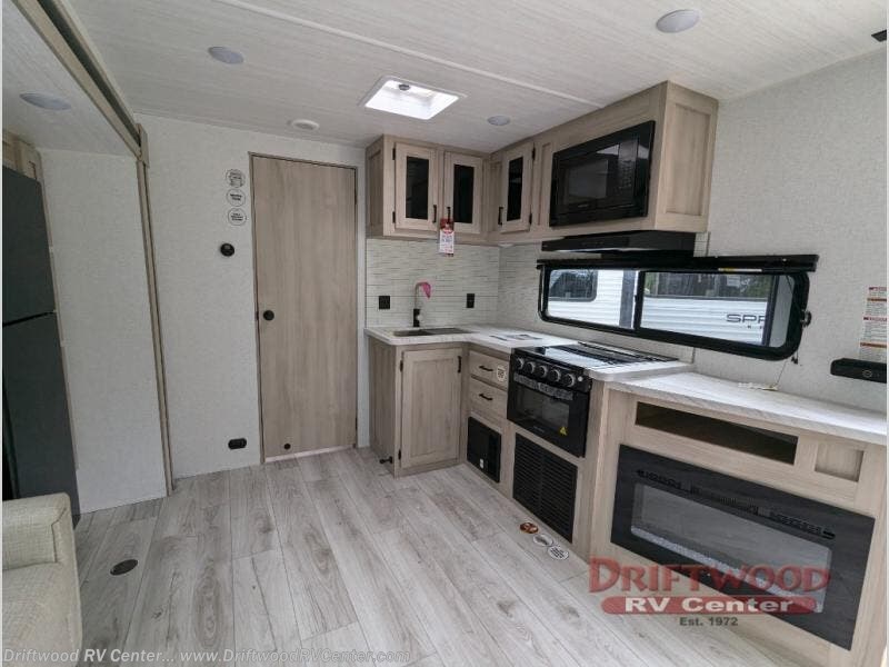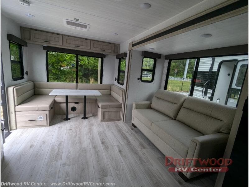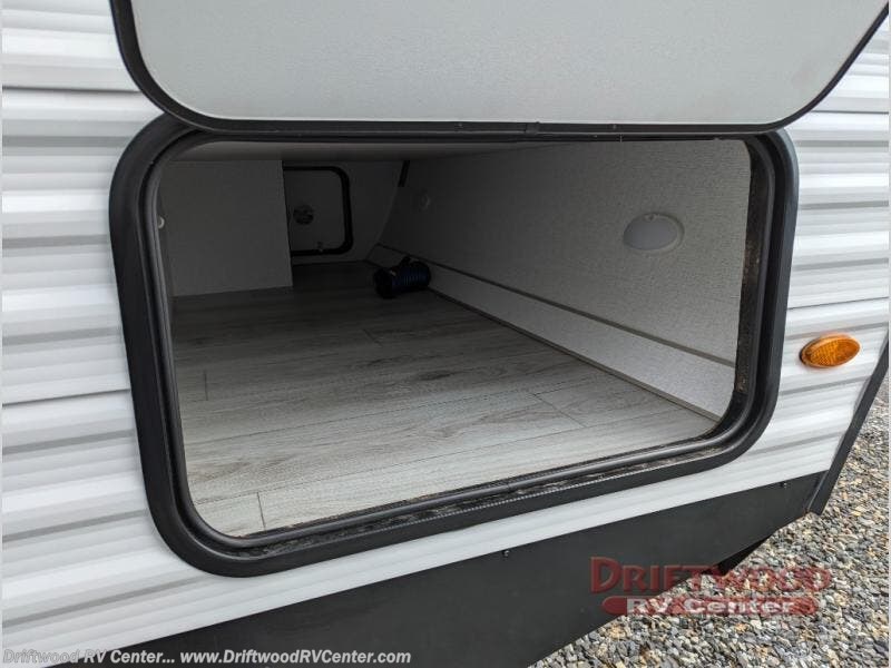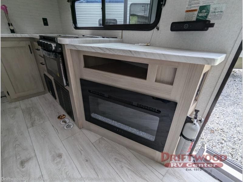 When you are wanting a little more interior space in your next travel trailer, take a look inside! This large slide out widens the main living space so you can easily make meals using full amenities without having to move for someone walking from the front bedroom and walk-through bath to the U-shaped dinette in the back. For sleeping, there is a king-size bed with storage on both sides at the very front of this unit giving you privacy from the rest, and even a private second entry/exit door from within the bedroom. You will find storage beneath the bed for larger items or extra blankets, plus a space saving sliding door. The U-shaped dinette and jackknife sofa offer comfortable seating as well as extra sleeping space for overnight guests, and the fireplace is just a nice feature to enjoy. On the outside, an 18' awning provides a large outdoor living area protected from the elements, and the oversized pass-through will house all of your exterior gear like lawn chairs, outdoor games and rugs, plus so much more!