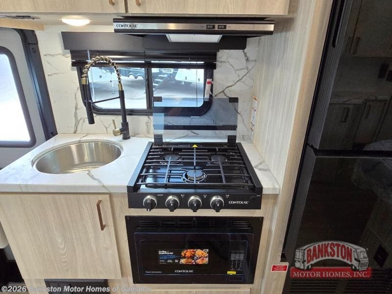 With any Entrada Class C gas motorhome from EAST TO WEST, the construction consists of a one-piece painted fiberglass front cap, a TPO roof membrane, and 2" Azdel composite sidewalls for added durability. There are rotocast exterior storage compartments with slam latch doors, along with an exterior LP Quick Connect, and a power awning with an LED light strip. You will also find rear and sideview cameras to help make maneuvering and parking your RV easier than ever. Inside, you'll feel right at home with soft close hardwood cabinet doors and drawers, a high-altitude tankless water heater, plus a 12V smart TV and USB ports to keep your electronics charged up!