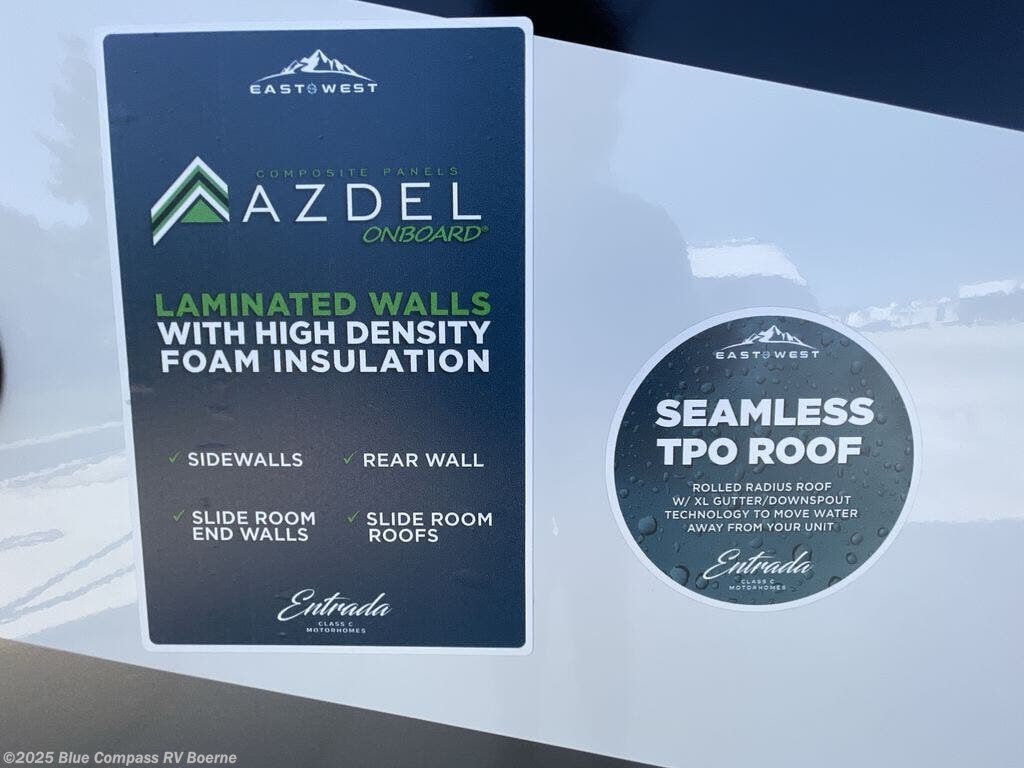 With any Entrada Class C gas motorhome from EAST TO WEST, the construction consists of an automotive painted fiberglass front cap, a Dicor DiFlex ll TPO roof membrane, and Azdel composite sidewalls for added durability. Some of the Entrada value package features include 12V tank heaters to camp during the cooler months, the Winegard Air 360+, plus backup and sideview cameras with a monitor for safety on and off the road. The interior offers a 7-foot interior height for a spacious feel, and 12V USB charge ports will keep your electronics powered up. Choose an Entrada for its tasteful design, attention to detail, bright interior and affordable price-point!