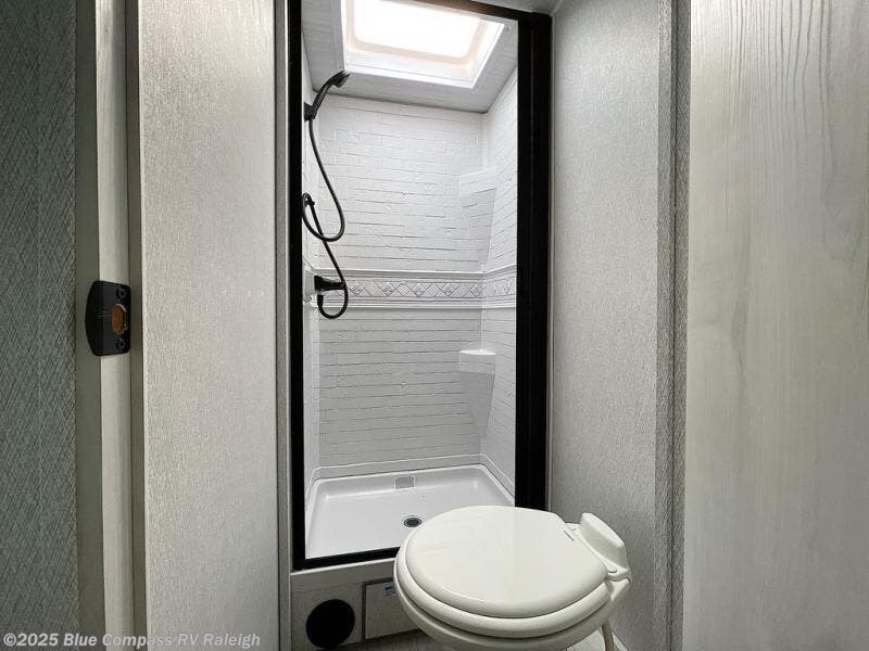 You're going to love traveling and camping in this coach that can sleep five to six each night. The convection microwave and 10.7 cu. ft. 12V refrigerator will let you cook and store food, and the booth dinette provides a place to dine together. A private bath includes a shower and toilet, with the sink just outside this room so two people can freshen up at once. You will sleep soundly each night on the rear corner queen bed with overhead storage for your belongings, while the little ones take the 60" x 80" bunk over cab!