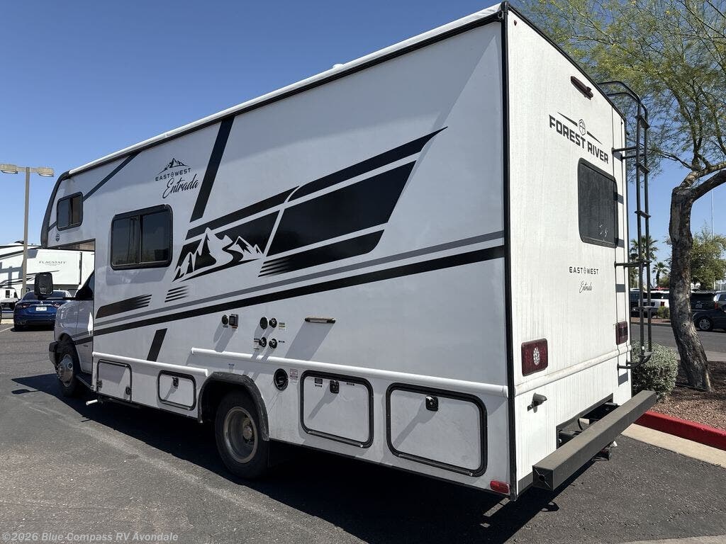 With any Entrada Class C gas motorhome from EAST TO WEST, the construction consists of a one-piece painted fiberglass front cap, a TPO roof membrane, and 2" Azdel composite sidewalls for added durability. There are rotocast exterior storage compartments with slam latch doors, along with an exterior LP Quick Connect, and a power awning with an LED light strip. You will also find rear and sideview cameras to help make maneuvering and parking your RV easier than ever. Inside, you'll feel right at home with soft close hardwood cabinet doors and drawers, a high-altitude tankless water heater, plus a 12V smart TV and USB ports to keep your electronics charged up!