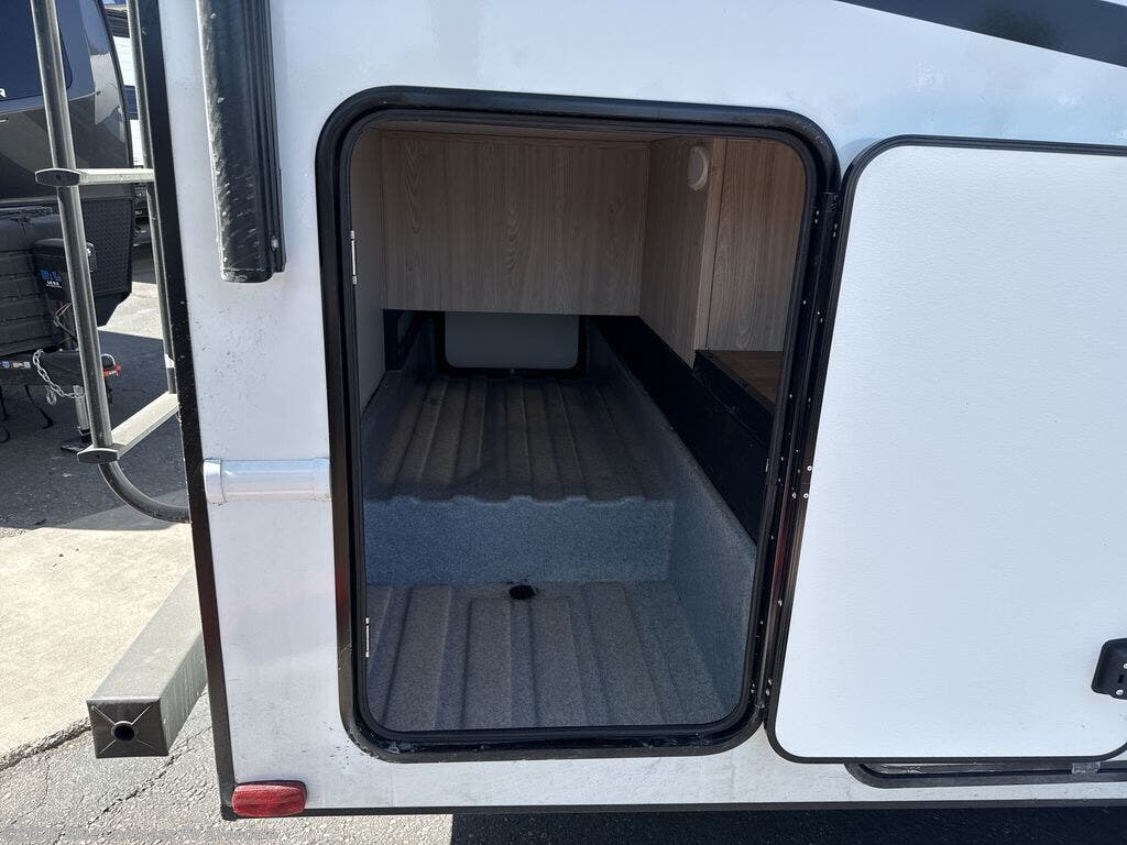 You're going to love traveling and camping in this coach that can sleep five to six each night. The convection microwave and 10.7 cu. ft. 12V refrigerator will let you cook and store food, and the booth dinette provides a place to dine together. A private bath includes a shower and toilet, with the sink just outside this room so two people can freshen up at once. You will sleep soundly each night on the rear corner queen bed with overhead storage for your belongings, while the little ones take the 60" x 80" bunk over cab!