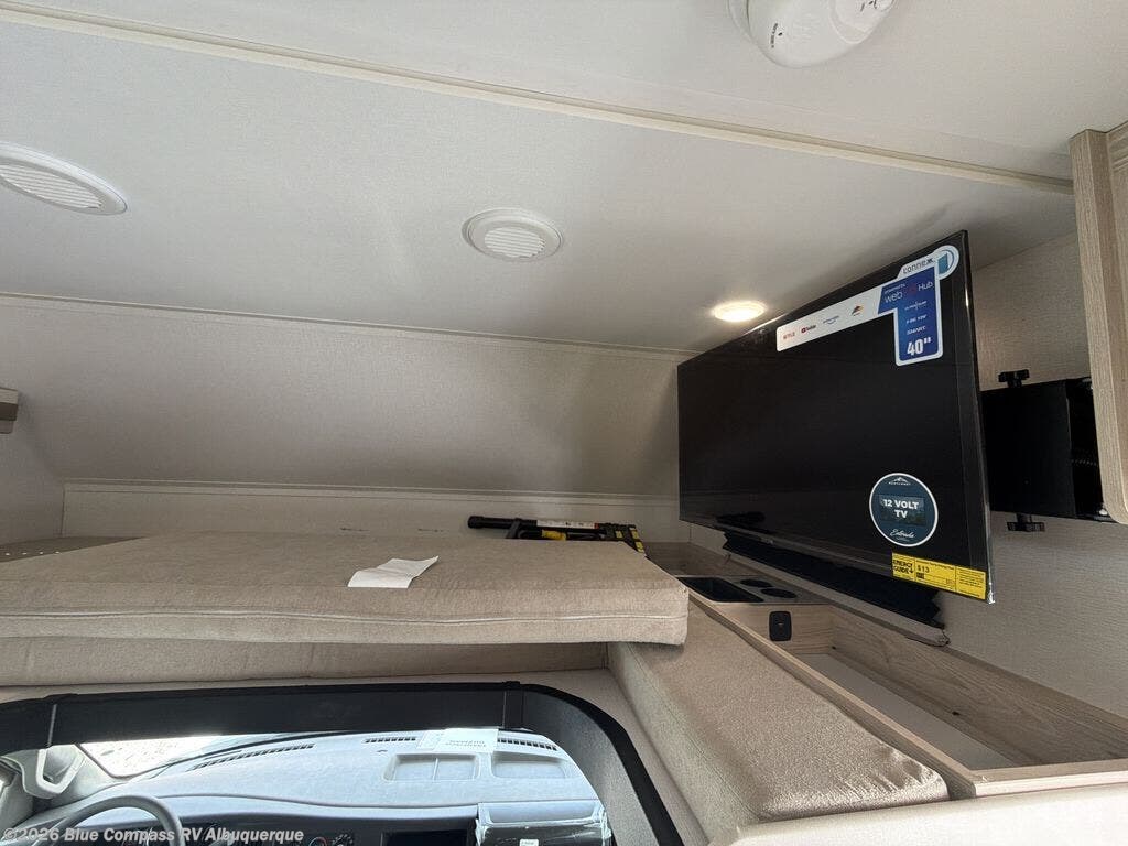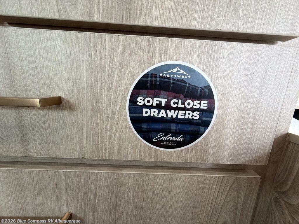 With any Entrada Class C gas motorhome from EAST TO WEST, the construction consists of a one-piece painted fiberglass front cap, a TPO roof membrane, and 2" Azdel composite sidewalls for added durability. There are rotocast exterior storage compartments with slam latch doors, along with an exterior LP Quick Connect, and a power awning with an LED light strip. You will also find rear and sideview cameras to help make maneuvering and parking your RV easier than ever. Inside, you'll feel right at home with soft close hardwood cabinet doors and drawers, a high-altitude tankless water heater, plus a 12V smart TV and USB ports to keep your electronics charged up!