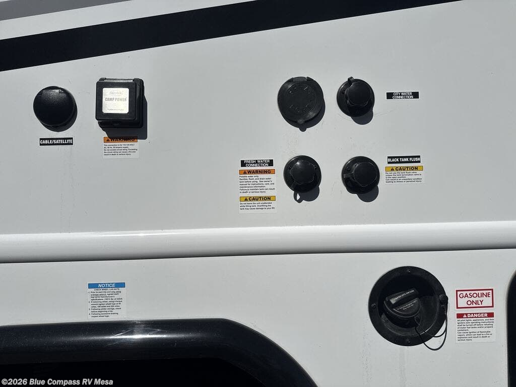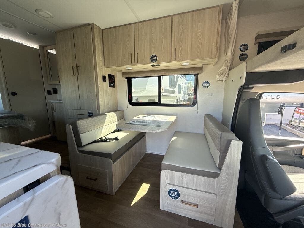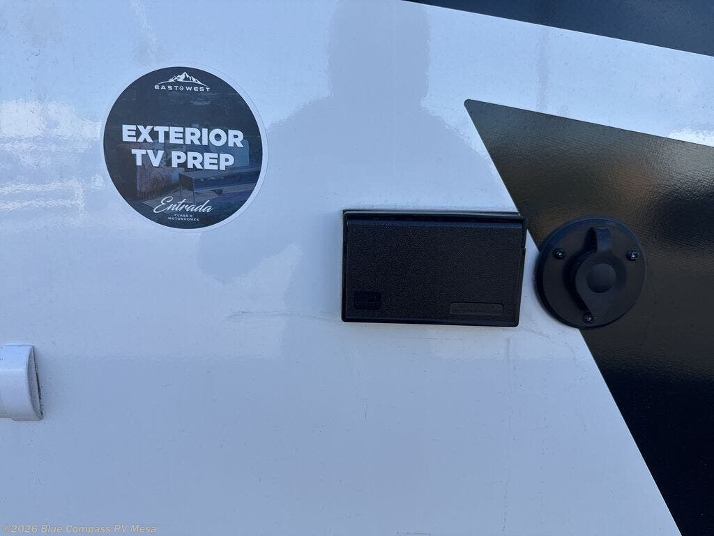 With any Entrada Class C gas motorhome from EAST TO WEST, the construction consists of a one-piece painted fiberglass front cap, a TPO roof membrane, and 2" Azdel composite sidewalls for added durability. There are rotocast exterior storage compartments with slam latch doors, along with an exterior LP Quick Connect, and a power awning with an LED light strip. You will also find rear and sideview cameras to help make maneuvering and parking your RV easier than ever. Inside, you'll feel right at home with soft close hardwood cabinet doors and drawers, a high-altitude tankless water heater, plus a 12V smart TV and USB ports to keep your electronics charged up!
