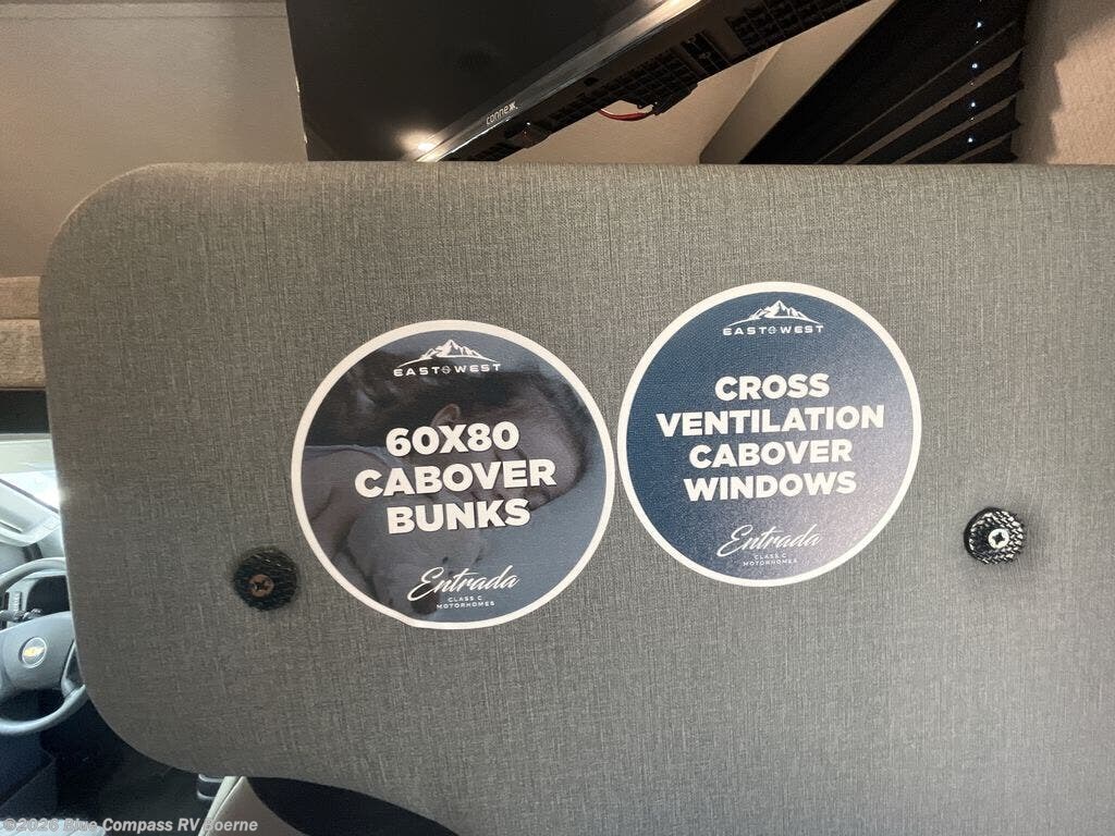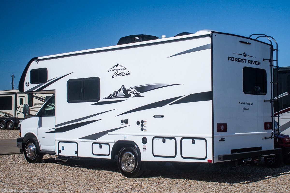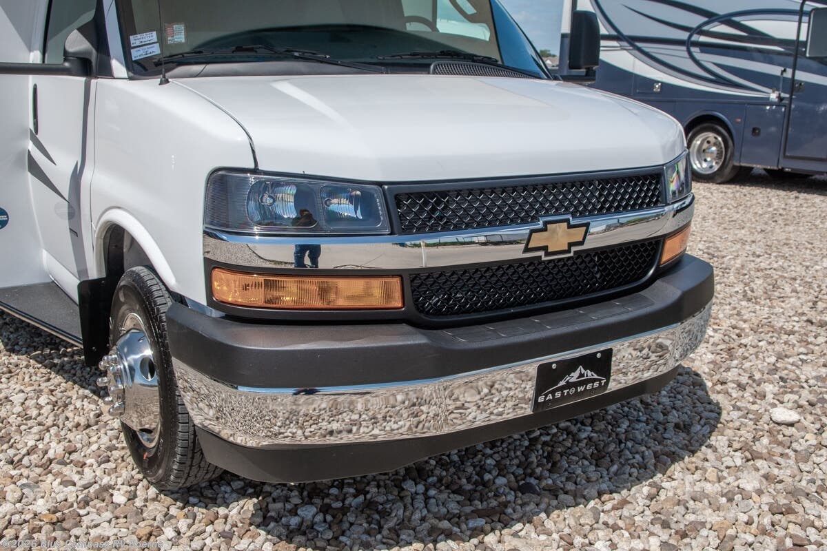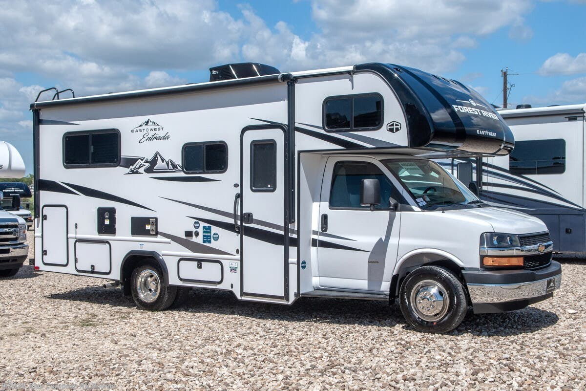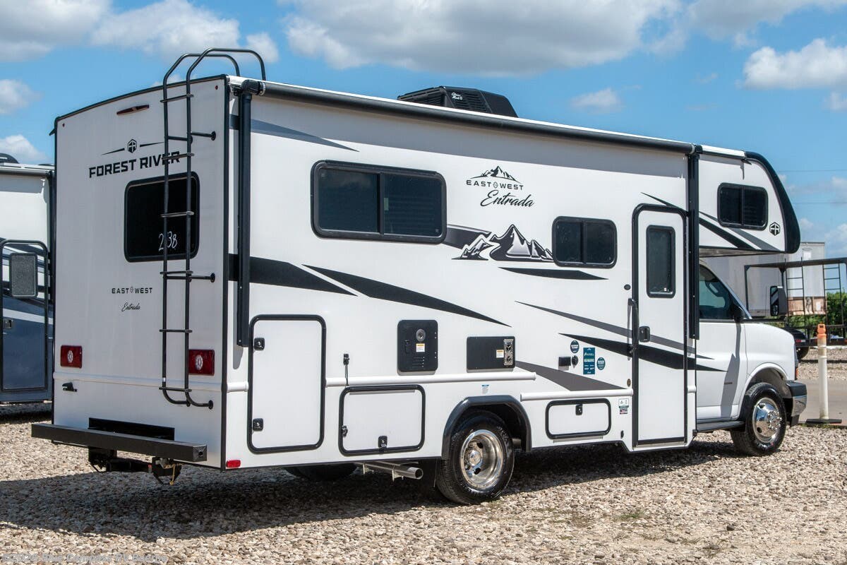 With any Entrada Class C gas motorhome from EAST TO WEST, the construction consists of a one-piece painted fiberglass front cap, a TPO roof membrane, and 2" Azdel composite sidewalls for added durability. There are rotocast exterior storage compartments with slam latch doors, along with an exterior LP Quick Connect, and a power awning with an LED light strip. You will also find rear and sideview cameras to help make maneuvering and parking your RV easier than ever. Inside, you'll feel right at home with soft close hardwood cabinet doors and drawers, a high-altitude tankless water heater, plus a 12V smart TV and USB ports to keep your electronics charged up!