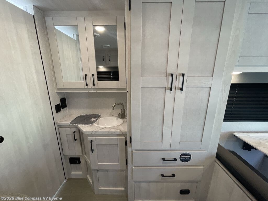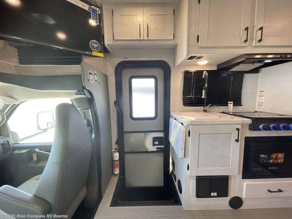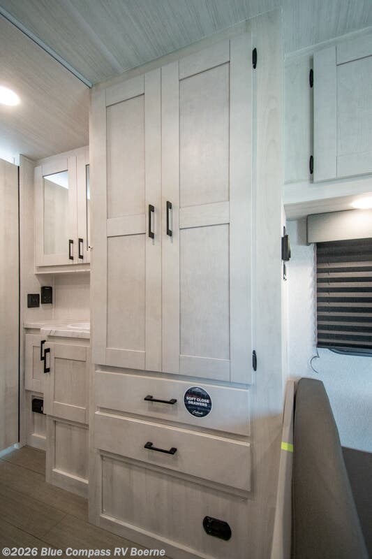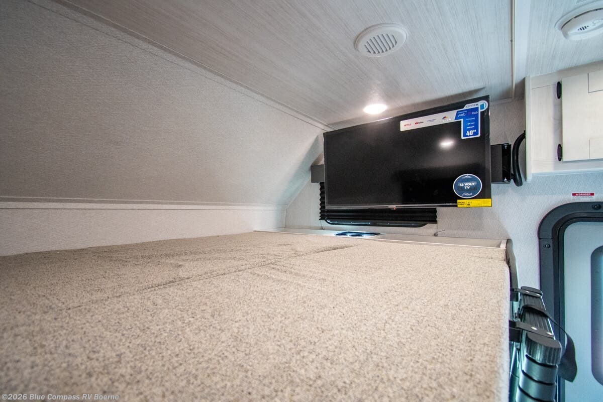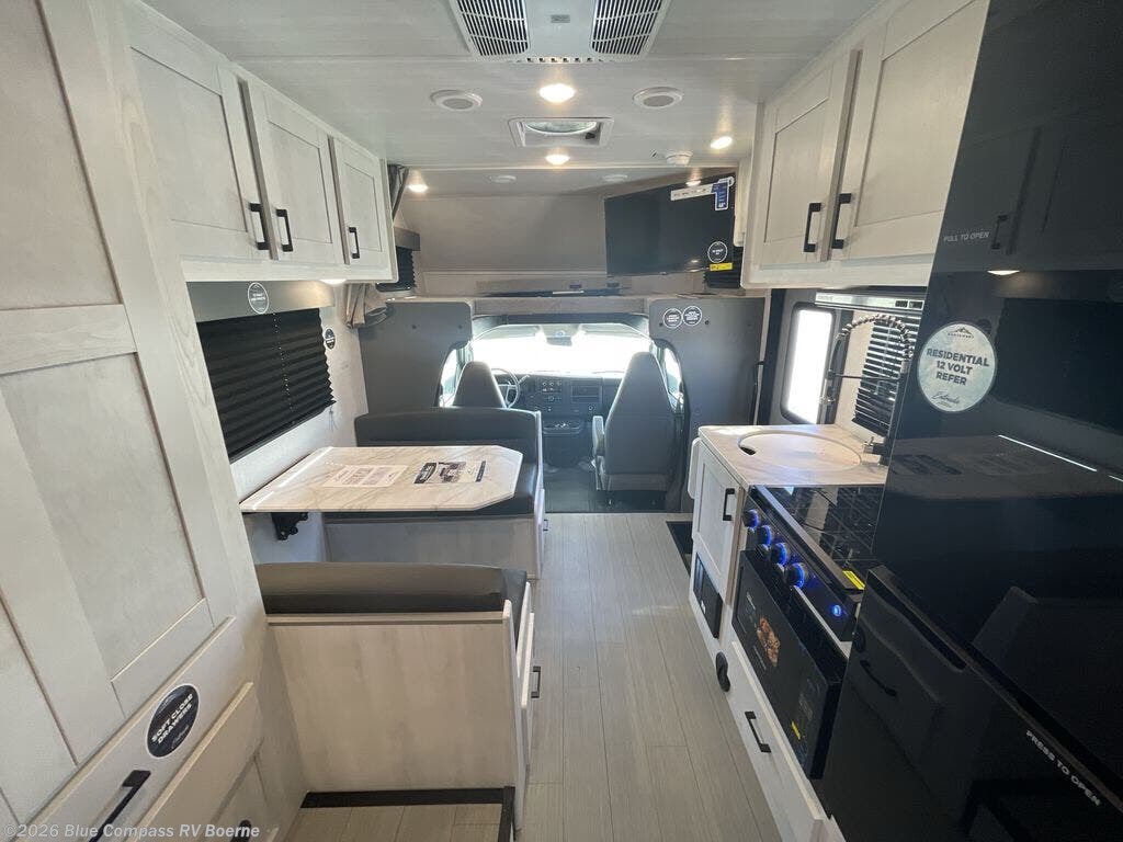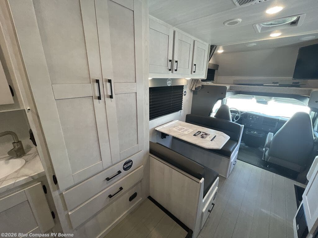 With any Entrada Class C gas motorhome from EAST TO WEST, the construction consists of a one-piece painted fiberglass front cap, a TPO roof membrane, and 2" Azdel composite sidewalls for added durability. There are rotocast exterior storage compartments with slam latch doors, along with an exterior LP Quick Connect, and a power awning with an LED light strip. You will also find rear and sideview cameras to help make maneuvering and parking your RV easier than ever. Inside, you'll feel right at home with soft close hardwood cabinet doors and drawers, a high-altitude tankless water heater, plus a 12V smart TV and USB ports to keep your electronics charged up!