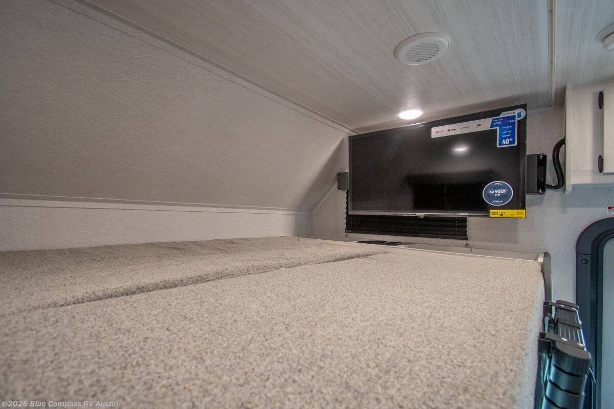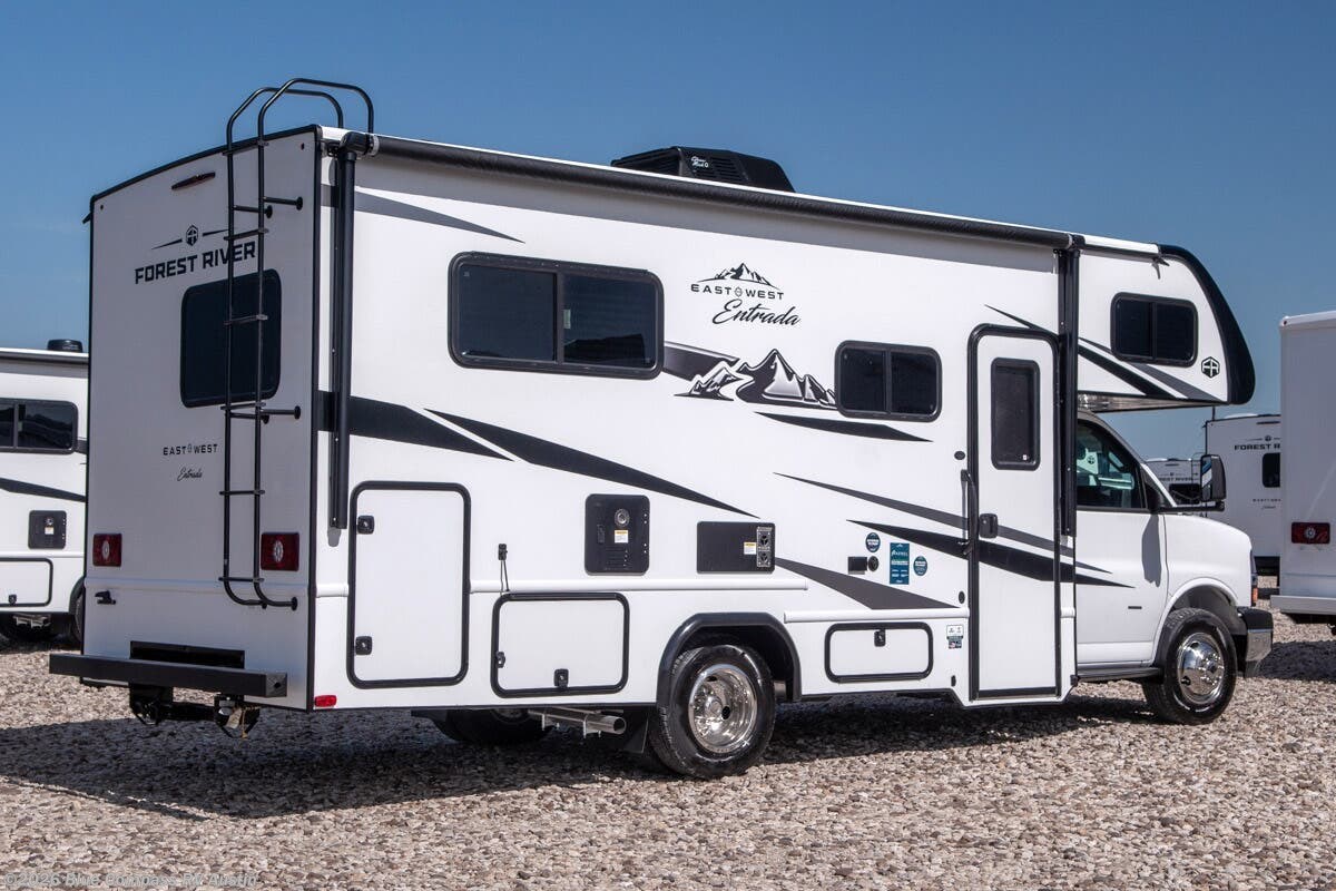 With any Entrada Class C gas motorhome from EAST TO WEST, the construction consists of a one-piece painted fiberglass front cap, a TPO roof membrane, and 2" Azdel composite sidewalls for added durability. There are rotocast exterior storage compartments with slam latch doors, along with an exterior LP Quick Connect, and a power awning with an LED light strip. You will also find rear and sideview cameras to help make maneuvering and parking your RV easier than ever. Inside, you'll feel right at home with soft close hardwood cabinet doors and drawers, a high-altitude tankless water heater, plus a 12V smart TV and USB ports to keep your electronics charged up!