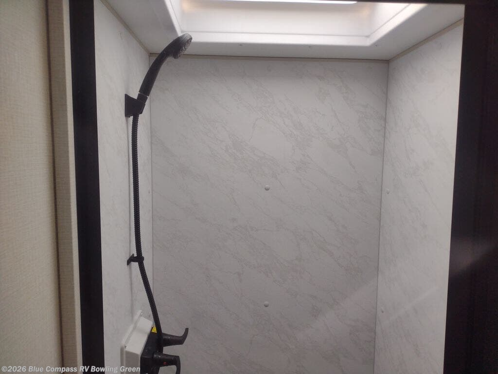 You're going to love traveling and camping in this coach that can sleep five to six each night. The convection microwave and 10.7 cu. ft. 12V refrigerator will let you cook and store food, and the booth dinette provides a place to dine together. A private bath includes a shower and toilet, with the sink just outside this room so two people can freshen up at once. You will sleep soundly each night on the rear corner queen bed with overhead storage for your belongings, while the little ones take the 60" x 80" bunk over cab!