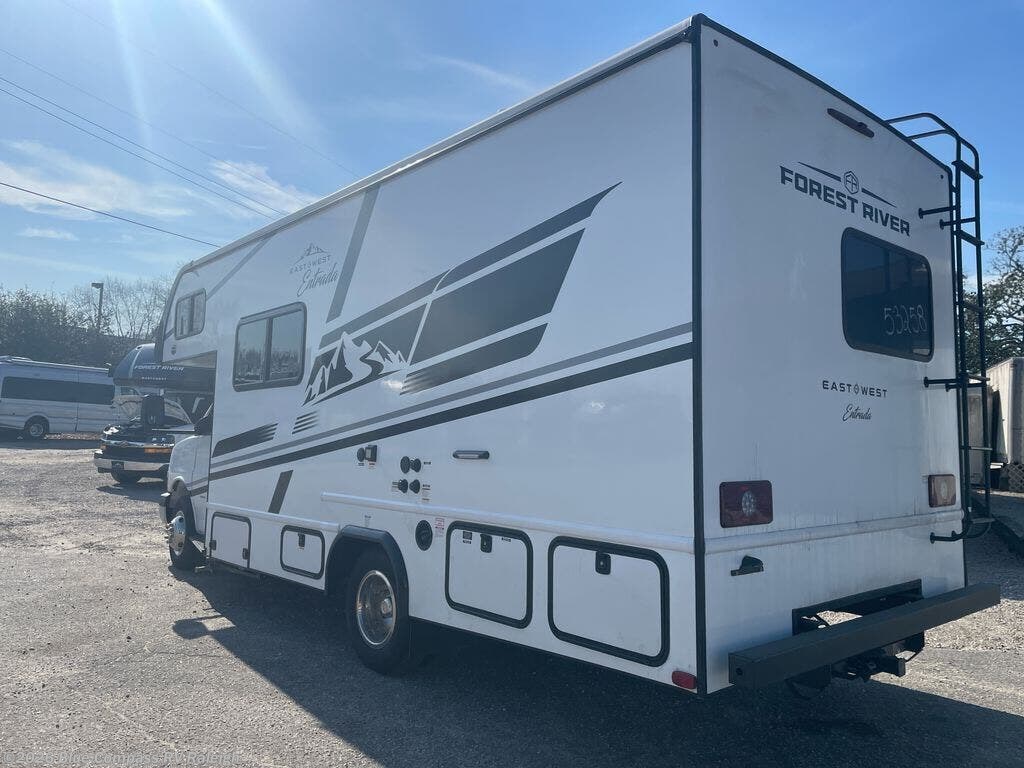 With any Entrada Class C gas motorhome from EAST TO WEST, the construction consists of a one-piece painted fiberglass front cap, a TPO roof membrane, and 2" Azdel composite sidewalls for added durability. There are rotocast exterior storage compartments with slam latch doors, along with an exterior LP Quick Connect, and a power awning with an LED light strip. You will also find rear and sideview cameras to help make maneuvering and parking your RV easier than ever. Inside, you'll feel right at home with soft close hardwood cabinet doors and drawers, a high-altitude tankless water heater, plus a 12V smart TV and USB ports to keep your electronics charged up!