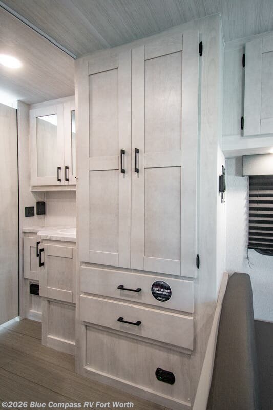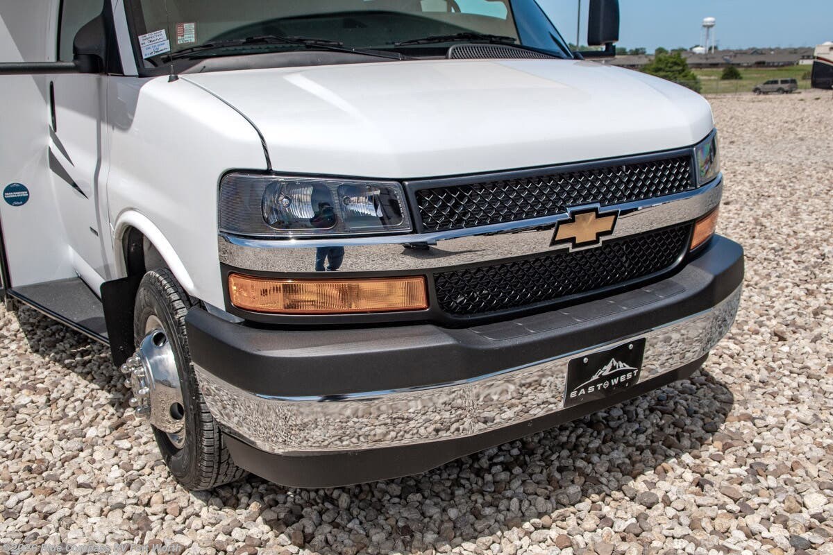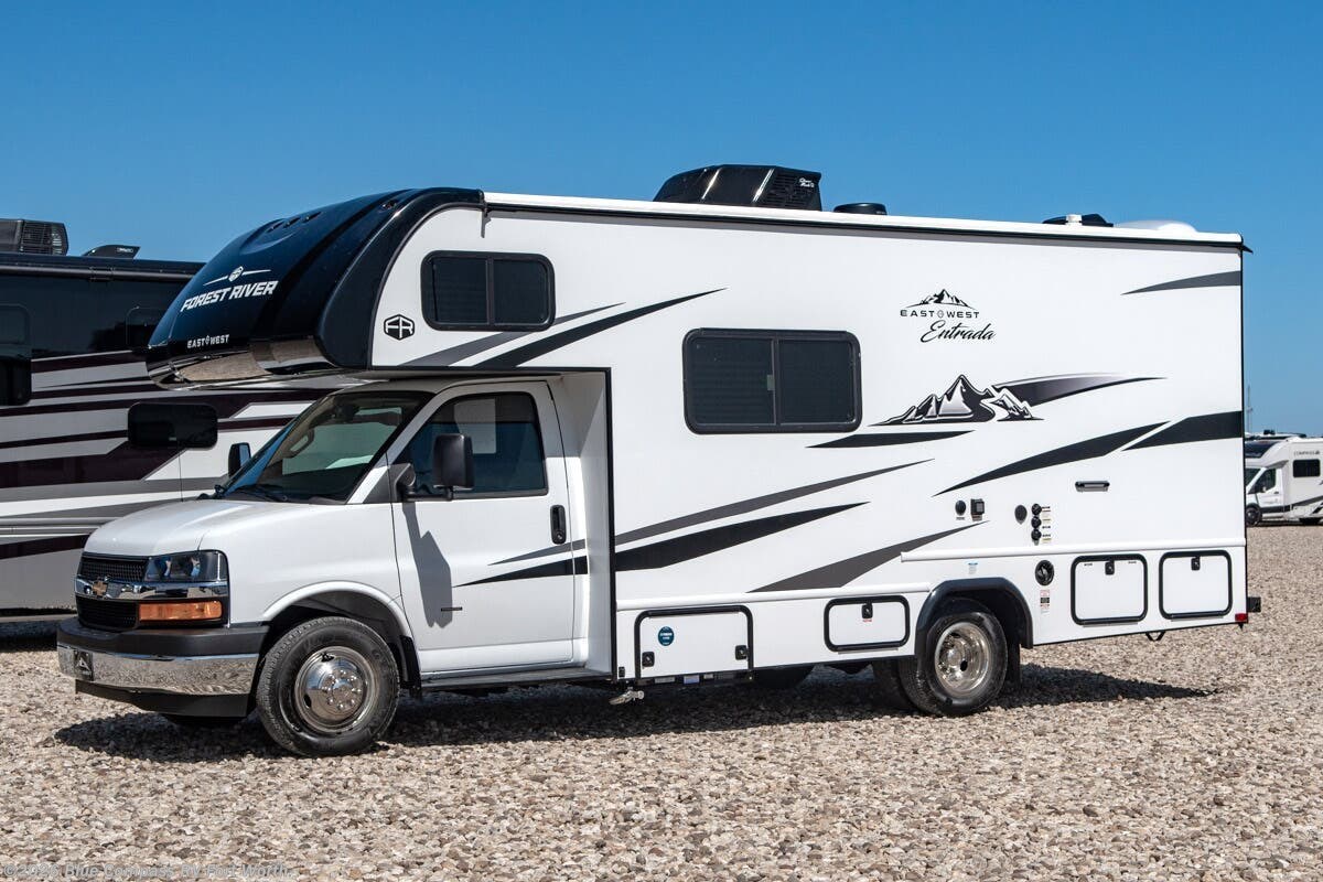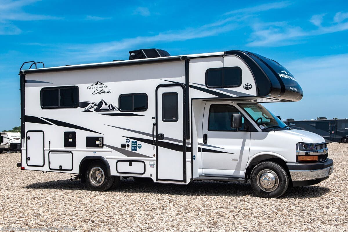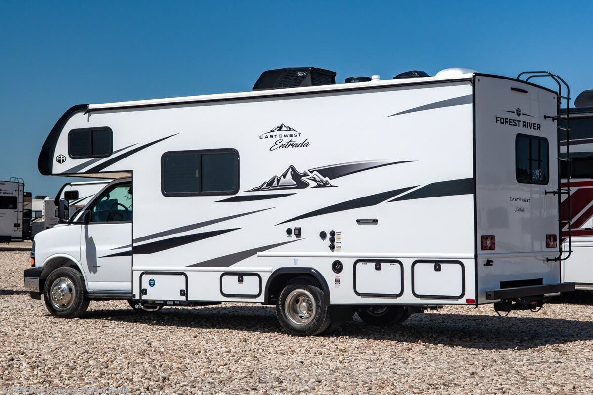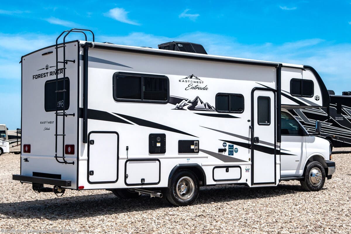 With any Entrada Class C gas motorhome from EAST TO WEST, the construction consists of a one-piece painted fiberglass front cap, a TPO roof membrane, and 2" Azdel composite sidewalls for added durability. There are rotocast exterior storage compartments with slam latch doors, along with an exterior LP Quick Connect, and a power awning with an LED light strip. You will also find rear and sideview cameras to help make maneuvering and parking your RV easier than ever. Inside, you'll feel right at home with soft close hardwood cabinet doors and drawers, a high-altitude tankless water heater, plus a 12V smart TV and USB ports to keep your electronics charged up!