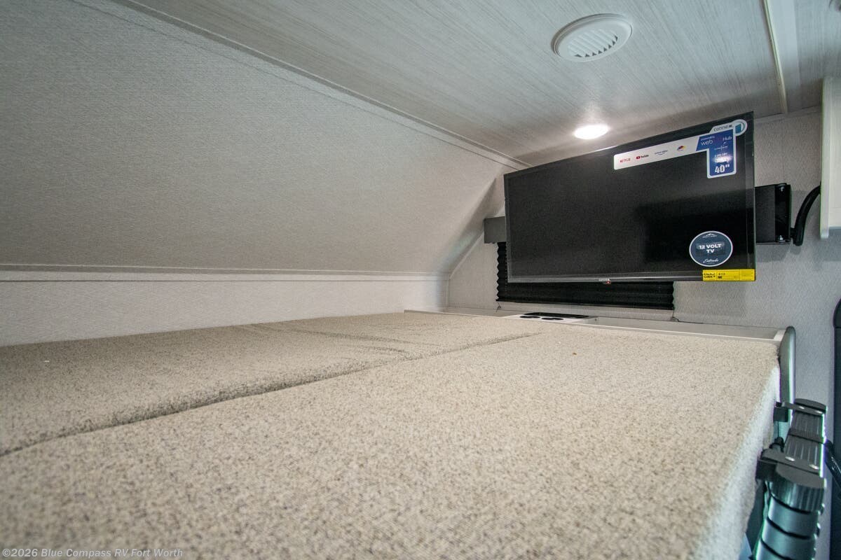 You're going to love traveling and camping in this coach that can sleep five to six each night. The convection microwave and 10.7 cu. ft. 12V refrigerator will let you cook and store food, and the booth dinette provides a place to dine together. A private bath includes a shower and toilet, with the sink just outside this room so two people can freshen up at once. You will sleep soundly each night on the rear corner queen bed with overhead storage for your belongings, while the little ones take the 60" x 80" bunk over cab!