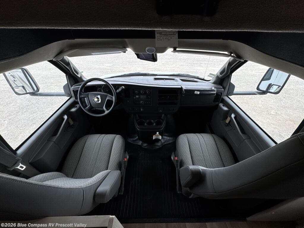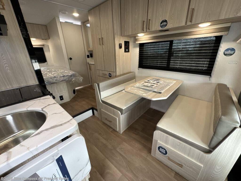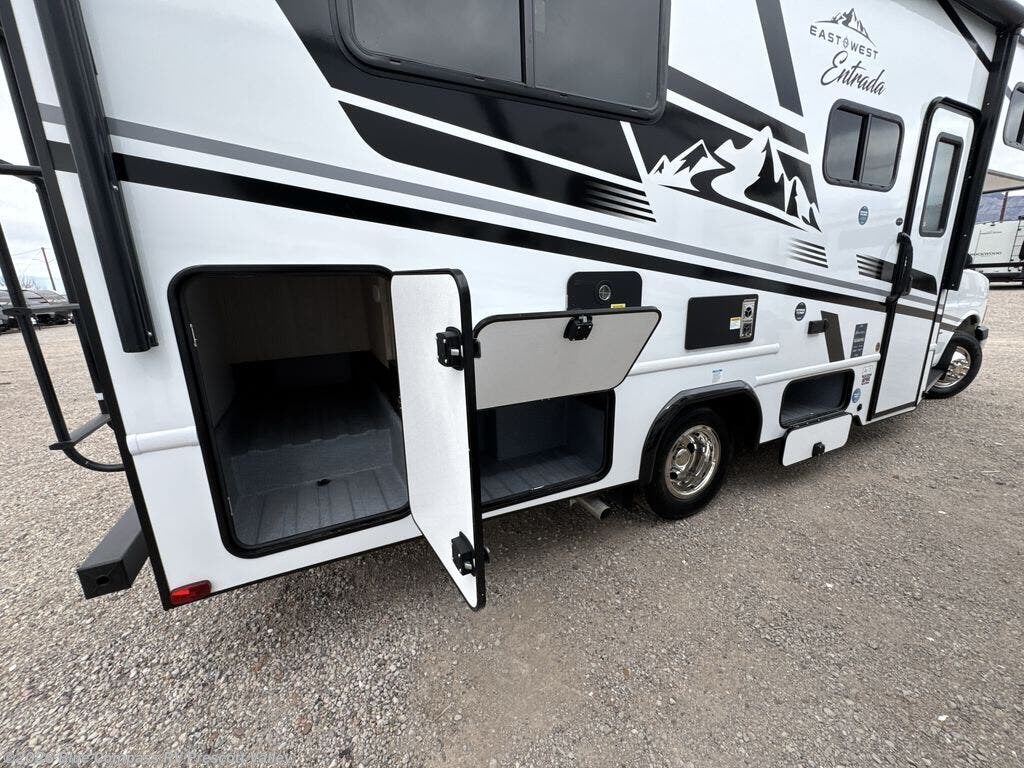 With any Entrada Class C gas motorhome from EAST TO WEST, the construction consists of a one-piece painted fiberglass front cap, a TPO roof membrane, and 2" Azdel composite sidewalls for added durability. There are rotocast exterior storage compartments with slam latch doors, along with an exterior LP Quick Connect, and a power awning with an LED light strip. You will also find rear and sideview cameras to help make maneuvering and parking your RV easier than ever. Inside, you'll feel right at home with soft close hardwood cabinet doors and drawers, a high-altitude tankless water heater, plus a 12V smart TV and USB ports to keep your electronics charged up!