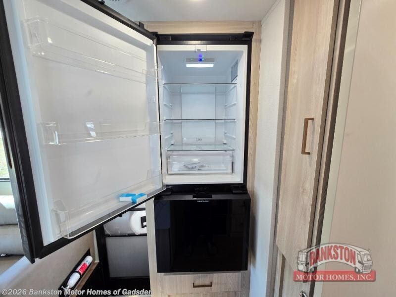 Comfort comes easy in this coach! There is a 62" sofa and 42" x 68" booth dinette that can be used for lounging together after an afternoon of walking around the campground, plus the bunk over the cab and the queen-size bed can be utilized if you are too tired to stay up for another minute. Once you are fully rested, head to the kitchen to prepare a delicious breakfast feast with the cooktop and convection microwave with air fryer technology. Use the double sink to clean up, and the 10.7-cubic foot refrigerator to keep your perishables fresh. You can even add some extra prep space to this area by pulling out the flip-up countertop. There is also storage all throughout this motorhome with bedside closets, the bathroom shelves, a kitchen pantry, cab storage, and within overhead cabinets.