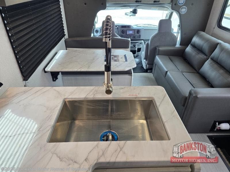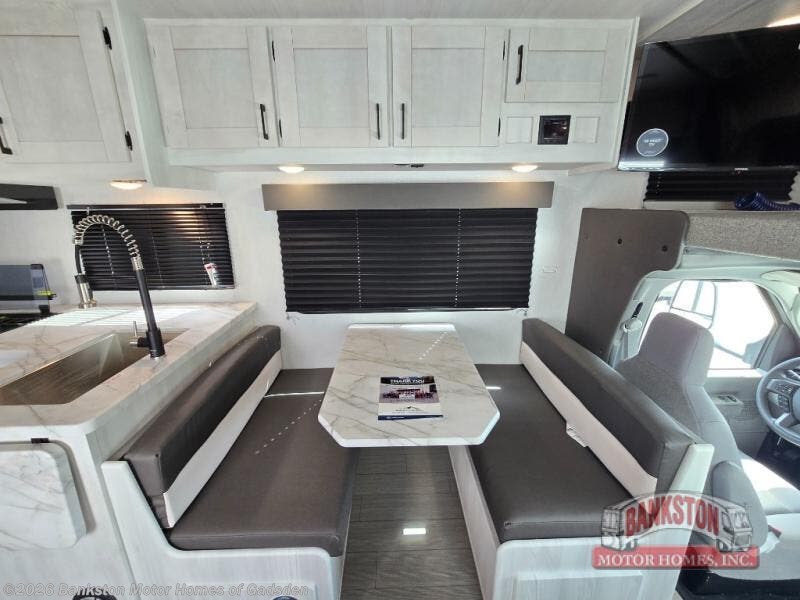 With any Entrada Class C gas motorhome from EAST TO WEST, the construction consists of a one-piece painted fiberglass front cap, a TPO roof membrane, and 2" Azdel composite sidewalls for added durability. There are rotocast exterior storage compartments with slam latch doors, along with an exterior LP Quick Connect, and a power awning with an LED light strip. You will also find rear and sideview cameras to help make maneuvering and parking your RV easier than ever. Inside, you'll feel right at home with soft close hardwood cabinet doors and drawers, a high-altitude tankless water heater, plus a 12V smart TV and USB ports to keep your electronics charged up!