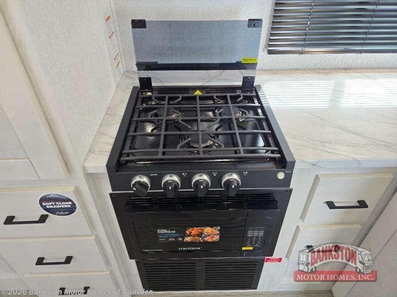 This coach is perfect for traveling with a friend or honey since there are two twin beds that can convert to a king-size bed if you choose! There is a 62" sofa and 42" x 68" booth dinette in the main living area that can double as seating and sleeping space, plus there is a bunk over cab for the little ones. Once you are fully rested, head to the kitchen to prepare a delicious breakfast feast with the convection microwave and cooktop. Use the double sink to clean up, and the 10.7-cubic foot refrigerator to keep your perishables fresh. You can even add some extra prep space to this area by using the countertop extension.