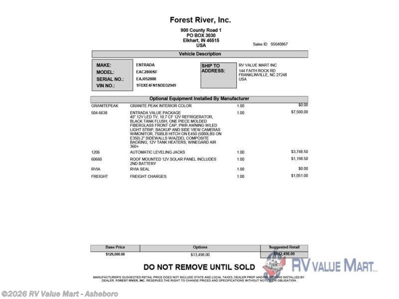 Request More Info on this 2026 East to West Entrada 2800S Offered for sale by RV Value Mart - Asheboro