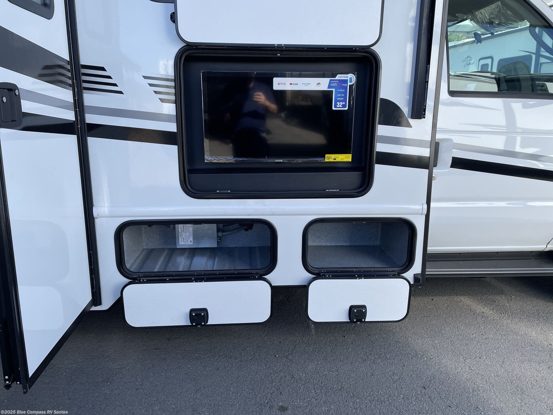 With any Entrada Class C gas motorhome from EAST TO WEST, the construction consists of a one-piece painted fiberglass front cap, a TPO roof membrane, and 2" Azdel composite sidewalls for added durability. There are rotocast exterior storage compartments with slam latch doors, along with an exterior LP Quick Connect, and a power awning with an LED light strip. You will also find rear and sideview cameras to help make maneuvering and parking your RV easier than ever. Inside, you'll feel right at home with soft close hardwood cabinet doors and drawers, a high-altitude tankless water heater, plus a 12V smart TV and USB ports to keep your electronics charged up!