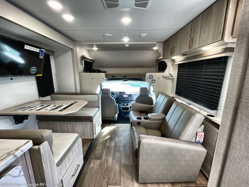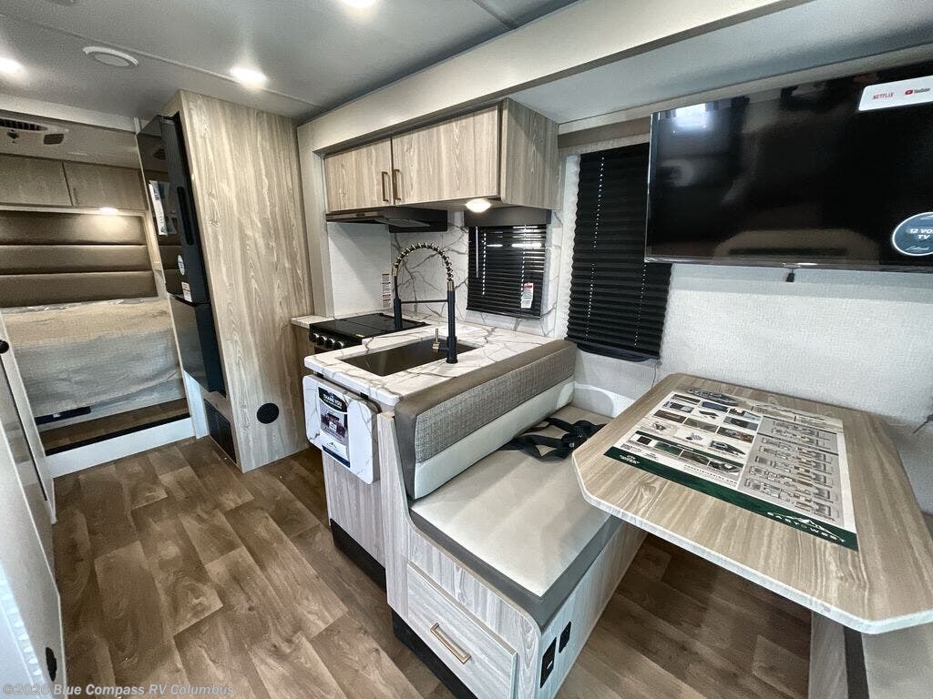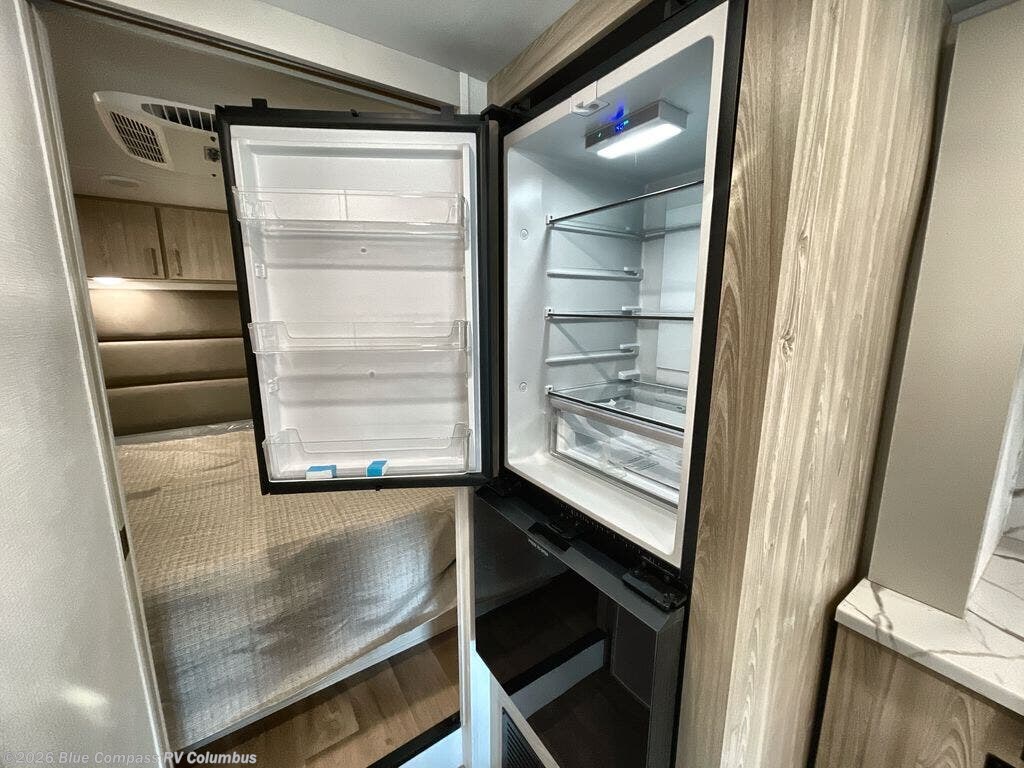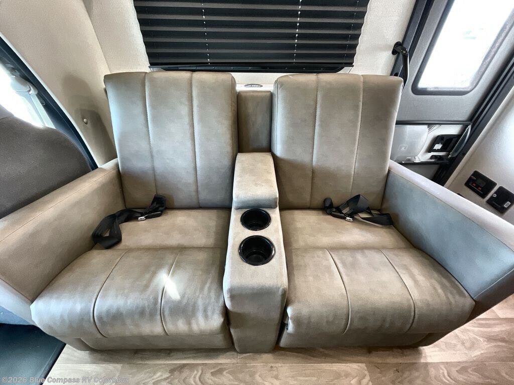 Comfort comes easy in this coach with theater seats and a slide out for more space! You'll find the booth dinette within the slide, along with the cooktop and convection microwave with air fryer technology. A double bowl sink will make clean up easier than ever, and there is a 12V dual swing refrigerator to keep your cold items fresh. The full bath with a 24" x 36" shower will let you clean up each day, and the rear private bedroom with a king bed is sure to provide a great night's rest! And any guests you may have can sleep on the 60" x 80" bunk-over cab or on the dinette once converted to sleeping space!