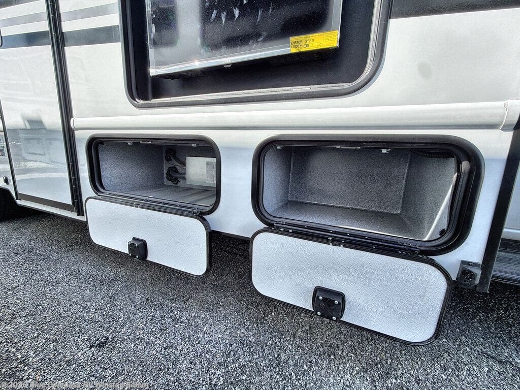 With any Entrada Class C gas motorhome from EAST TO WEST, the construction consists of a one-piece painted fiberglass front cap, a TPO roof membrane, and 2" Azdel composite sidewalls for added durability. There are rotocast exterior storage compartments with slam latch doors, along with an exterior LP Quick Connect, and a power awning with an LED light strip. You will also find rear and sideview cameras to help make maneuvering and parking your RV easier than ever. Inside, you'll feel right at home with soft close hardwood cabinet doors and drawers, a high-altitude tankless water heater, plus a 12V smart TV and USB ports to keep your electronics charged up!