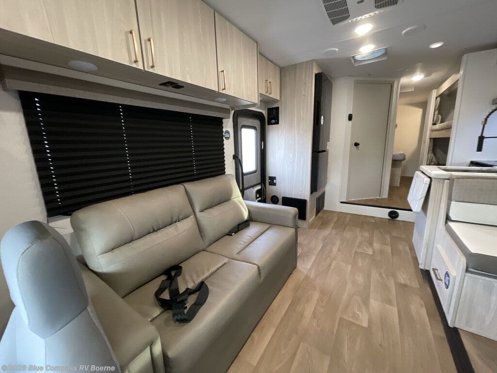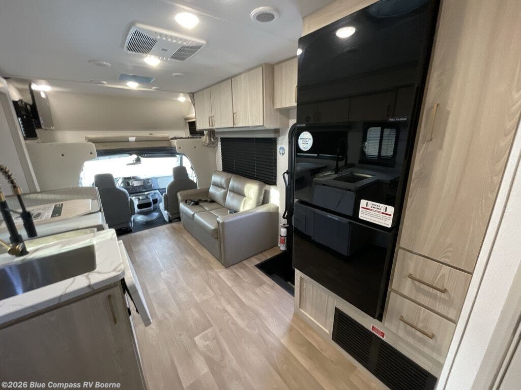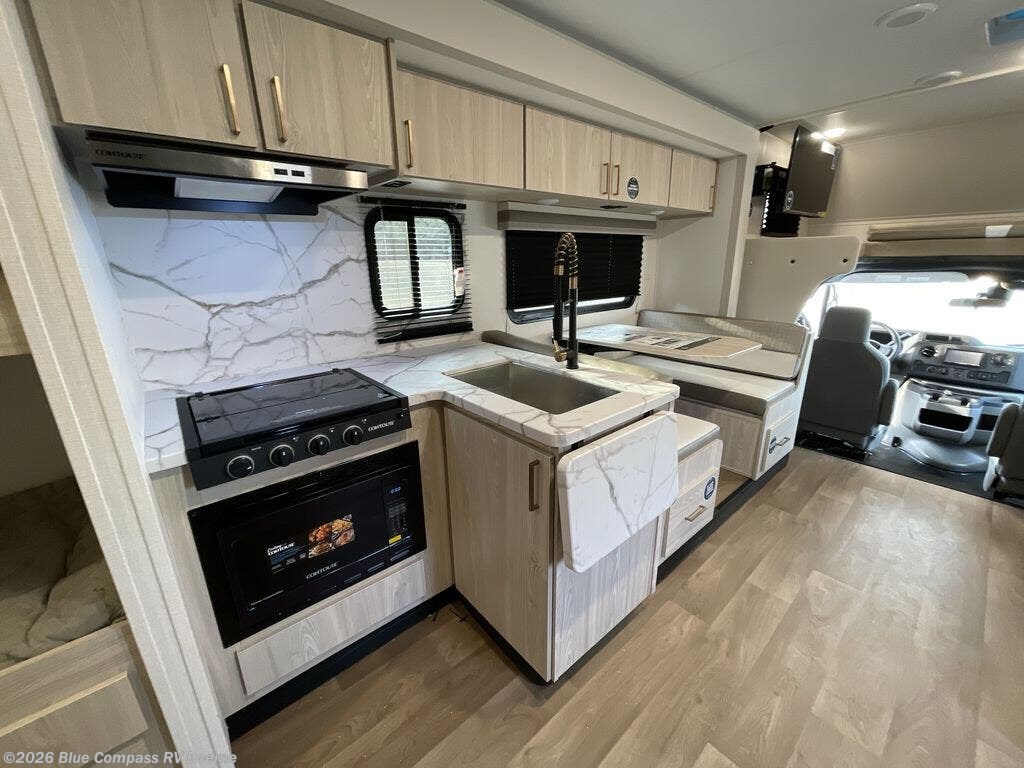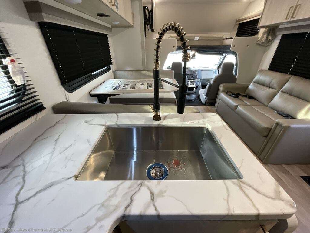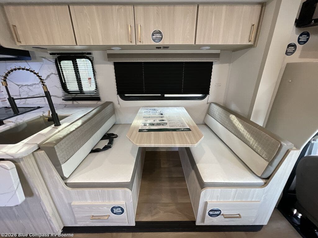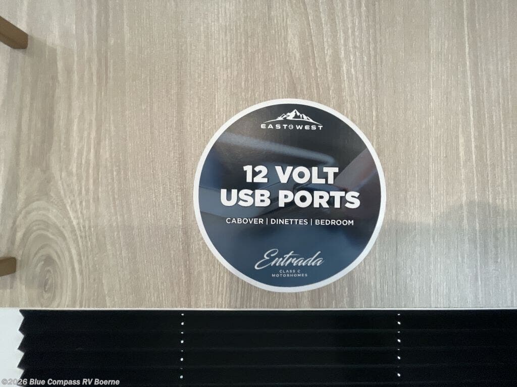 With any Entrada Class C gas motorhome from EAST TO WEST, the construction consists of a one-piece painted fiberglass front cap, a TPO roof membrane, and 2" Azdel composite sidewalls for added durability. There are rotocast exterior storage compartments with slam latch doors, along with an exterior LP Quick Connect, and a power awning with an LED light strip. You will also find rear and sideview cameras to help make maneuvering and parking your RV easier than ever. Inside, you'll feel right at home with soft close hardwood cabinet doors and drawers, a high-altitude tankless water heater, plus a 12V smart TV and USB ports to keep your electronics charged up!