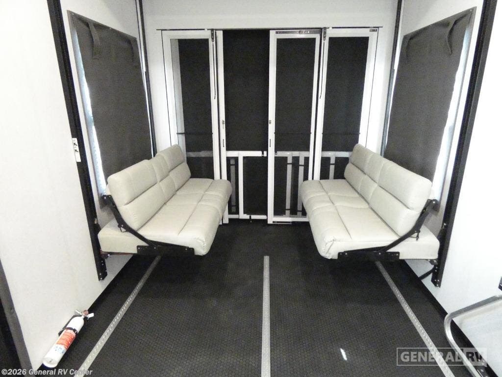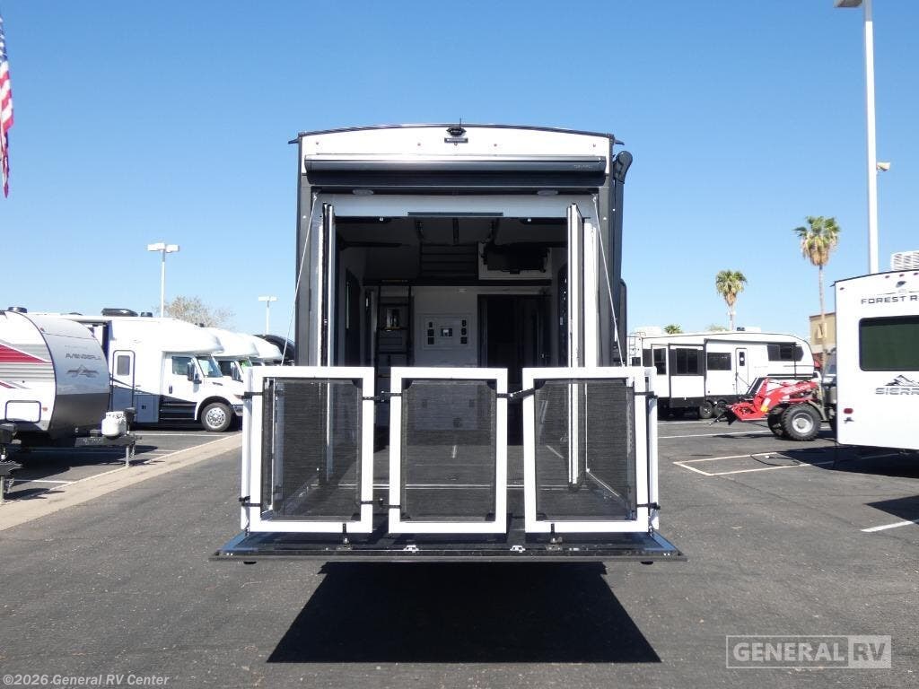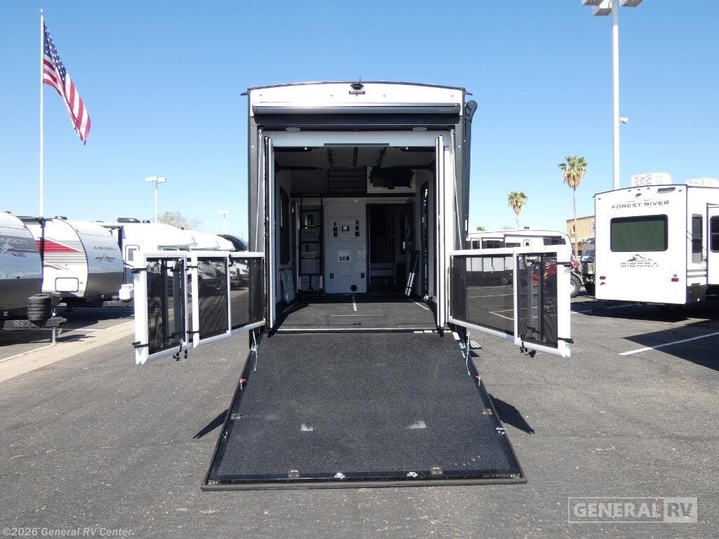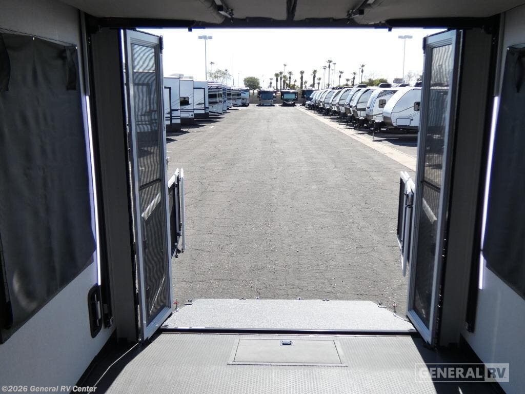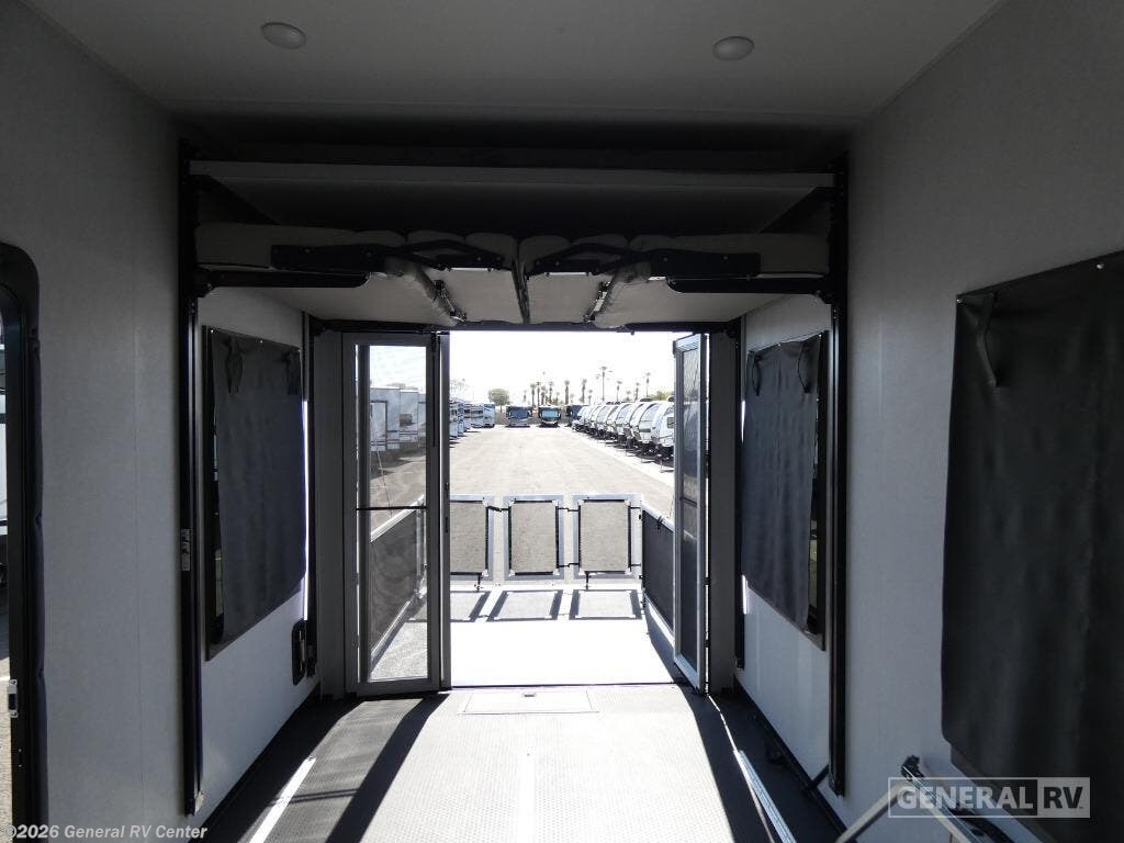EAST TO WEST Takoda toy hauler 400TH highlights: 16' Separate Garage 32" TV in Garage King Bed Slide Out Kitchen Pantry Garage In-Floor Storage Bath and a Half Countertop Extensions This toy hauler resembles the layout of model 350TH, but you'll enjoy a larger garage in this 400TH model to fit more toys and gear! Once your toys are unloaded from the separate garage, you can enjoy the 3-seasons door with tinted sliding windows and the rear deck system with an awning and steps. Your guests can sleep here at night since there is a drop-down queen bed, two happijac sofas, plus a loft with a ladder and a 28" x 70" mat. There is even a half bath here for convenience! The main living area will be a favorite place to visit together with its large sofa, 50" TV with a fireplace, and spacious kitchen island with two stools and countertop extensions. The chef of your group will also love the additional counter space and deep-seated stainless steel farmhouse sink, the GE Profile free-standing gas range and convection microwave/air fryer, plus the 16 cu. ft. 12V French door refrigerator with a double drawer freezer. Everyone can take turns cleaning up in the full bath towards the front, and you are sure to enjoy the front private bedroom all to yourselves. Here, you'll find a king bed slide out with bedside shelves and underbed storage, a dresser with a 32" TV, plus a front wardrobe and a wardrobe with washer/dryer prep! With any Takoda toy hauler fifth wheel by EAST TO WEST, you will be able to enjoy your RV for years to come thanks to the durable materials that includes Formaldehyde free fiberglass insulation in roof, front cap & main floor, and AzdelĀ® laminated sidewalls, slide-out end walls, slide-out roofs & rear wall w/ 2 lb. block foam insulation. You will love how easy it will be to bring your toys along with a 6000-watt NPS gas generator, two 30 gallon fuel tanks with a pump station, and a all weather ramp door, garage dovetail lockable storage box. The Comfort Package will bring you just that with a high-efficiency triple A/C system, a 40,000 BTU high-capacity furnace, 12V heat pads on holding tanks, and dual attics vents. The interior also includes solid surface kitchen countertops with flip-up extensions & solid surface bathroom vanities, day and night Slow Rise roller shades, plus a 30" over-the-range convection microwave for easy cooking!