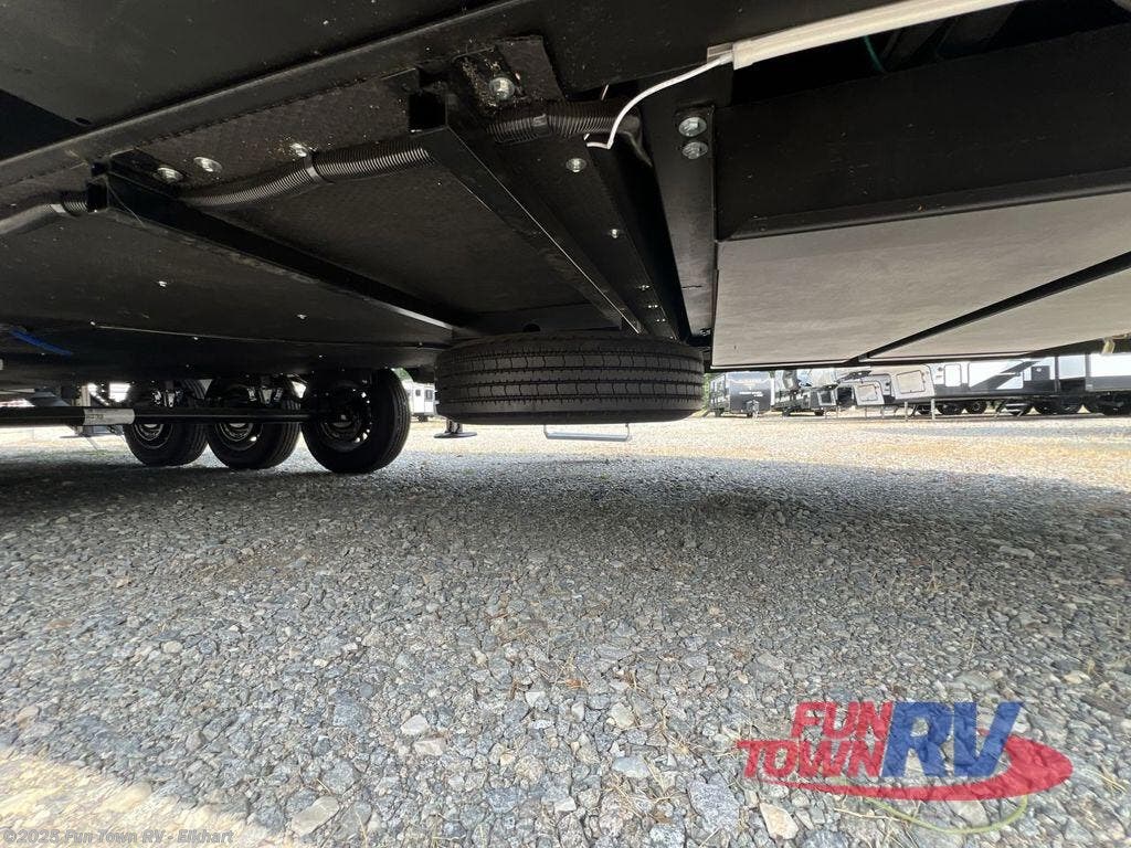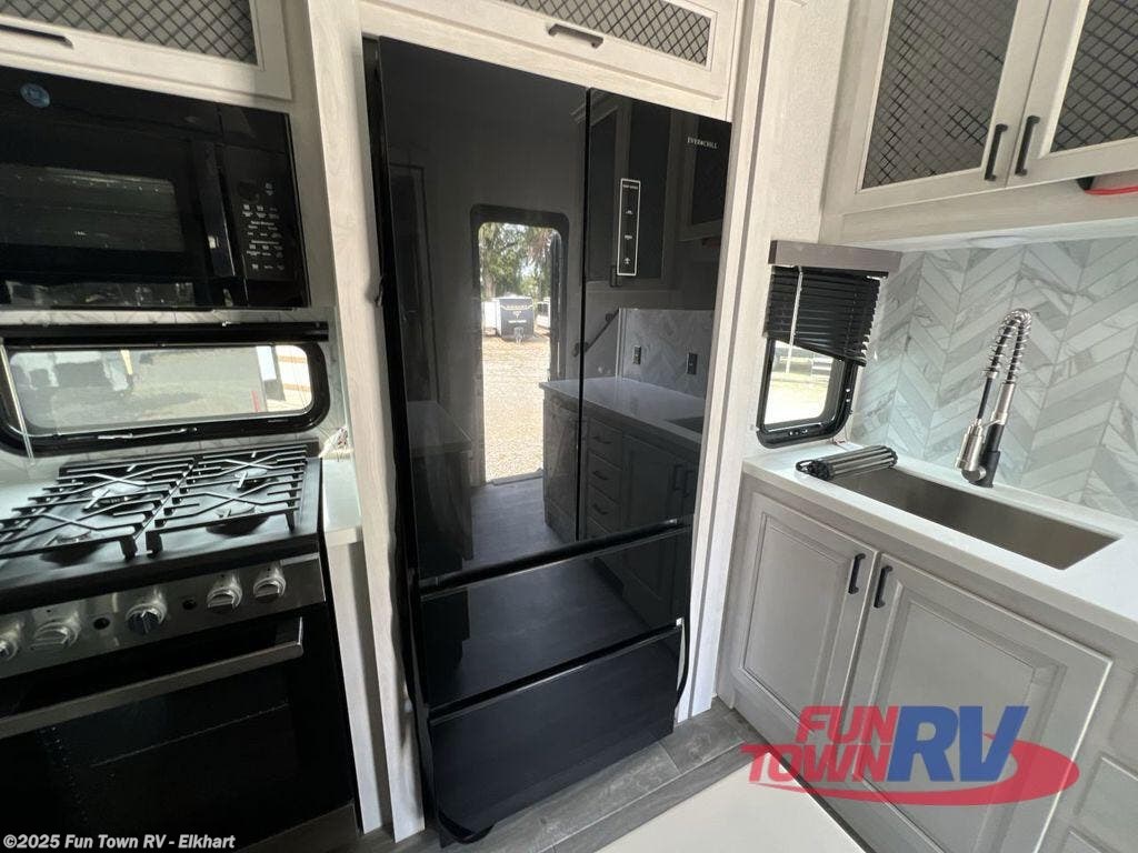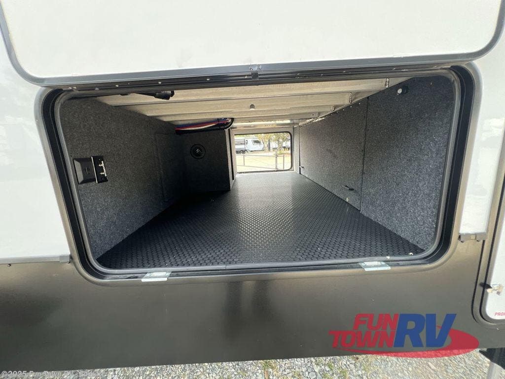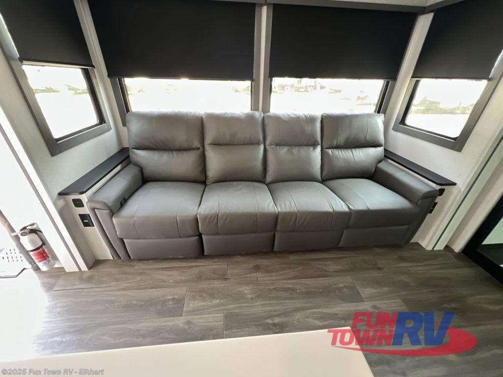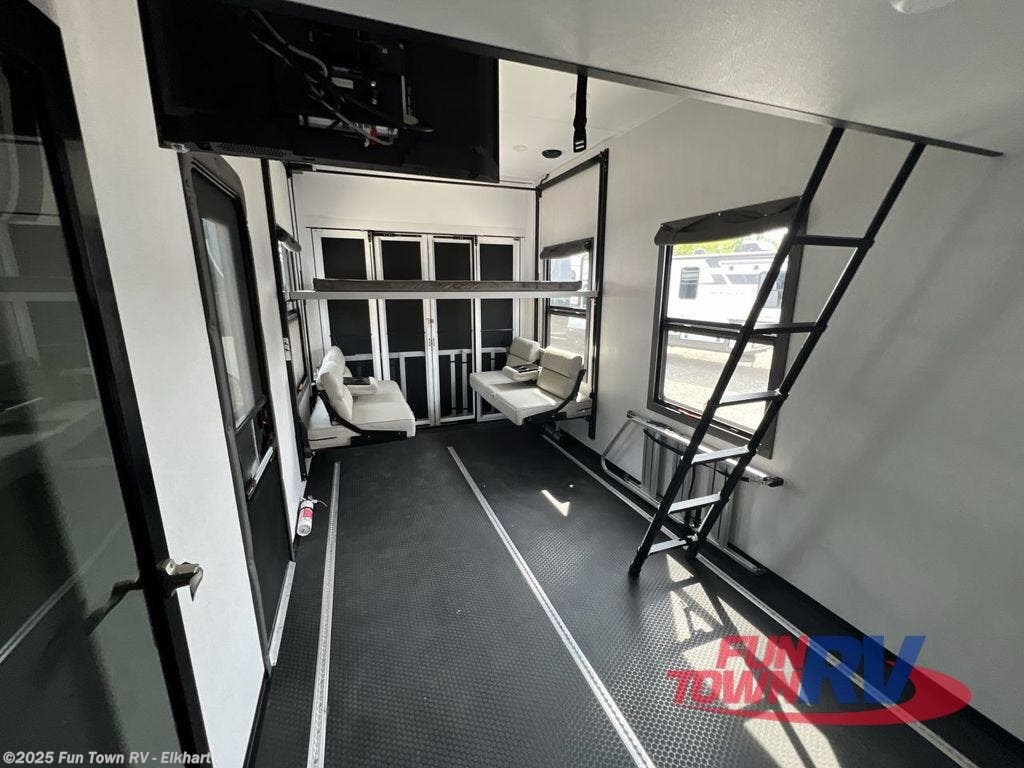This toy hauler resembles the layout of model 350TH, but you'll enjoy a larger garage in this 400TH model to fit more toys and gear! Once your toys are unloaded from the separate garage, you can enjoy the 3-seasons door with tinted sliding windows and the rear deck system with an awning and steps. Your guests can sleep here at night since there is a drop-down queen bed, two happijac sofas, plus a loft with a ladder and a 28" x 70" mat. There is even a half bath here for convenience! The main living area will be a favorite place to visit together with its large sofa, 50" TV with a fireplace, and spacious kitchen island with two stools and countertop extensions. The chef of your group will also love the additional counter space and deep-seated stainless steel farmhouse sink, the GE Profile free-standing gas range and convection microwave/air fryer, plus the 16 cu. ft. 12V French door refrigerator with a double drawer freezer. Everyone can take turns cleaning up in the full bath towards the front, and you are sure to enjoy the front private bedroom all to yourselves. Here, you'll find a king bed slide out with bedside shelves and underbed storage, a dresser with a 32" TV, plus a front wardrobe and a wardrobe with washer/dryer prep!