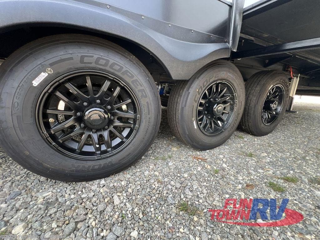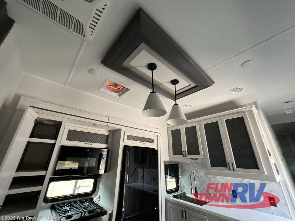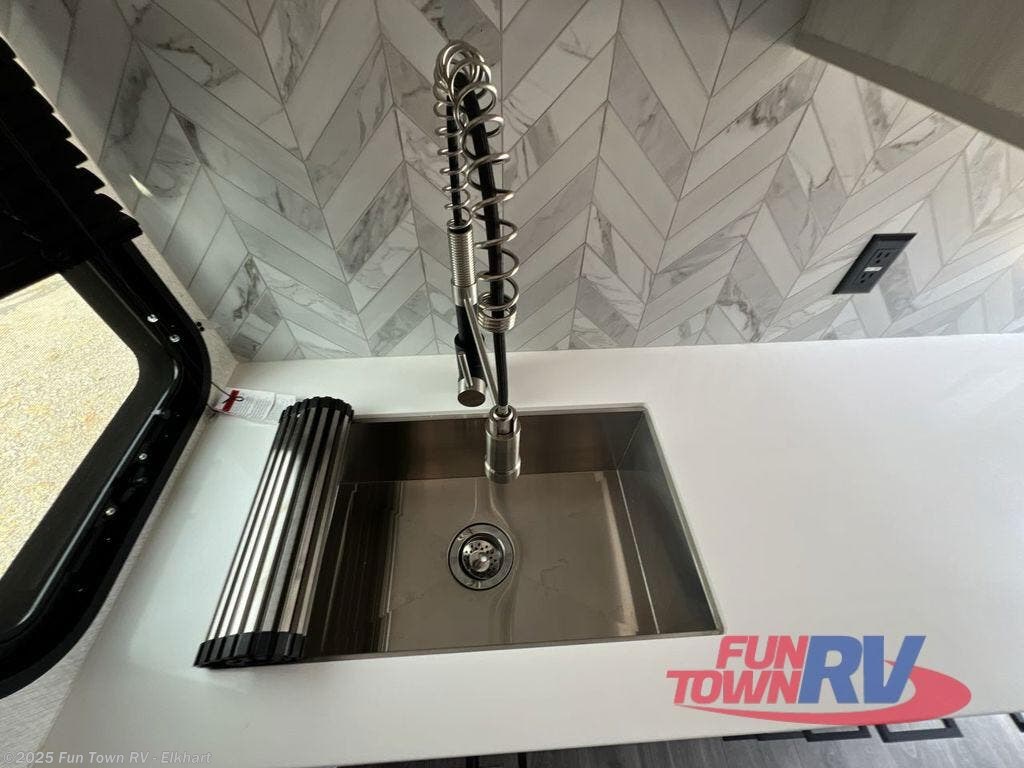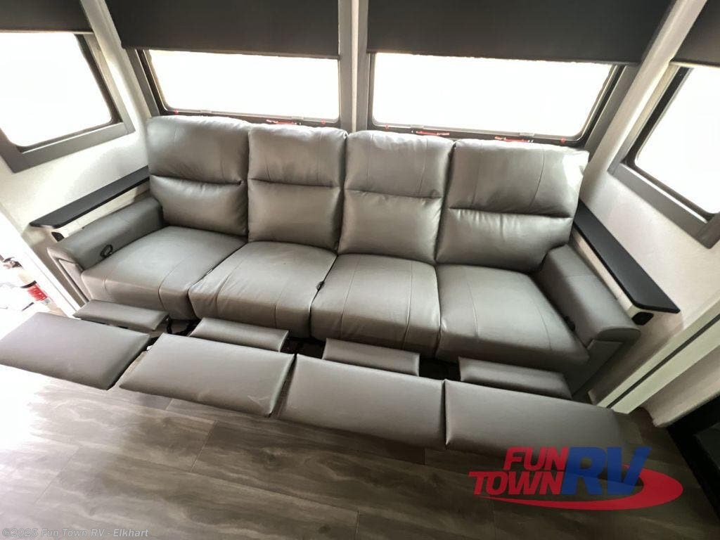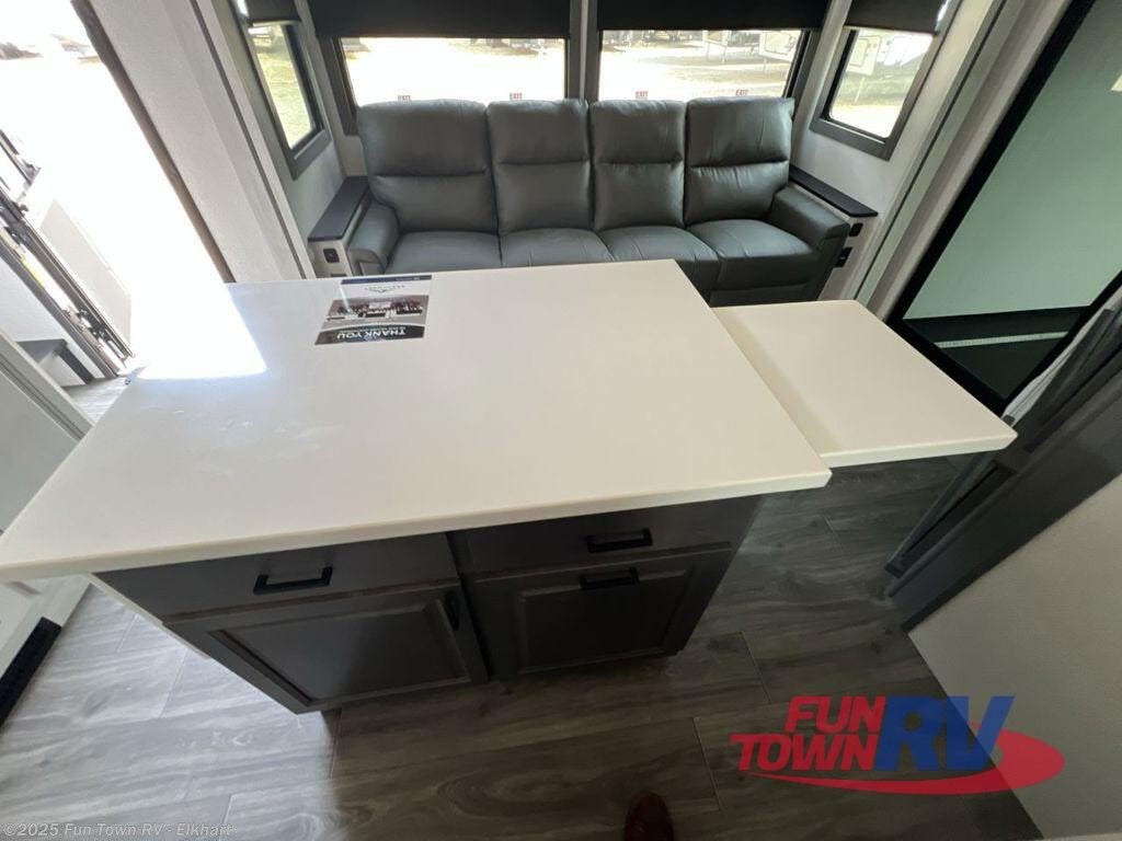 This toy hauler resembles the layout of model 350TH, but you'll enjoy a larger garage in this 400TH model to fit more toys and gear! Once your toys are unloaded from the separate garage, you can enjoy the 3-seasons door with tinted sliding windows and the rear deck system with an awning and steps. Your guests can sleep here at night since there is a drop-down queen bed, two happijac sofas, plus a loft with a ladder and a 28" x 70" mat. There is even a half bath here for convenience! The main living area will be a favorite place to visit together with its large sofa, 50" TV with a fireplace, and spacious kitchen island with two stools and countertop extensions. The chef of your group will also love the additional counter space and deep-seated stainless steel farmhouse sink, the GE Profile free-standing gas range and convection microwave/air fryer, plus the 16 cu. ft. 12V French door refrigerator with a double drawer freezer. Everyone can take turns cleaning up in the full bath towards the front, and you are sure to enjoy the front private bedroom all to yourselves. Here, you'll find a king bed slide out with bedside shelves and underbed storage, a dresser with a 32" TV, plus a front wardrobe and a wardrobe with washer/dryer prep!