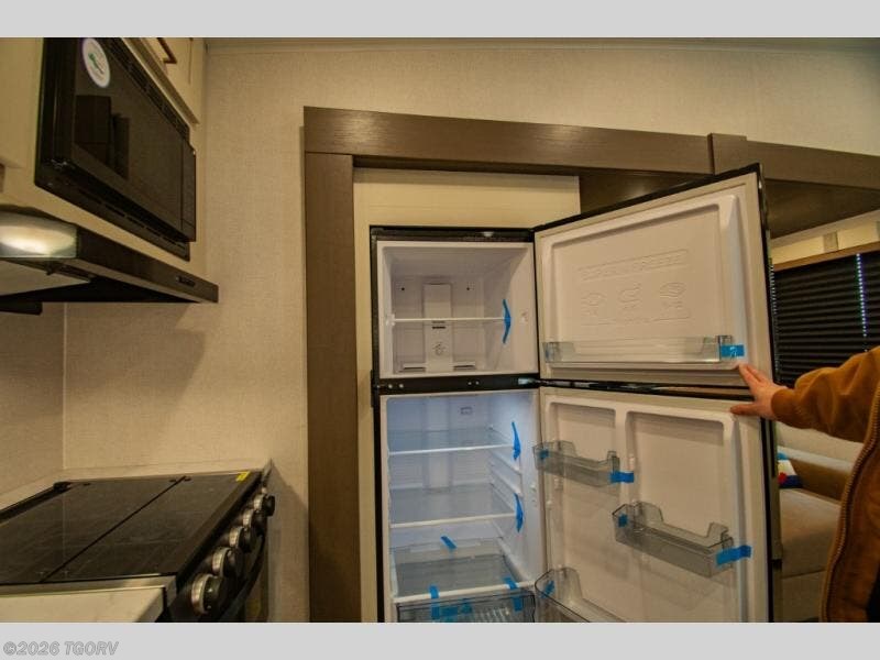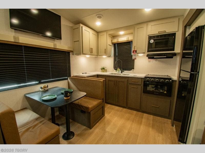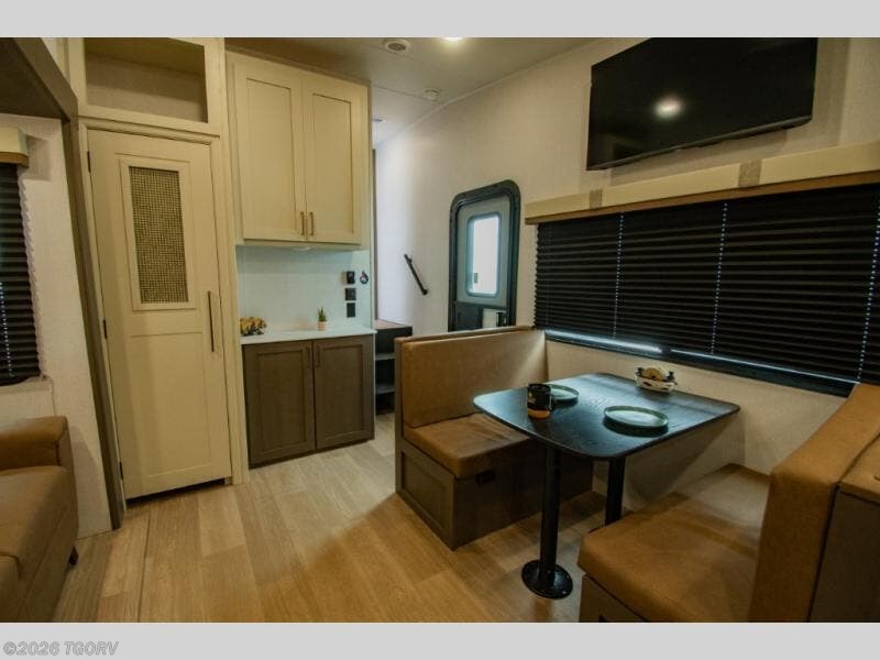 Perfect for couples or small families, this lightweight fifth wheel offers a functional rear kitchen with a range, sink, overhead storage, and a 12V refrigerator to keep your essentials fresh. The booth dinette provides a cozy place to dine, while the hide-a-bed sofa adds extra sleeping space for guests.