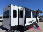 Enjoy luxury camping trips in this triple slide out fifth wheel! Once you've unloaded your gear, you can make lunch on the four burner 24" range, and the chef is sure to appreciate the kitchen island for more counter space. Your crew can dine at the free-standing dinette and relax on the theater seating across from the 50" TV and fireplace. There is also a hidden pantry behind the TV, and the queen bed hide-a-bed sofa will provide a place for guests to sleep! You'll find your own space up front in the private bedroom, complete with a king bed slide out with storage underneath, a dresser, plus a front wardrobe and stackable washer/dryer prep!
