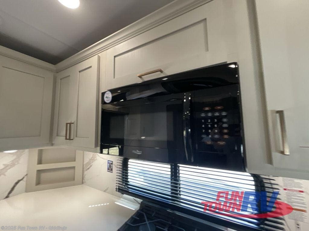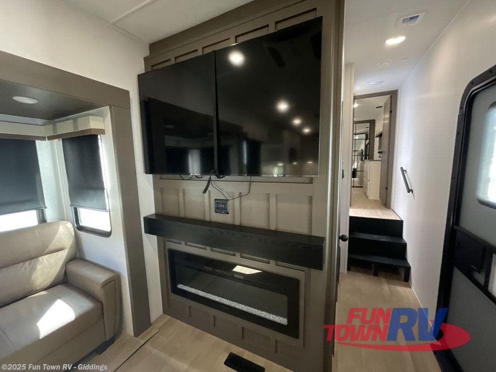 It won't be hard to find comfort and convenience in this spacious fifth wheel! The rear kitchen features ample counter space, a four burner 24" range, plus a 16 cu. ft. 12V refrigerator and pantry for food storage. There is also a desk here if you plan to work while you're away from home, and the coffee station by the pantry will be the perfect place to set up your own Keurig machine. The middle living area includes theater seating across from the 65" TV and fireplace, and there is a hide-a-bed sofa for guests to sleep on. A convenient utility room includes a sink with counter space plus stackable washer/dryer prep to make this an optional laundry room! A full bath will let you freshen up each day, and the front private bedroom will feel just like home with its king bed slide out, dresser and full-width wardrobe!