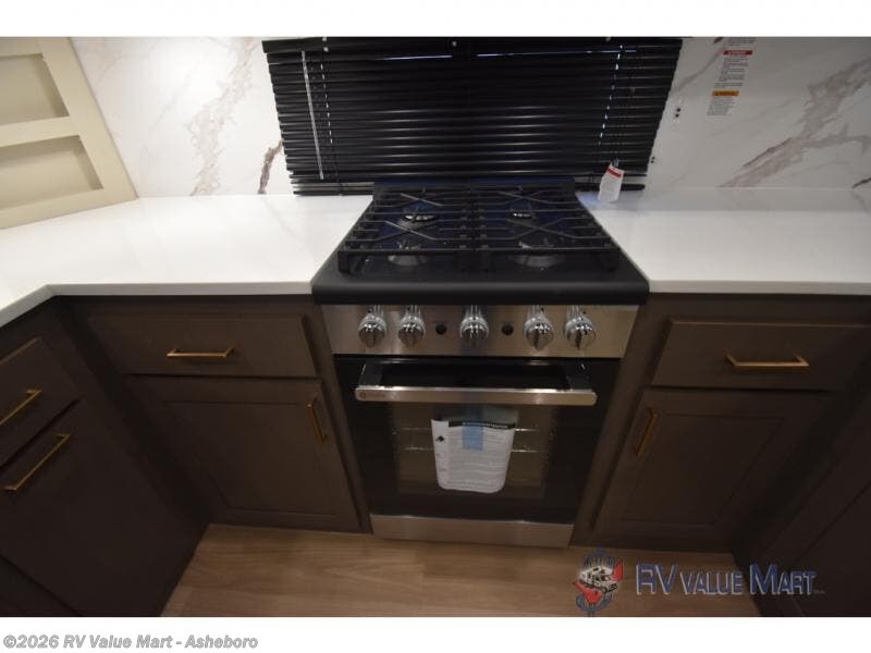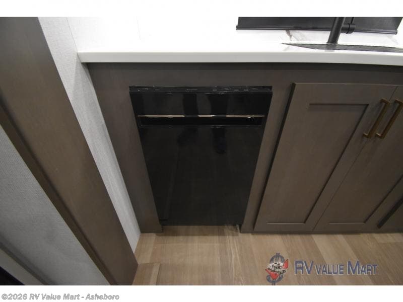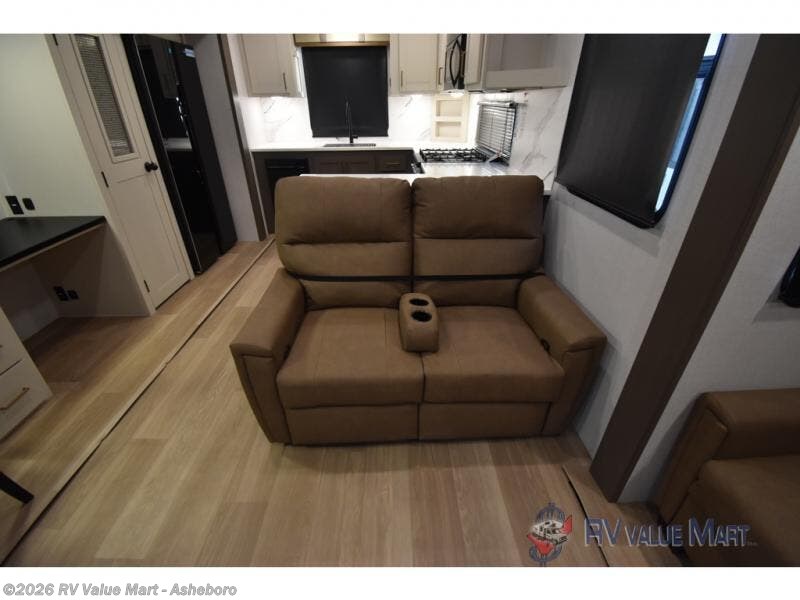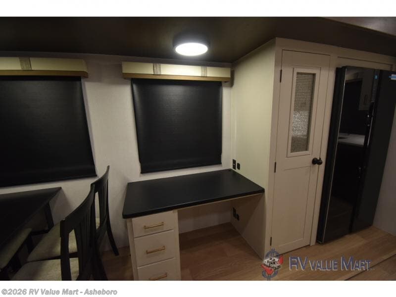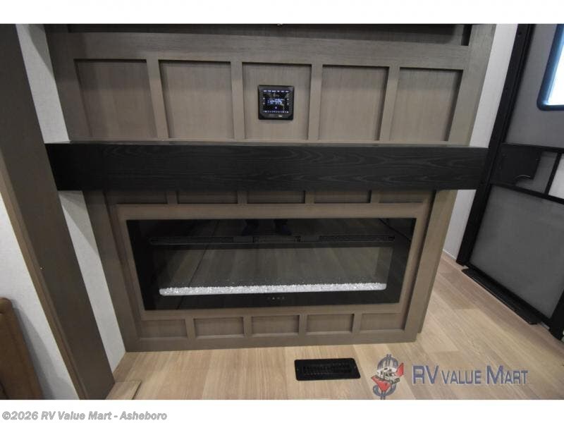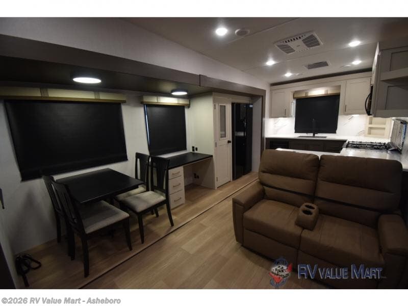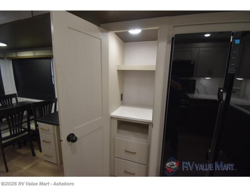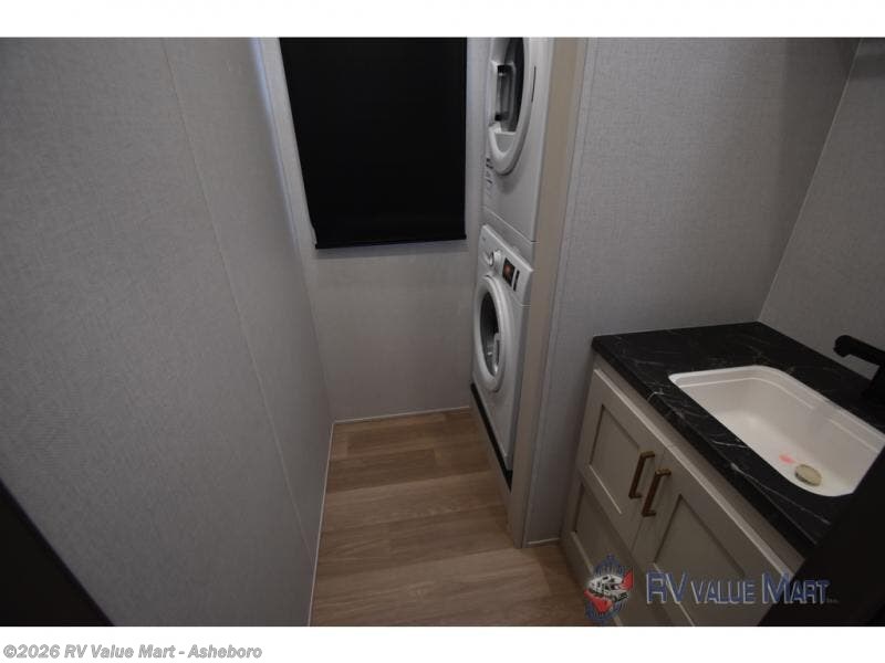 It won't be hard to find comfort and convenience in this spacious fifth wheel! The rear kitchen features ample counter space, a four burner 24" range, plus a 16 cu. ft. 12V refrigerator and pantry for food storage. There is also a desk here if you plan to work while you're away from home, and the coffee station by the pantry will be the perfect place to set up your own Keurig machine. The middle living area includes theater seating across from the 65" TV and fireplace, and there is a hide-a-bed sofa for guests to sleep on. A convenient utility room includes a sink with counter space plus stackable washer/dryer prep to make this an optional laundry room! A full bath will let you freshen up each day, and the front private bedroom will feel just like home with its king bed slide out, dresser and full-width wardrobe!