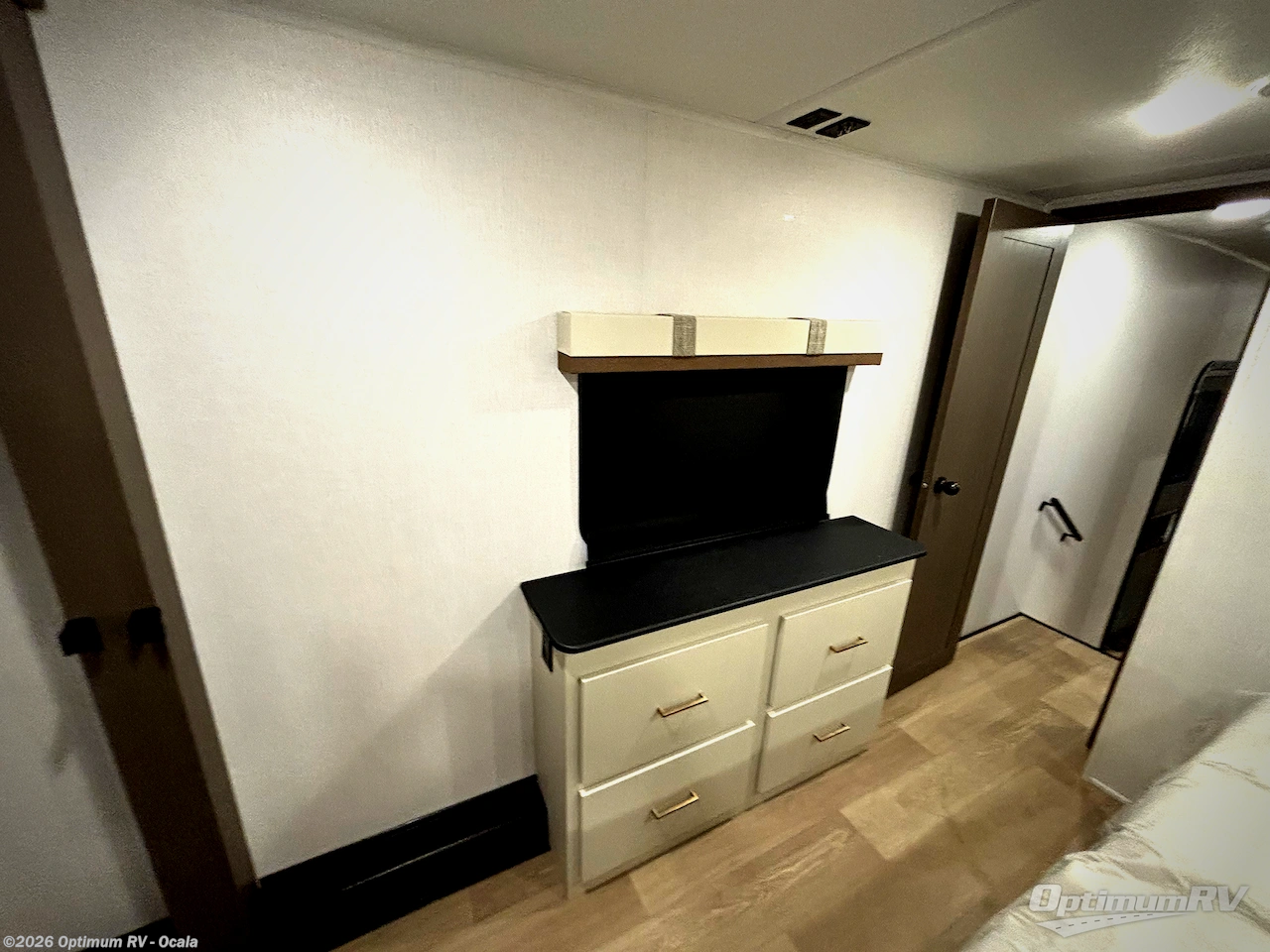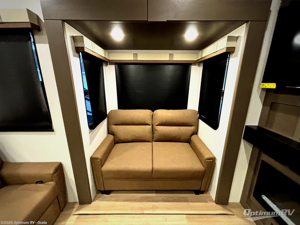 It won't be hard to find comfort and convenience in this spacious fifth wheel! The rear kitchen features ample counter space, a four burner 24" range, plus a 16 cu. ft. 12V refrigerator and pantry for food storage. There is also a desk here if you plan to work while you're away from home, and the coffee station by the pantry will be the perfect place to set up your own Keurig machine. The middle living area includes theater seating across from the 65" TV and fireplace, and there is a hide-a-bed sofa for guests to sleep on. A convenient utility room includes a sink with counter space plus stackable washer/dryer prep to make this an optional laundry room! A full bath will let you freshen up each day, and the front private bedroom will feel just like home with its king bed slide out, dresser and full-width wardrobe!