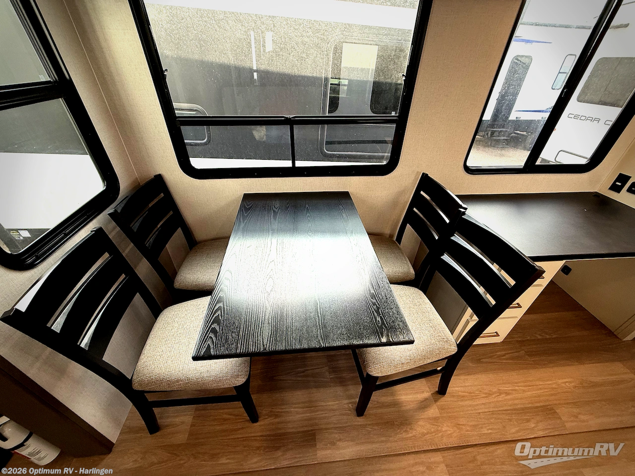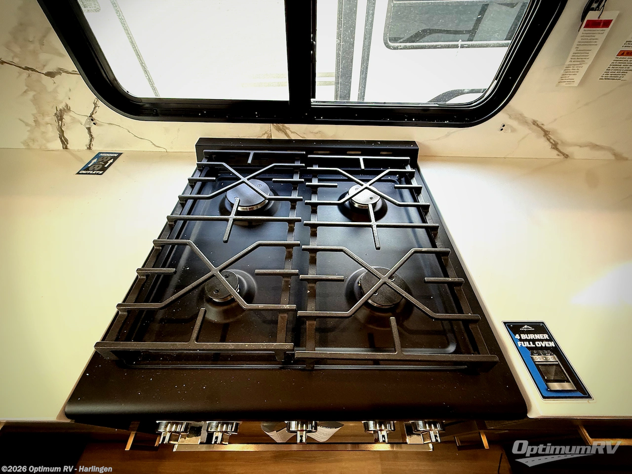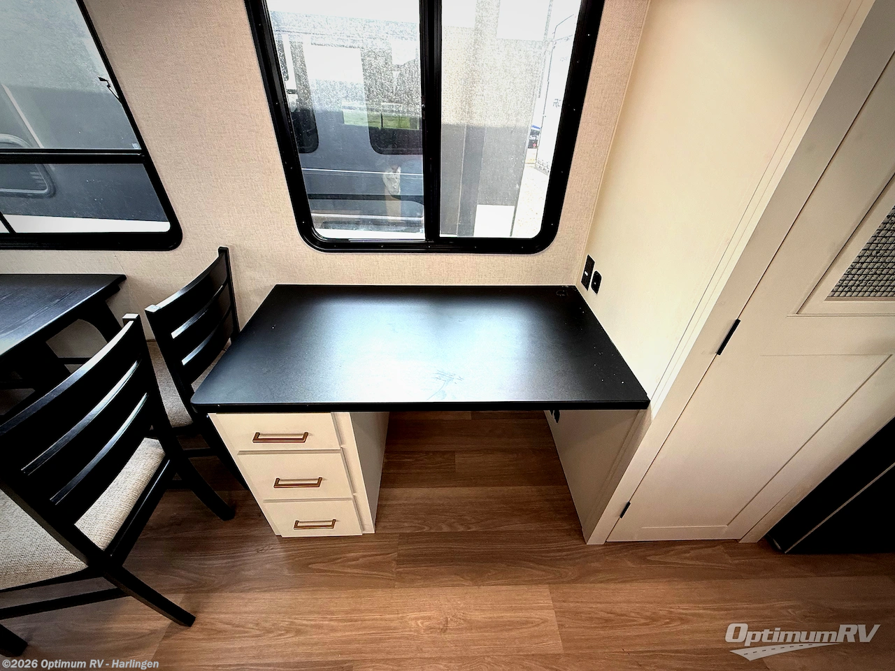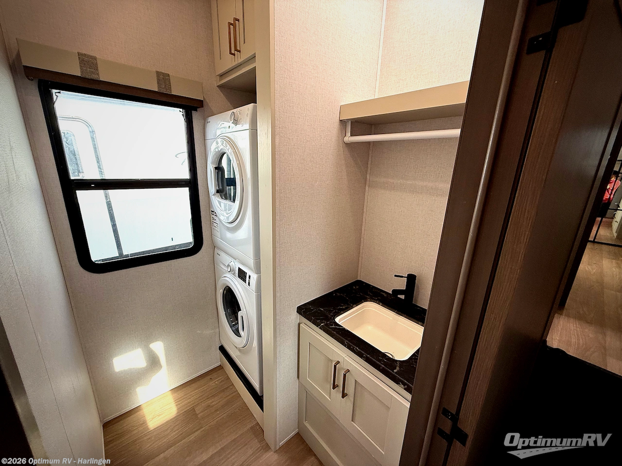 It won't be hard to find comfort and convenience in this spacious fifth wheel! The rear kitchen features ample counter space, a four burner 24" range, plus a 16 cu. ft. 12V refrigerator and pantry for food storage. There is also a desk here if you plan to work while you're away from home, and the coffee station by the pantry will be the perfect place to set up your own Keurig machine. The middle living area includes theater seating across from the 65" TV and fireplace, and there is a hide-a-bed sofa for guests to sleep on. A convenient utility room includes a sink with counter space plus stackable washer/dryer prep to make this an optional laundry room! A full bath will let you freshen up each day, and the front private bedroom will feel just like home with its king bed slide out, dresser and full-width wardrobe!