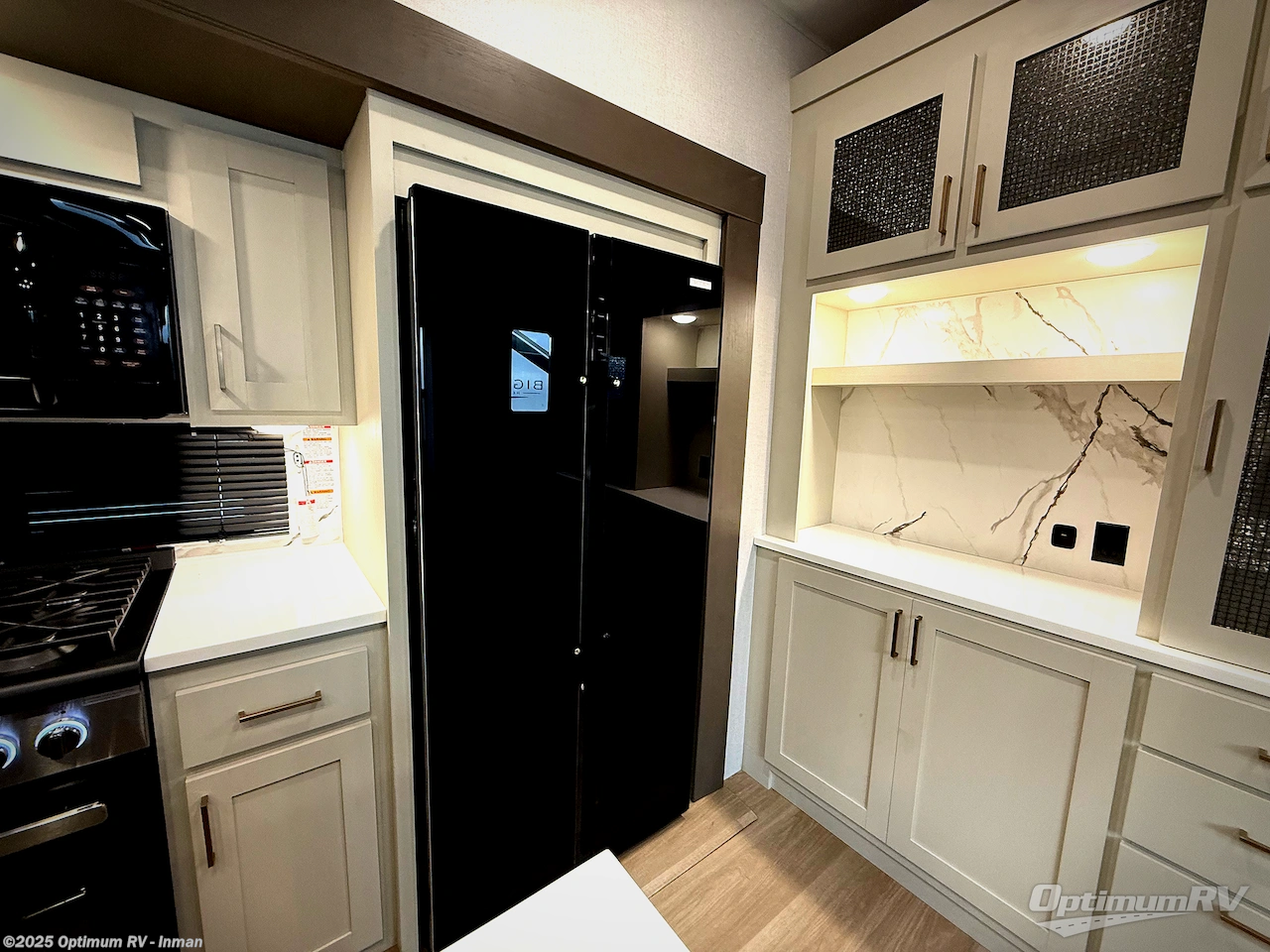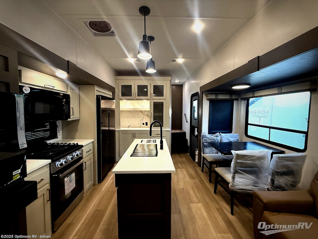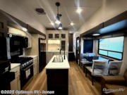This is the perfect fifth wheel if you enjoy bringing along extra friends and family! You'll have the front private bedroom all to yourselves with a king bed slide out, a dresser with TV prep, plus a large front wardrobe and stackable washer/dryer prep. And a full bath is right next door for easy use. Your guests will love the rear den suite with a power tilt queen bed slide and a desk with a chair. There is also a full rear bath with its own exterior entry door and a loft area for even more sleeping or storage space. In the morning, you can all meet in the combined kitchen and living area that includes dual opposing slides for more space, a kitchen island, and a hutch for additional storage. There is also theater seating in direct view of the 50" TV and fireplace, along with a dinette with four chairs where you can dine together.