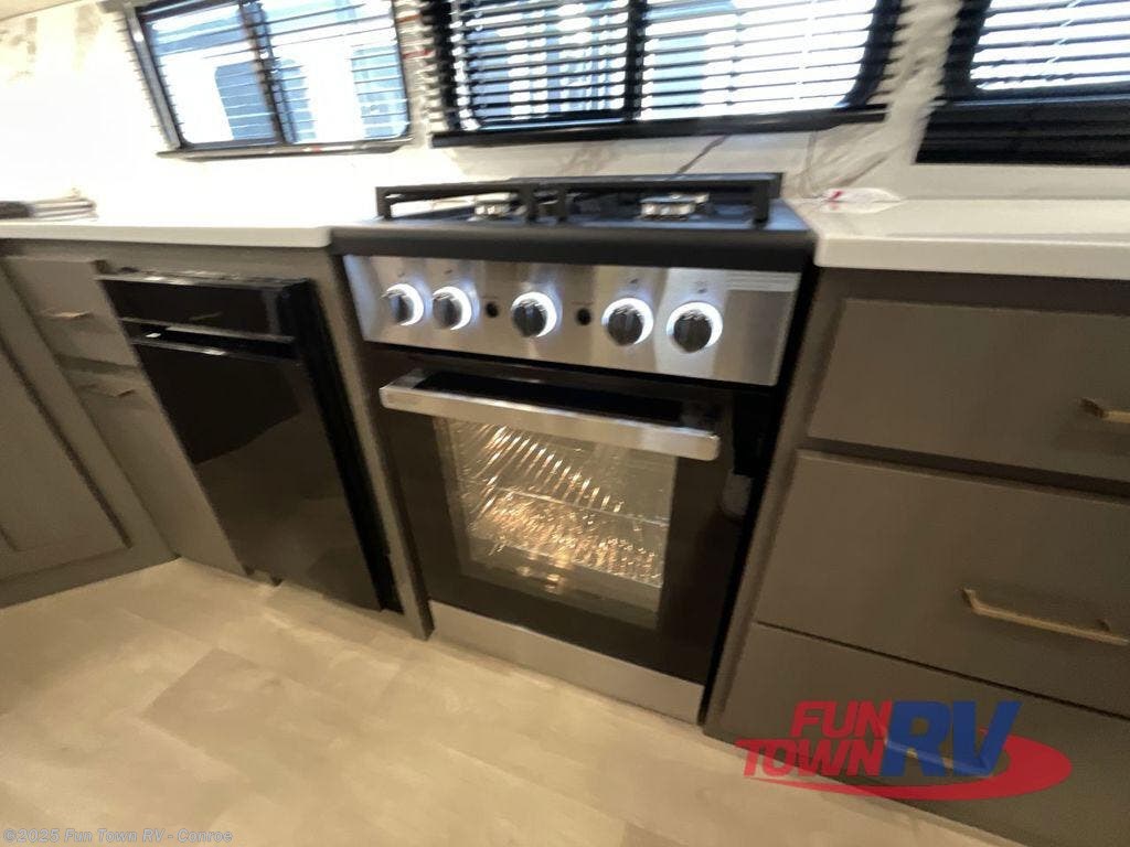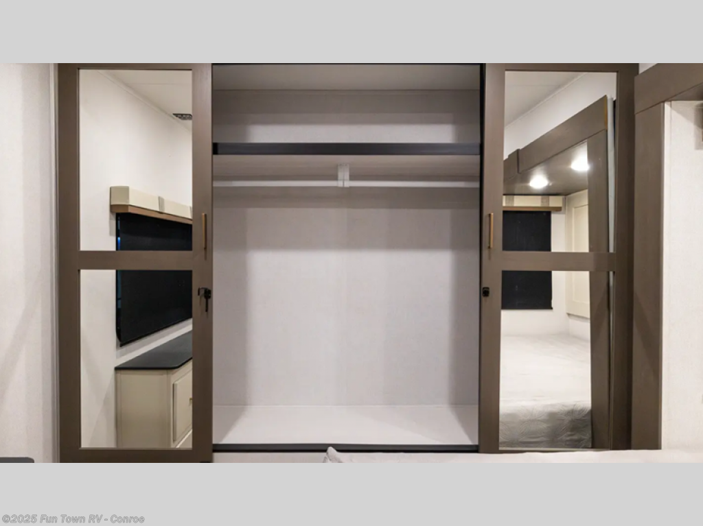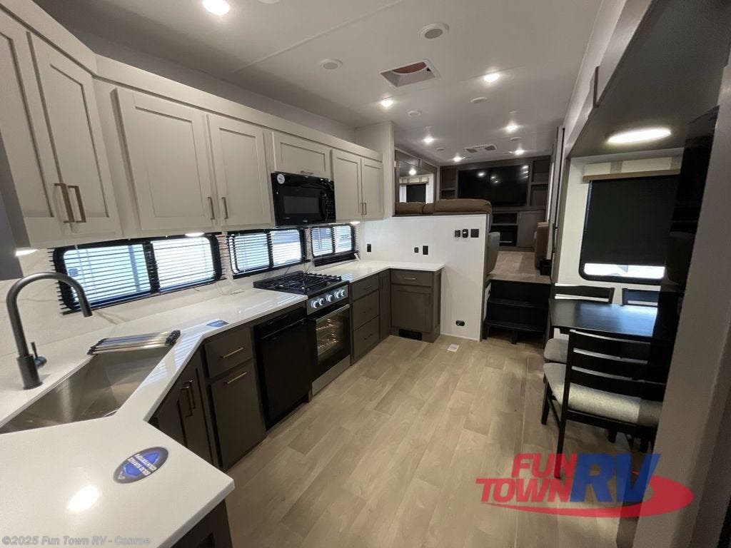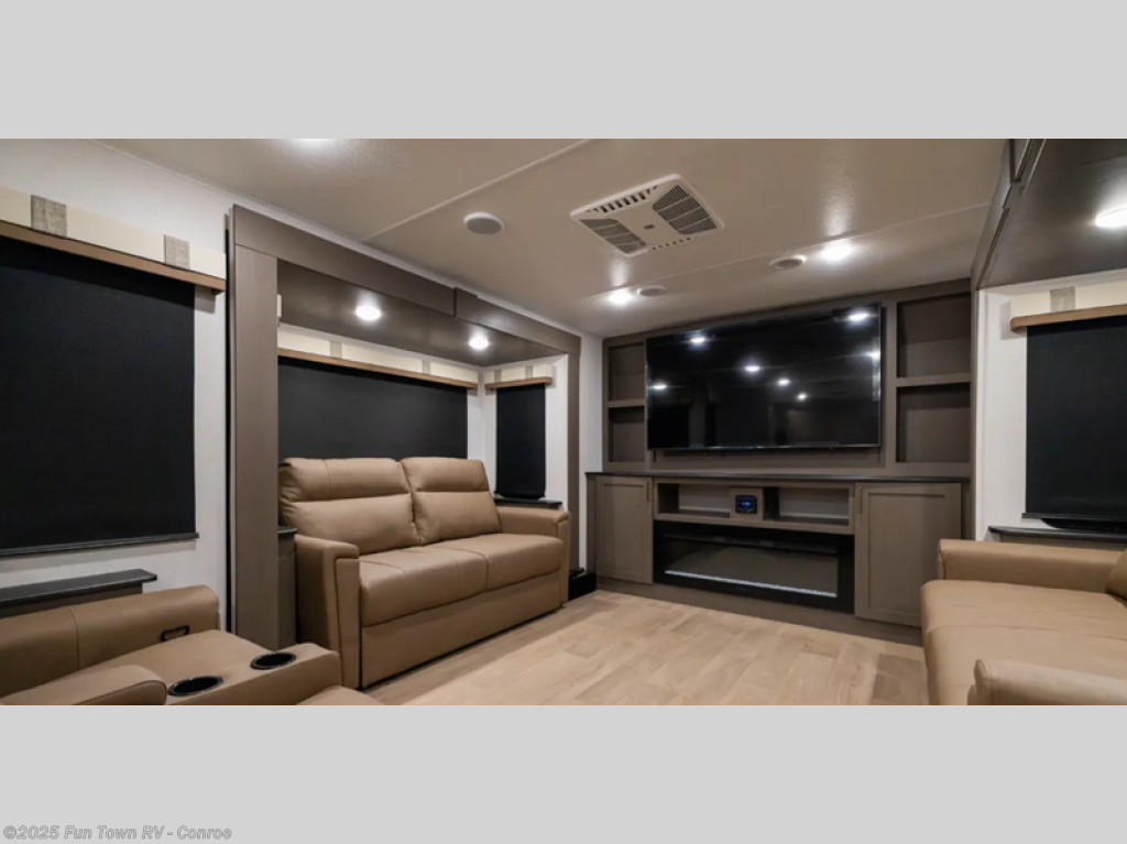 You'll always have a good time in this quad slide out fifth wheel! The front living area will be a favorite hang-out spot with its dual opposing queen bed hide-a-bed sofa slides, along with theater seating across from a 65" TV and fireplace. Your guests can transform this space into their bedroom at night, while you take the rear private bedroom with a king bed slide out, a dresser, and full-width wardrobe. A full bath will let you clean up every day, and the middle kitchen features ample counter space to prep meals. There is also a free-standing dinette where you can dine together, or you can take your plate outdoors to sit under the two power awnings!