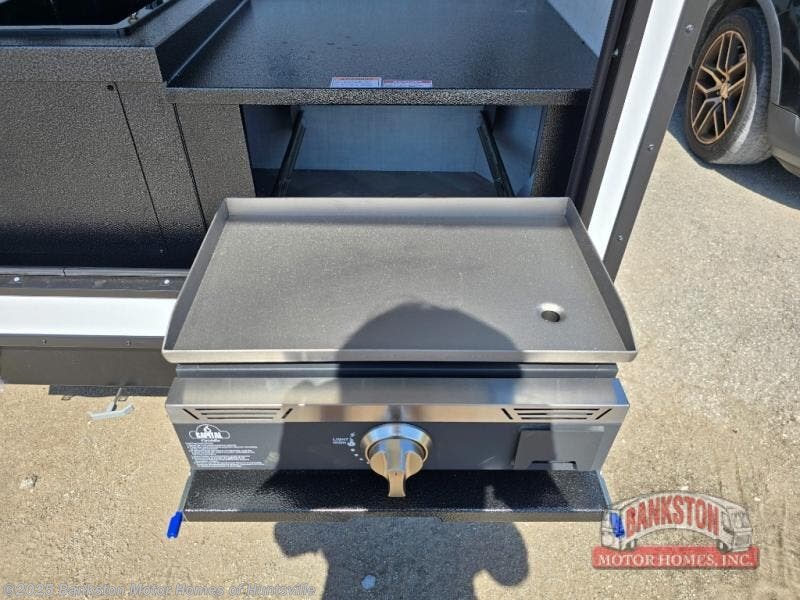 This compact travel trailer is easy to tow and easy to love! There are fender steps so that you can reach the top of your unit, which will especially be helpful if you choose to add the optional Thule roof rack system. You will also find a 6.5" manual awning outside or you can choose the optional batwing awning. The rear kitchen includes a griddle which attaches to the LP Quick Connect, a sink, plus an overhead shelf for food storage. An optional 1.7 cu. ft. refrigerator can be added for even more convenience. Inside, you'll enjoy the dual 28" x 84" mattresses with a converted 56" x 84" "California Queen" sleeping space for a great night's rest. There are also front overhead shelves with shelving below plus floor to ceiling shelves in the back so nothing gets left behind.