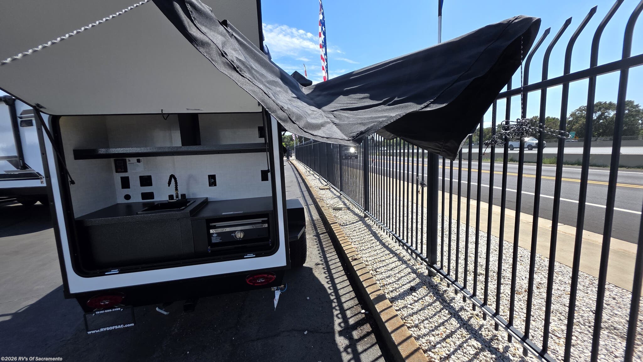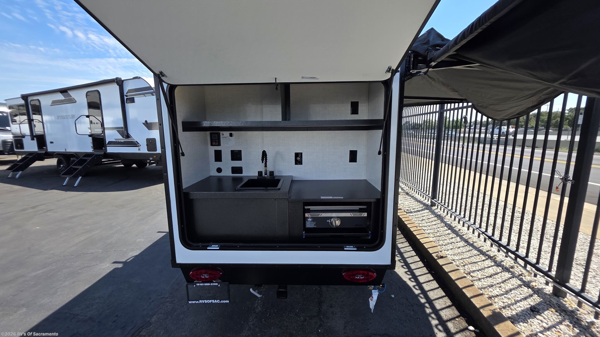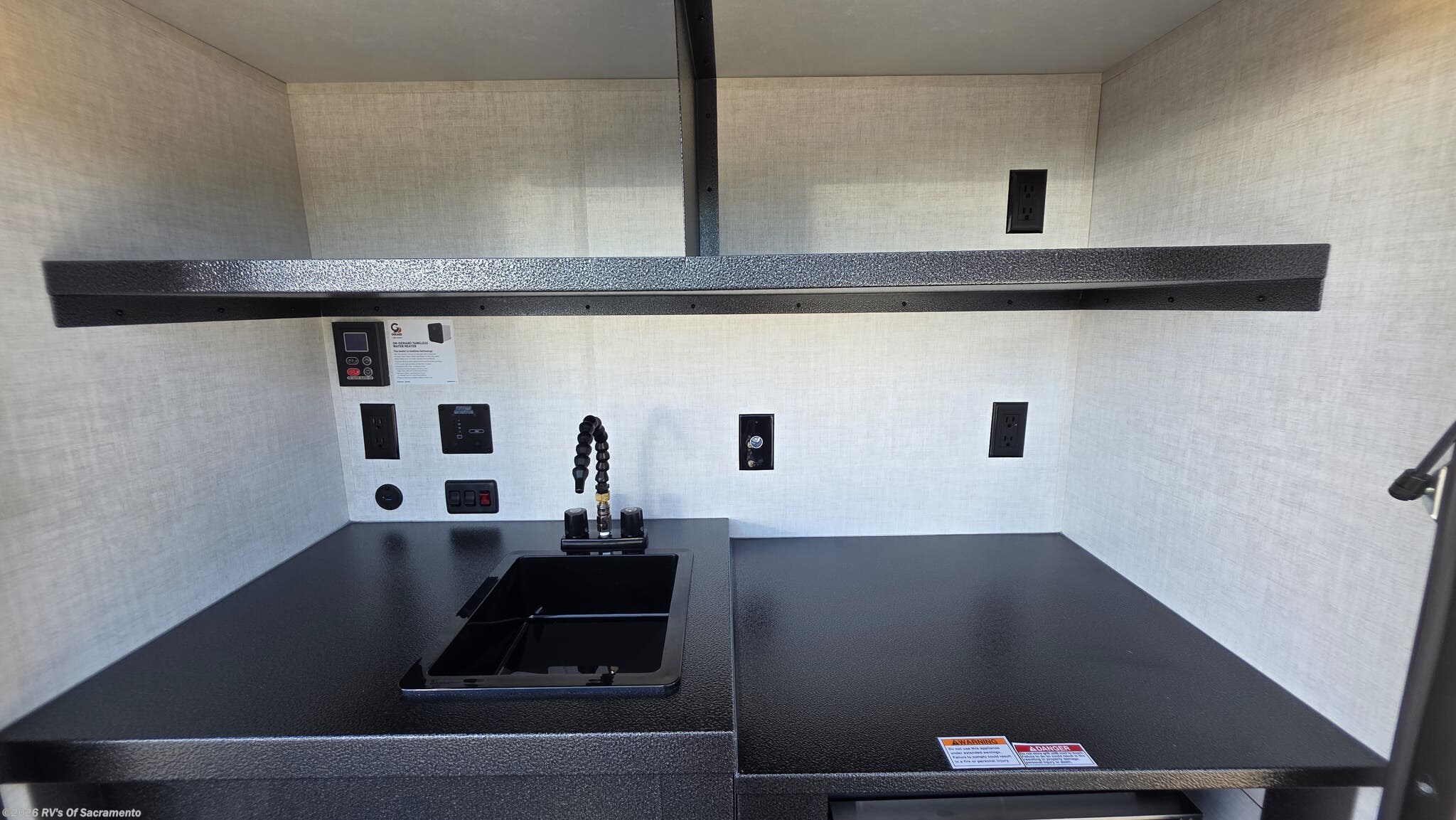Inside, two 28? x 84? mattresses convert into a spacious California queen, perfect for solo travelers or couples. Storage cubbies, shelves, and LED lighting make smart use of every inch, while outside you’ll find a rear outdoor kitchen complete with a sink, LP quick-connect for a griddle, and optional fridge.