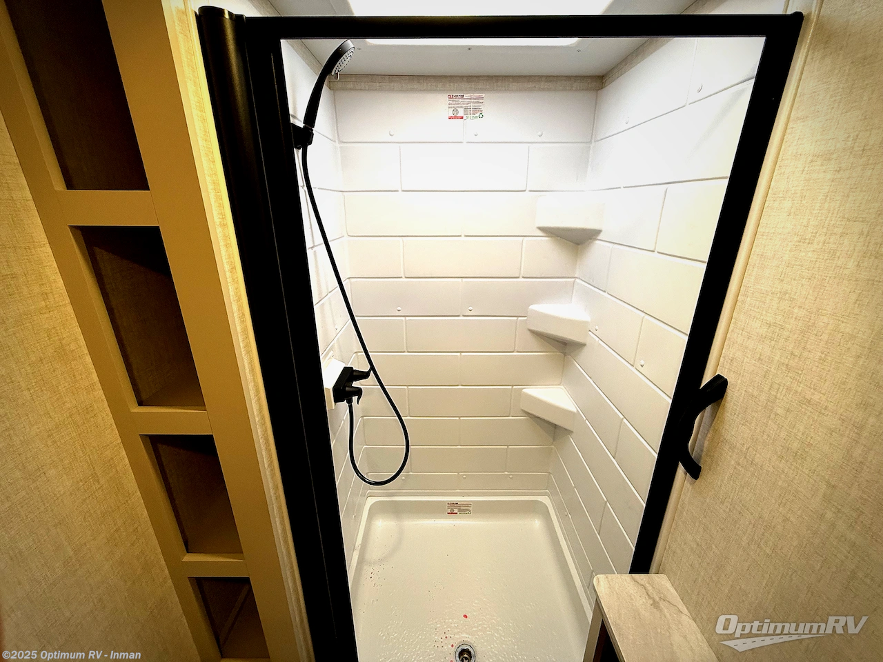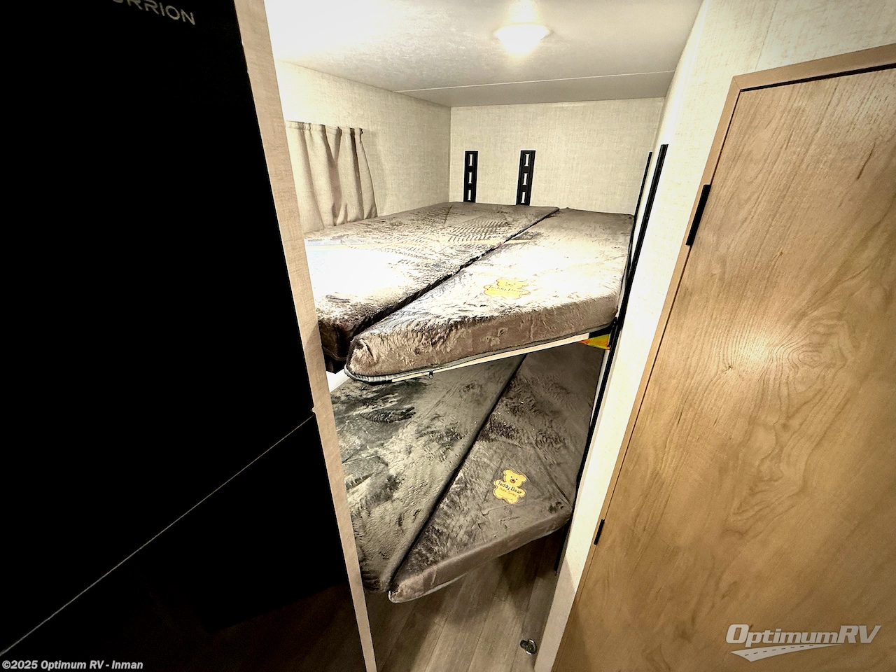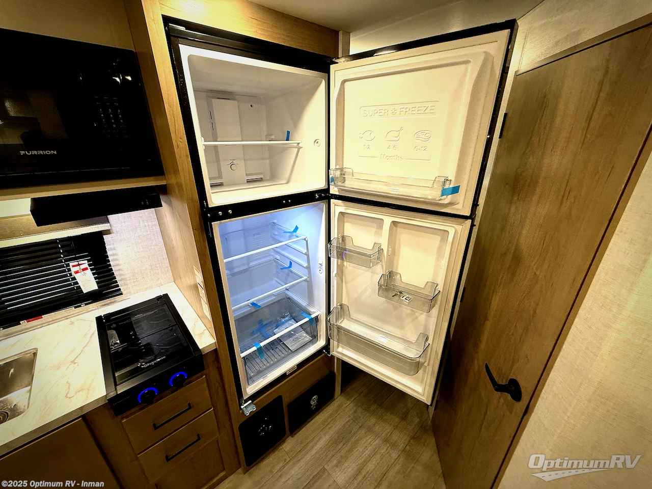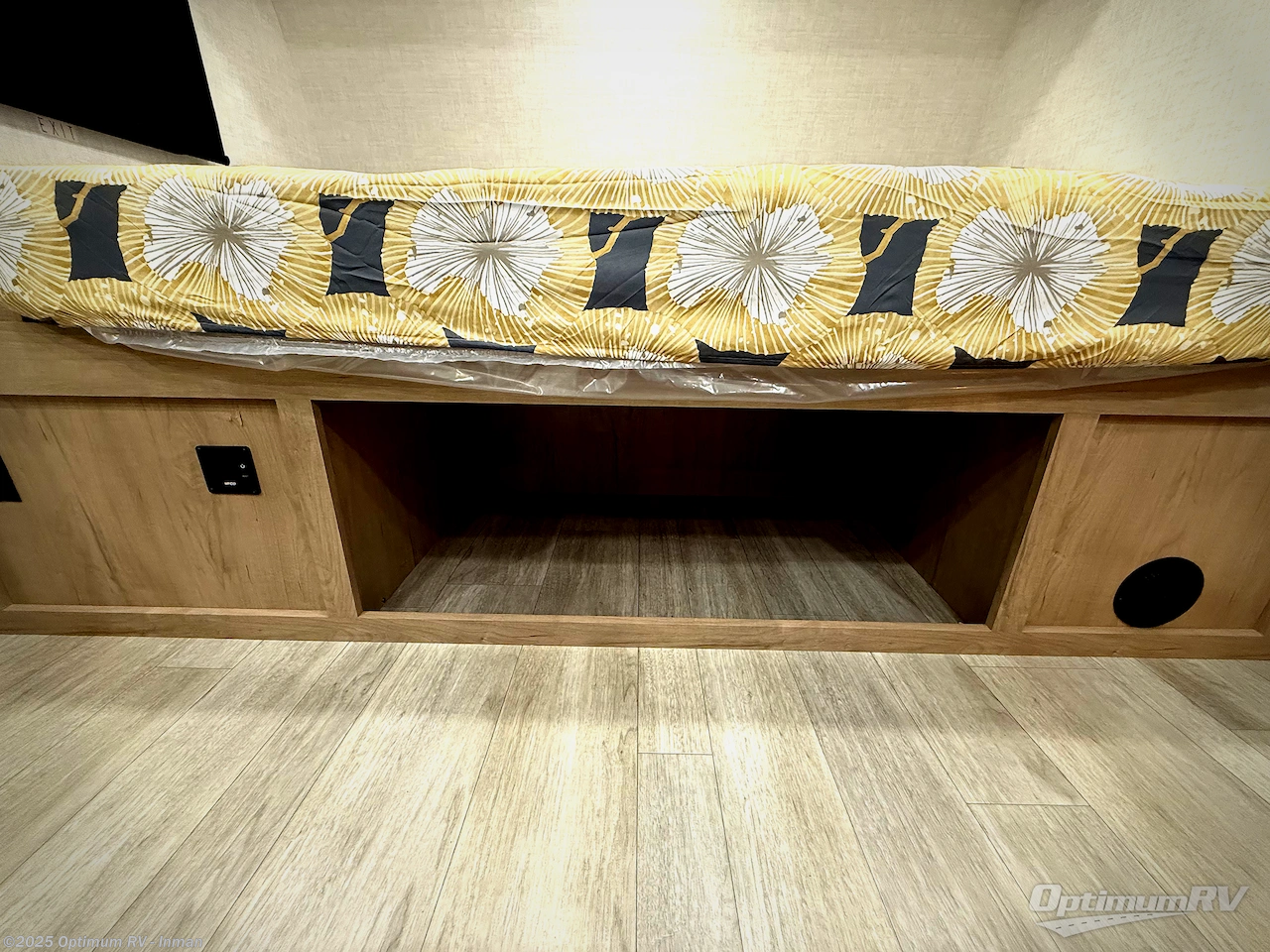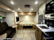 Time at the campground in this travel trailer will be time well spent. Once you arrive at your destination, you can put out the 16' electric awning, unpack the pass-through storage, then head inside for lunch. There is an air fryer convection microwave plus a dual burner cooktop to make meals each day, and the 10 cu. ft. 12V refrigerator will keep your food fresh. A legless dinette slide provides a place to dine together and even let a guest sleep over. If you're not needing the extra sleeping space, just choose the optional theater seating! You'll find the front queen bed will give you a great night's rest, and there is a full bath on board that will allow you to freshen up each morning. This unit includes the patent-pending repositionable EmberTrack E-Track bunk/storage system that allows for multiple single/double bunk configurations, depending on your needs.