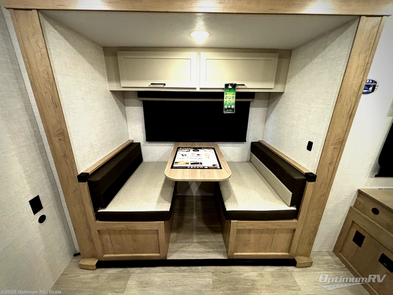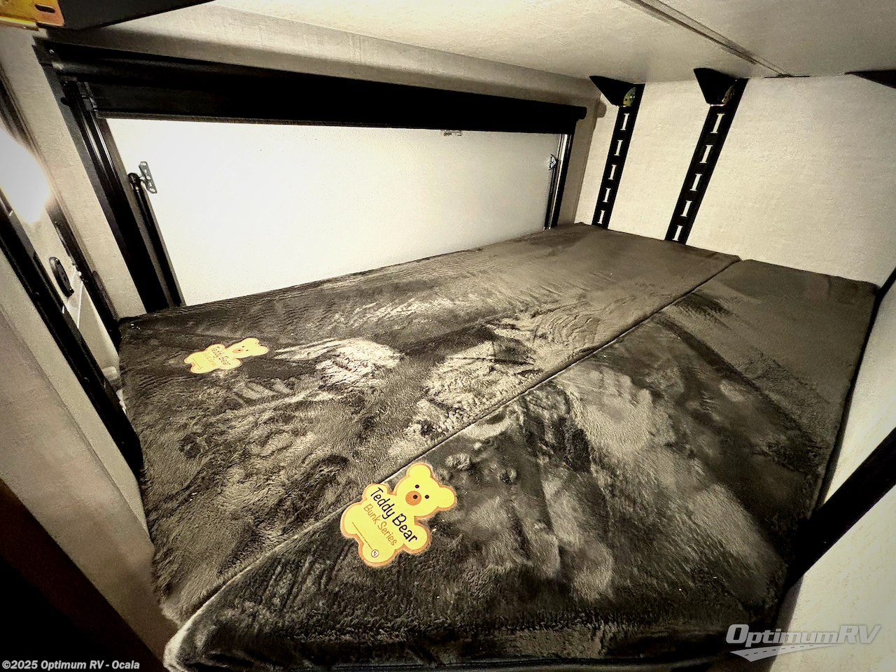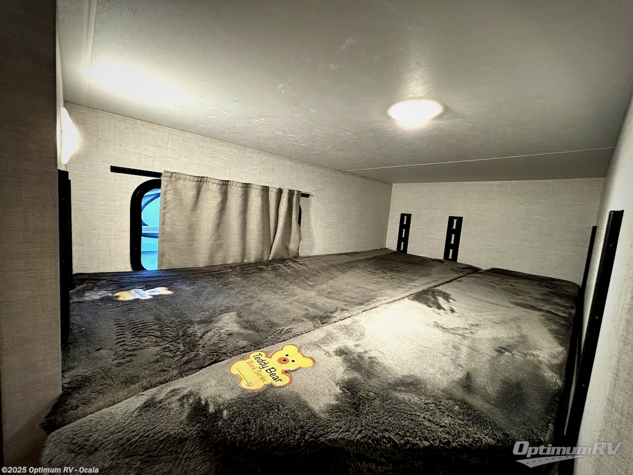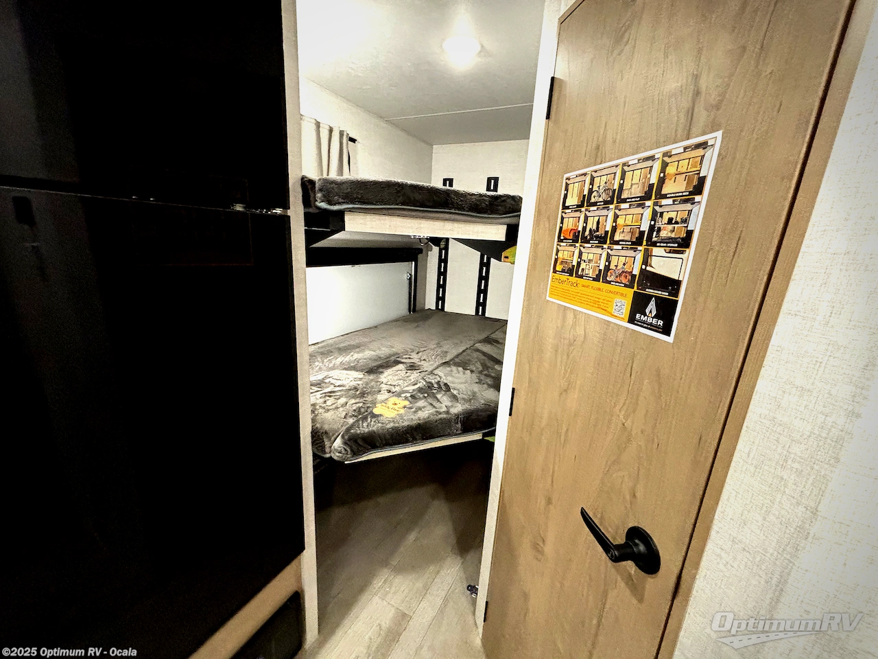 Time at the campground in this travel trailer will be time well spent. Once you arrive at your destination, you can put out the 16' electric awning, unpack the pass-through storage, then head inside for lunch. There is an air fryer convection microwave plus a dual burner cooktop to make meals each day, and the 10 cu. ft. 12V refrigerator will keep your food fresh. A legless dinette slide provides a place to dine together and even let a guest sleep over. If you're not needing the extra sleeping space, just choose the optional theater seating! You'll find the front queen bed will give you a great night's rest, and there is a full bath on board that will allow you to freshen up each morning. This unit includes the patent-pending repositionable EmberTrack E-Track bunk/storage system that allows for multiple single/double bunk configurations, depending on your needs.