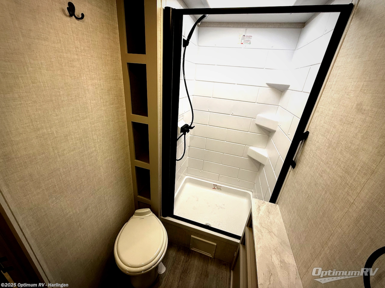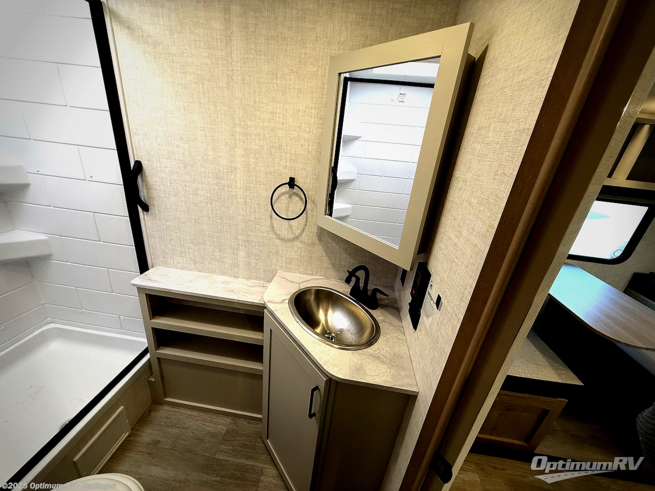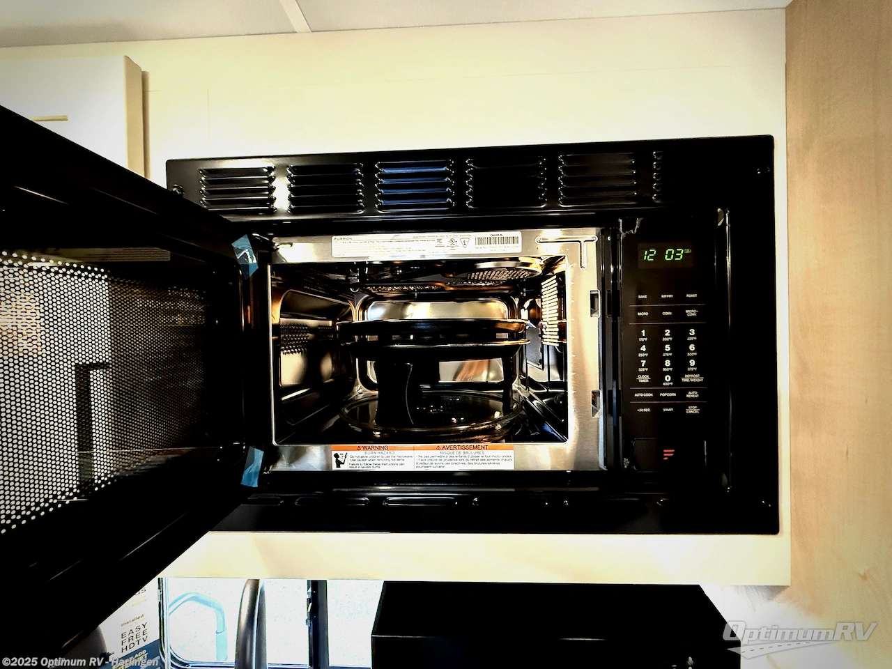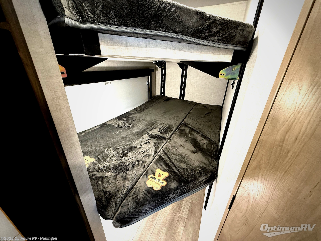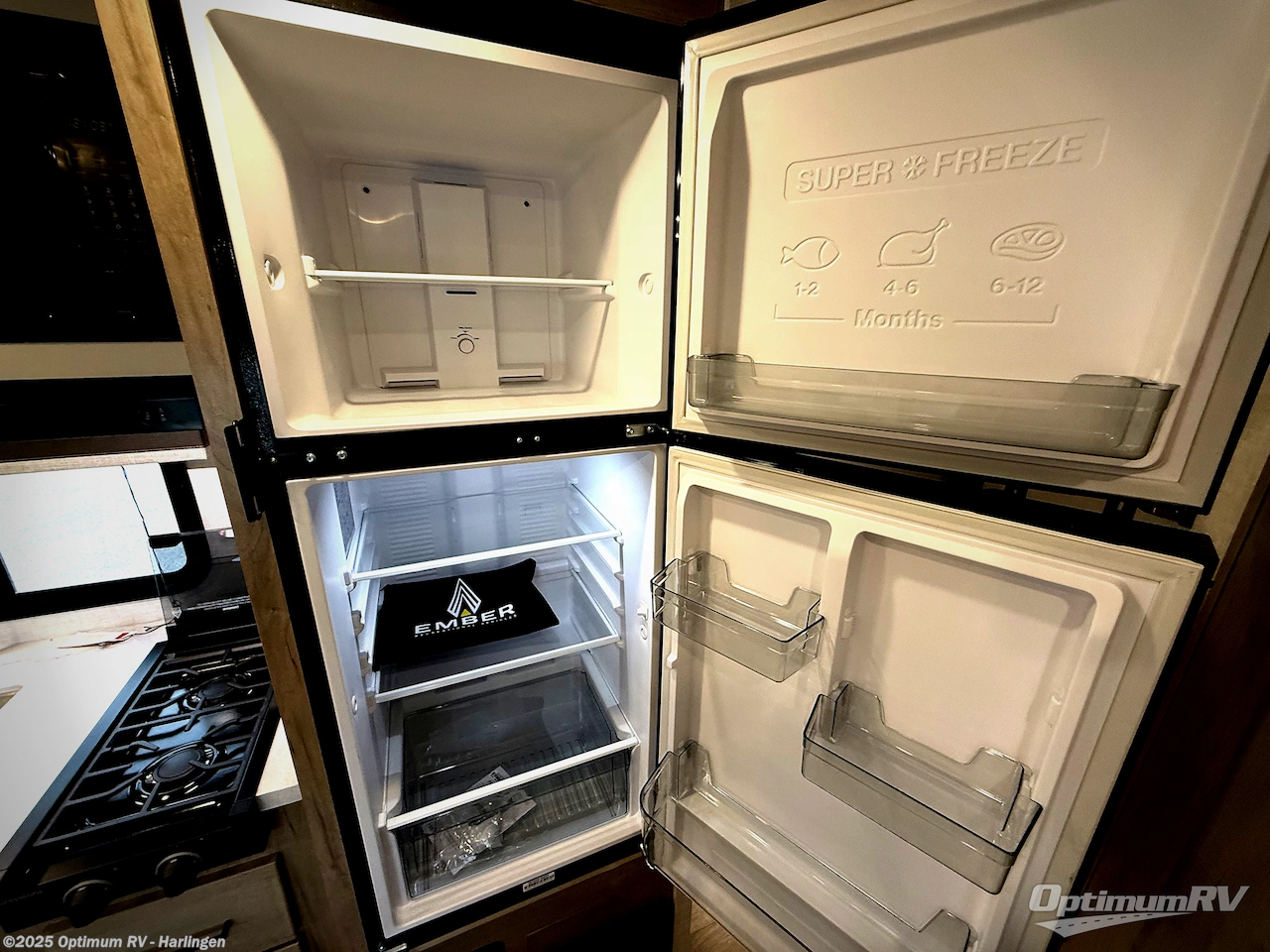 Time at the campground in this travel trailer will be time well spent. Once you arrive at your destination, you can put out the 16' electric awning, unpack the pass-through storage, then head inside for lunch. There is an air fryer convection microwave plus a dual burner cooktop to make meals each day, and the 10 cu. ft. 12V refrigerator will keep your food fresh. A legless dinette slide provides a place to dine together and even let a guest sleep over. If you're not needing the extra sleeping space, just choose the optional theater seating! You'll find the front queen bed will give you a great night's rest, and there is a full bath on board that will allow you to freshen up each morning. This unit includes the patent-pending repositionable EmberTrack E-Track bunk/storage system that allows for multiple single/double bunk configurations, depending on your needs.