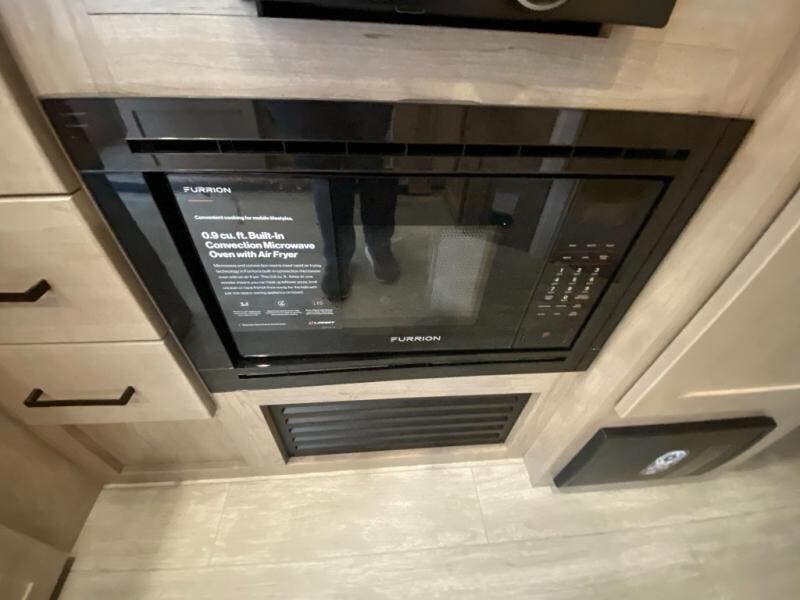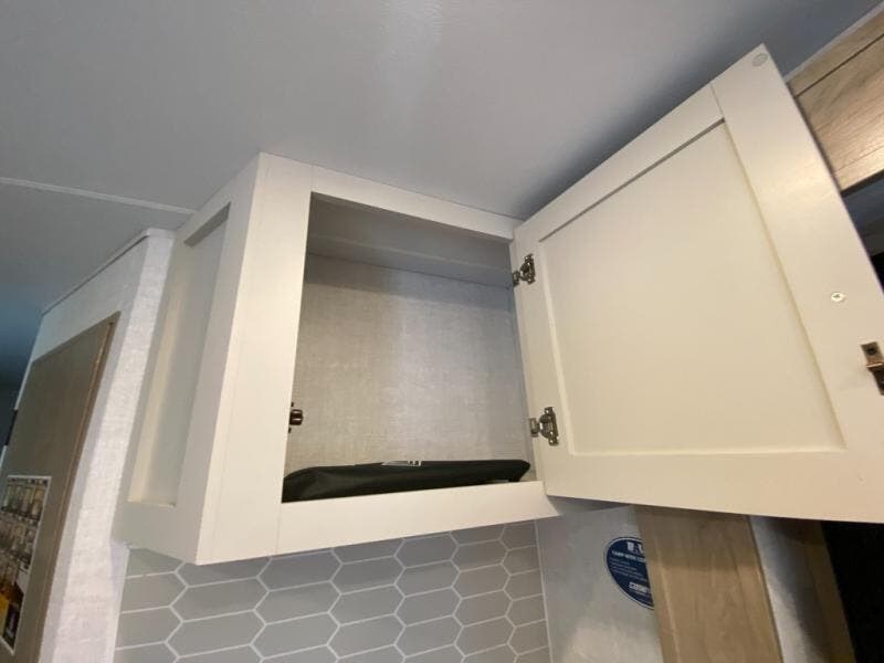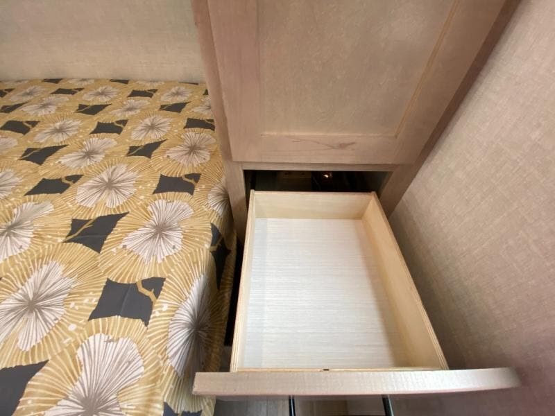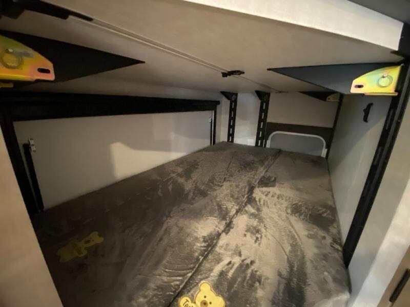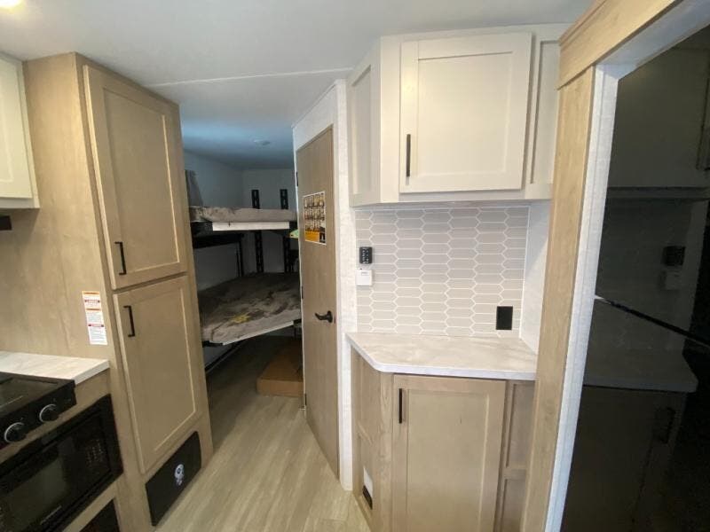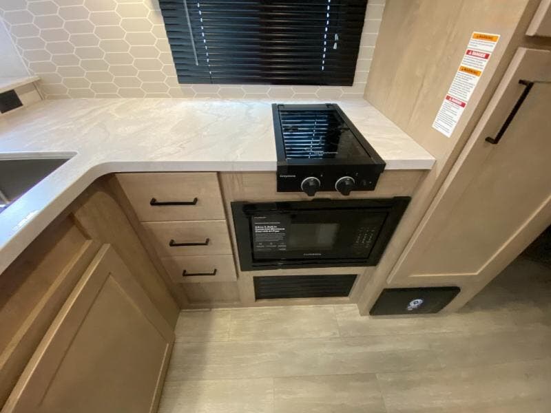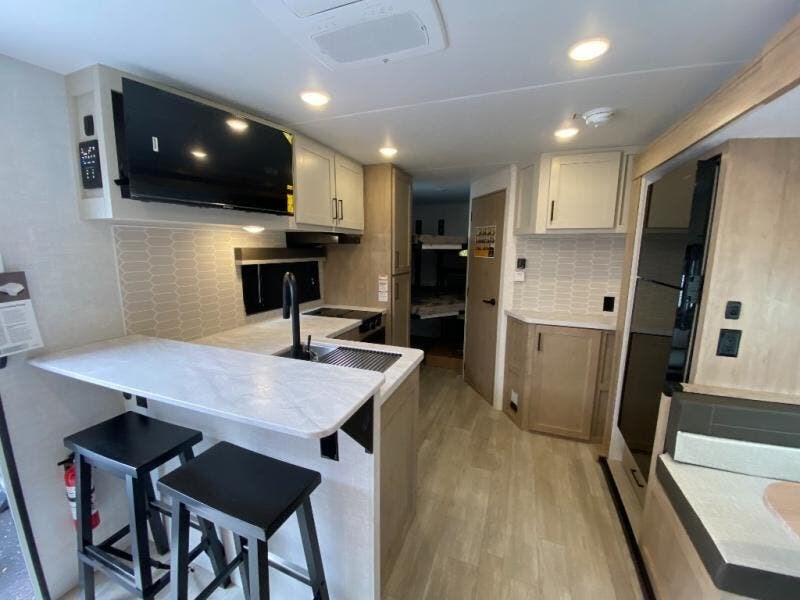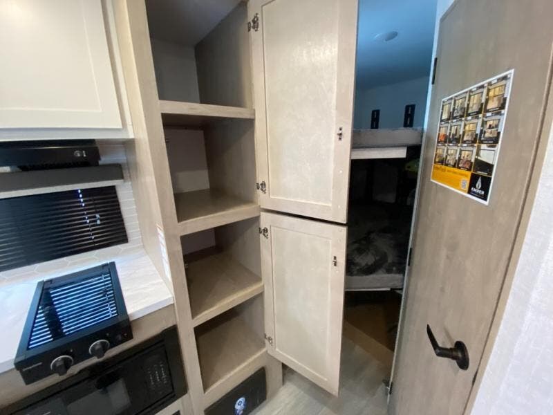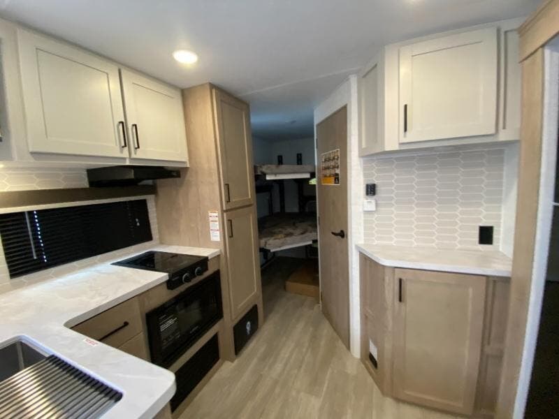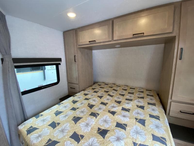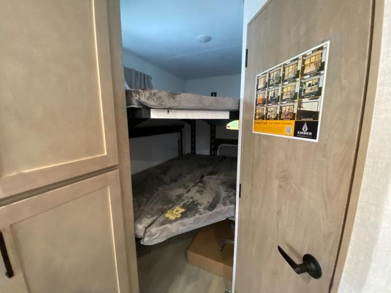 You'll love every minute spent in this spacious travel trailer that can sleep up to six. The patent-pending repositionable EmberTrack E-Track bunk/storage system includes 74" x 45" cargo space, and there are multiple single/double bunk configurations to fit your needs. The front walk-around true residential queen bed includes dual nightstands and dual wardrobes, plus a privacy curtain if you have guests staying over. This E-Series kitchen includes an air fryer convection microwave, a two burner cooktop, plus a breakfast bar with bar stools so you can visit with the chef as they cook meals. A legless dinette or optional theater seating will provide a place to dine, or you can take your plate outdoors to sit under the 14' power awning with a dimmable LED light. You'll also find a pass-through storage outside, along with a docking station and a kayak/bike storage door!