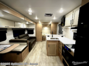 This model resembles 22ETS, but you'll enjoy added theater seating and a larger exterior length for more interior space! The patent-pending repositionable EmberTrack E-Track bunk/storage system includes 74" x 45" cargo space, and there are multiple single/double bunk configurations to fit your needs. The front walk-around true residential queen bed includes dual nightstands and dual wardrobes, and you'll appreciate sliding doors that makes a private bedroom. This E-Series kitchen includes an air fryer convection microwave, a two burner cooktop, plus a breakfast bar with bar stools so you can visit with the chef as they cook meals. A legless dinette will provide a place to dine, or you can take your plate outdoors to sit under the 18' power awning with a dimmable LED light. You'll also find a pass-through storage outside, along with a docking station and a kayak/bike storage door!
