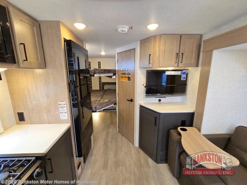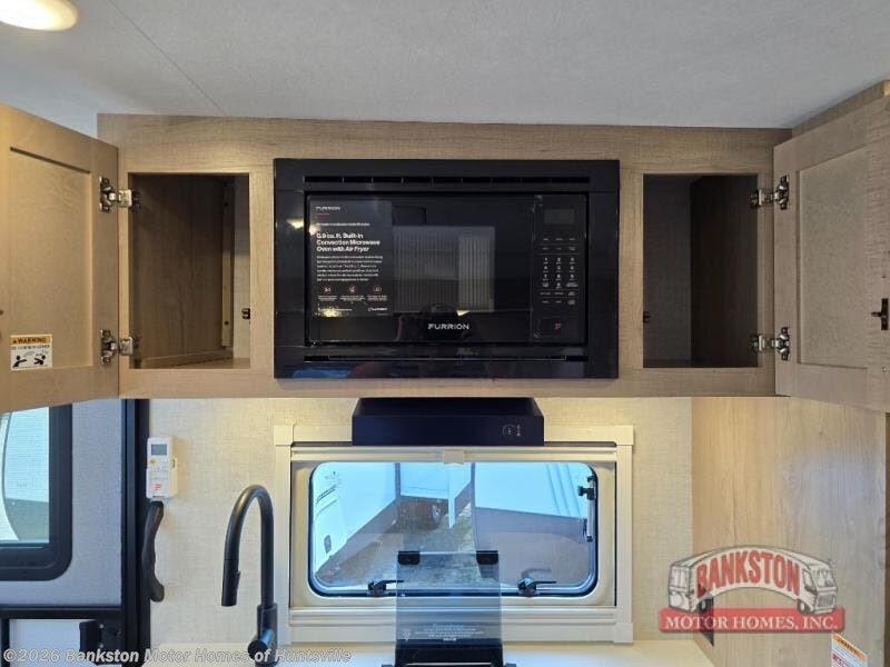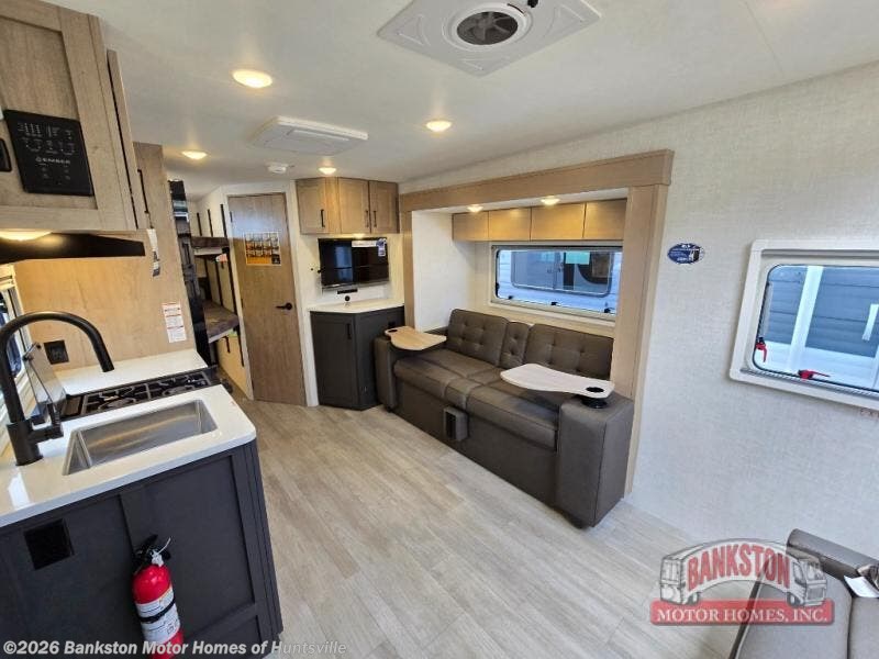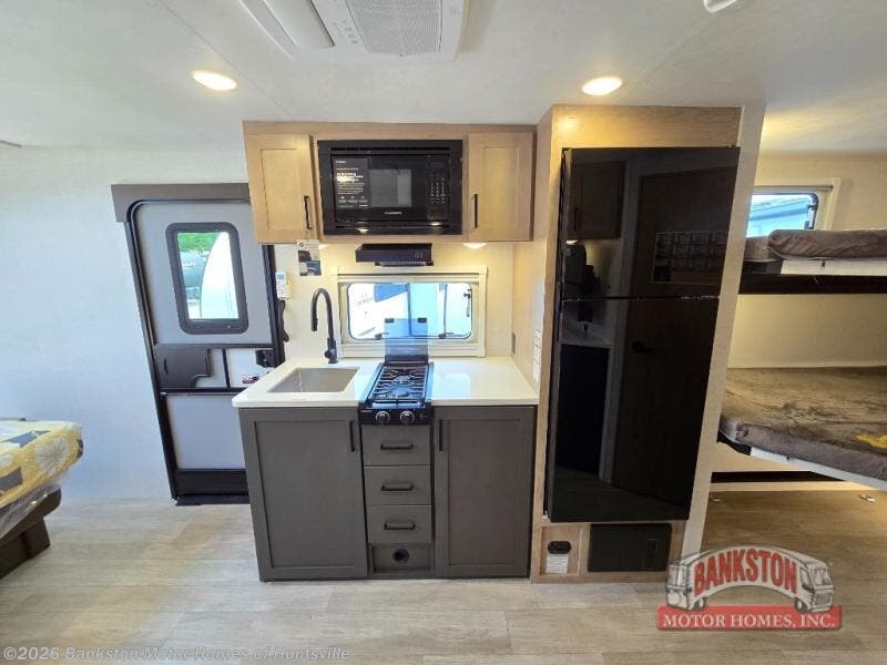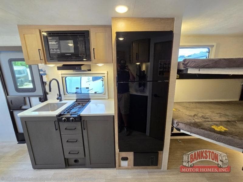 You're going to love everything about this travel trailer that can comfortably sleep three to six people each night, depending on your bunk configurations. There is a spacious storage locker that can be used for hiking gear, plus a kayak/bike storage door for quick and easy packing. The Embertrack system lets you convert the benches to twin bunks, double-size bunks, a desk, or remove them altogether for more storage space. You will enjoy the queen-size Murphy bed up front, along with the "stargazer" skylight for nighttime views, along with dual nightstands and dual wardrobes to keep your clothes tidy. And in the morning you can relax on the jack-knife sofa with a removable table once the bed is put away. This trailer also includes a full kitchen with a 12V refrigerator, an air fryer convection microwave oven, a dual burner cooktop, and a stainless steel sink for easy clean-up.