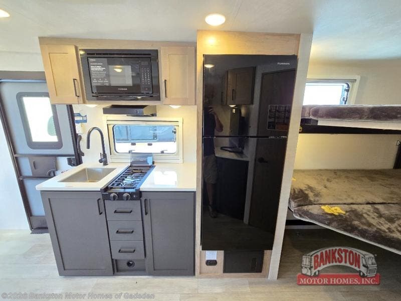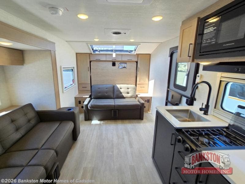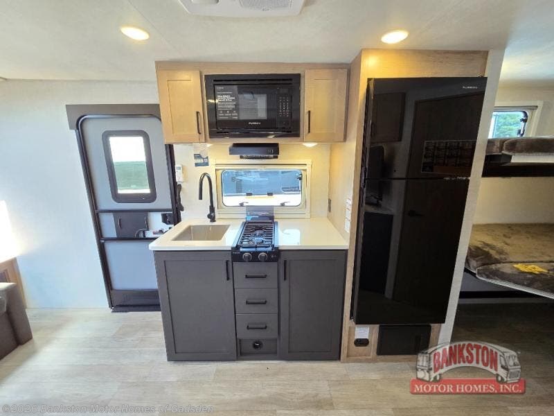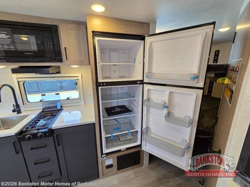 You're going to love everything about this travel trailer that can comfortably sleep three to six people each night, depending on your bunk configurations. There is a spacious storage locker that can be used for hiking gear, plus a kayak/bike storage door for quick and easy packing. The Embertrack system lets you convert the benches to twin bunks, double-size bunks, a desk, or remove them altogether for more storage space. You will enjoy the queen-size Murphy bed up front, along with the "stargazer" skylight for nighttime views, along with dual nightstands and dual wardrobes to keep your clothes tidy. And in the morning you can relax on the jack-knife sofa with a removable table once the bed is put away. This trailer also includes a full kitchen with a 12V refrigerator, an air fryer convection microwave oven, a dual burner cooktop, and a stainless steel sink for easy clean-up.