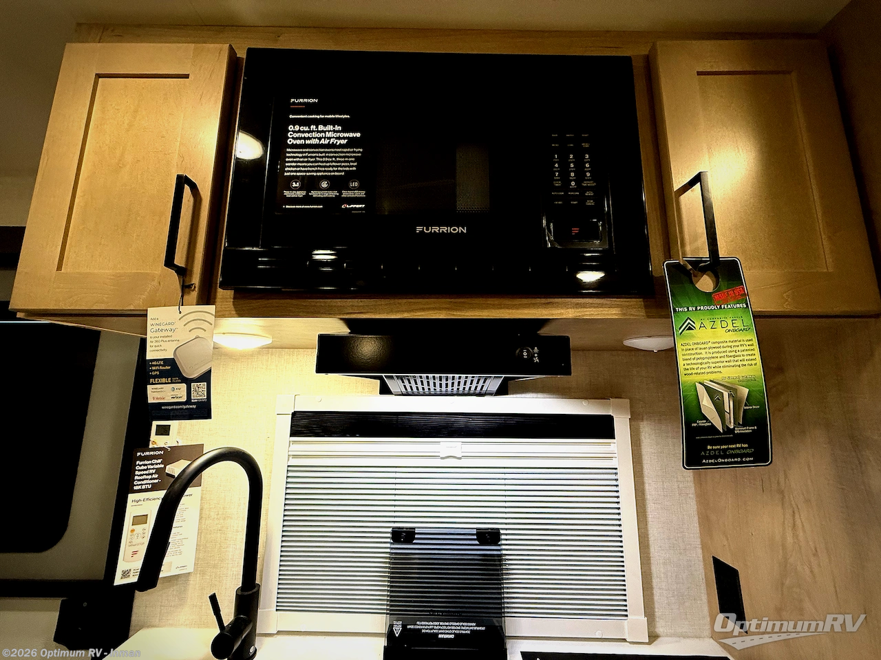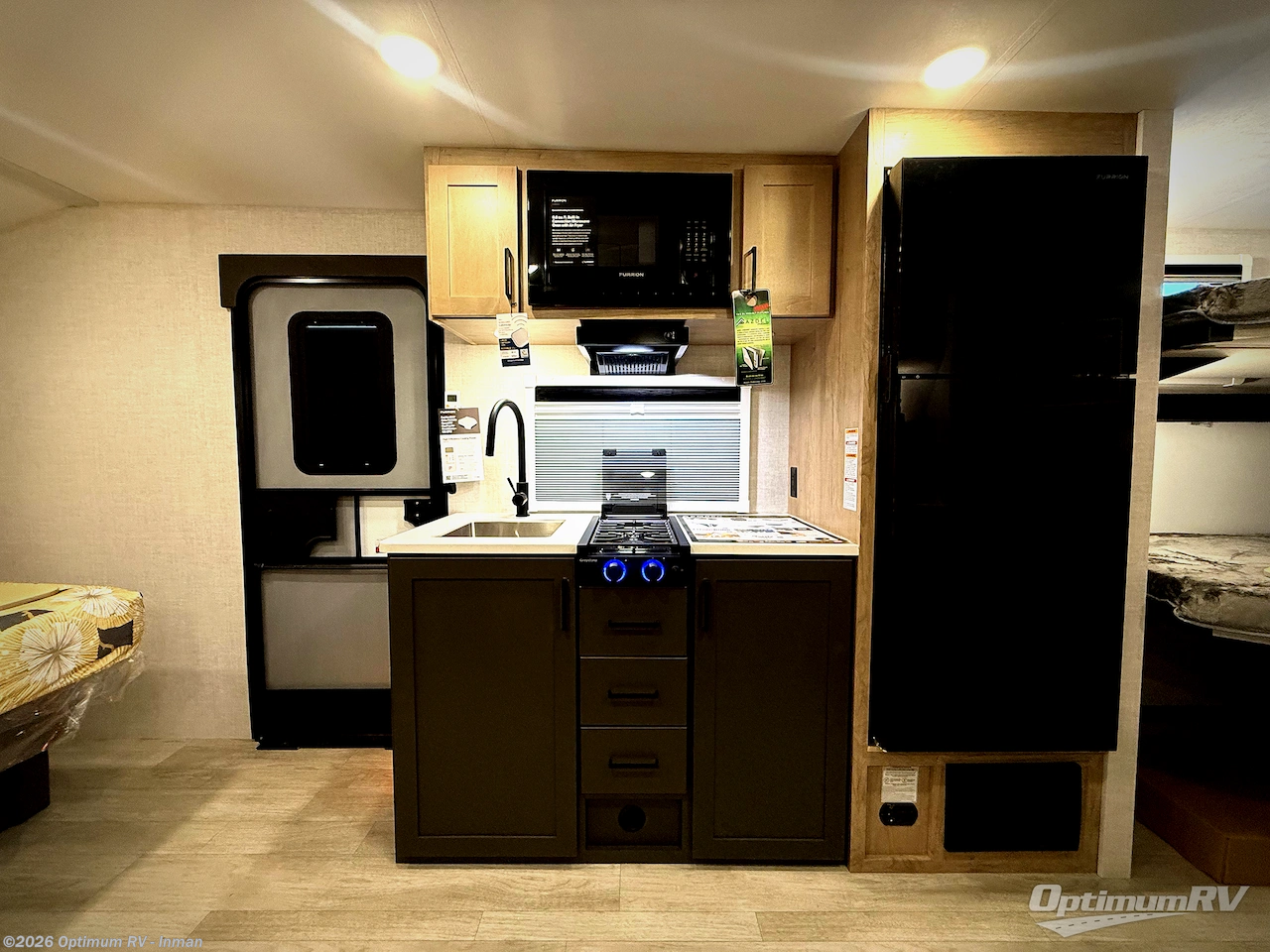You're going to love everything about this travel trailer that can comfortably sleep three to six people each night, depending on your bunk configurations. There is a spacious storage locker that can be used for hiking gear, plus a kayak/bike storage door for quick and easy packing. The Embertrack system lets you convert the benches to twin bunks, double-size bunks, a desk, or remove them altogether for more storage space. You will enjoy the queen-size Murphy bed up front, along with the "stargazer" skylight for nighttime views, along with dual nightstands and dual wardrobes to keep your clothes tidy. And in the morning you can relax on the jack-knife sofa with a removable table once the bed is put away. This trailer also includes a full kitchen with a 12V refrigerator, an air fryer convection microwave oven, a dual burner cooktop, and a stainless steel sink for easy clean-up.