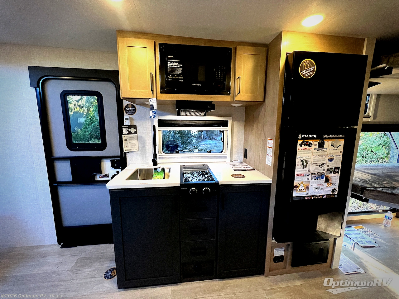 You're going to love everything about this travel trailer that can comfortably sleep three to six people each night, depending on your bunk configurations. There is a spacious storage locker that can be used for hiking gear, plus a kayak/bike storage door for quick and easy packing. The Embertrack system lets you convert the benches to twin bunks, double-size bunks, a desk, or remove them altogether for more storage space. You will enjoy the queen-size Murphy bed up front, along with the "stargazer" skylight for nighttime views, along with dual nightstands and dual wardrobes to keep your clothes tidy. And in the morning you can relax on the jack-knife sofa with a removable table once the bed is put away. This trailer also includes a full kitchen with a 12V refrigerator, an air fryer convection microwave oven, a dual burner cooktop, and a stainless steel sink for easy clean-up.