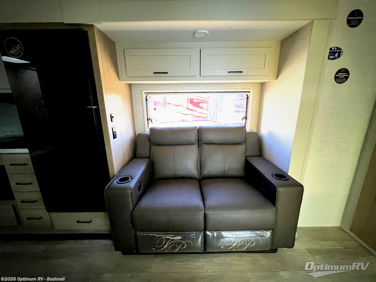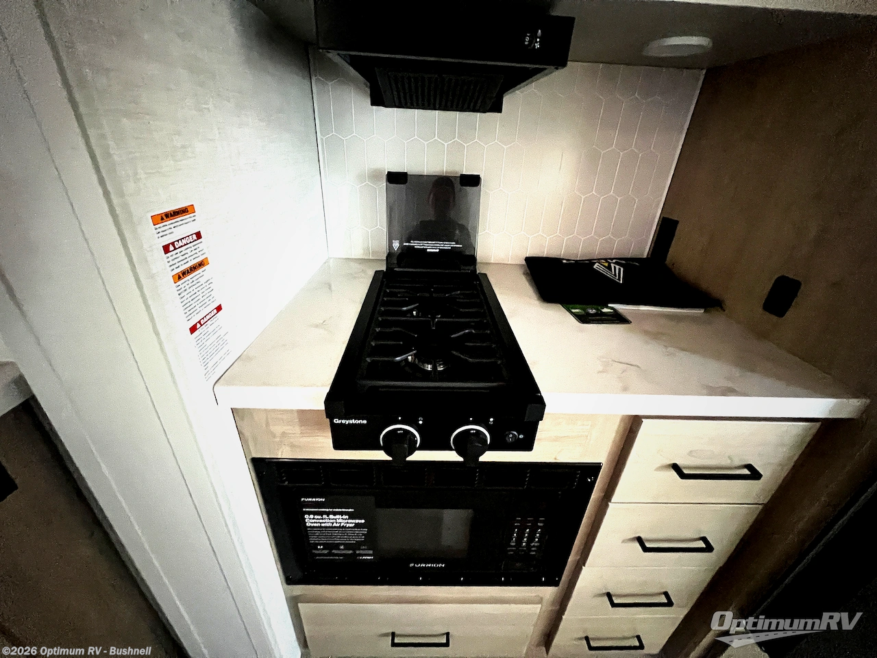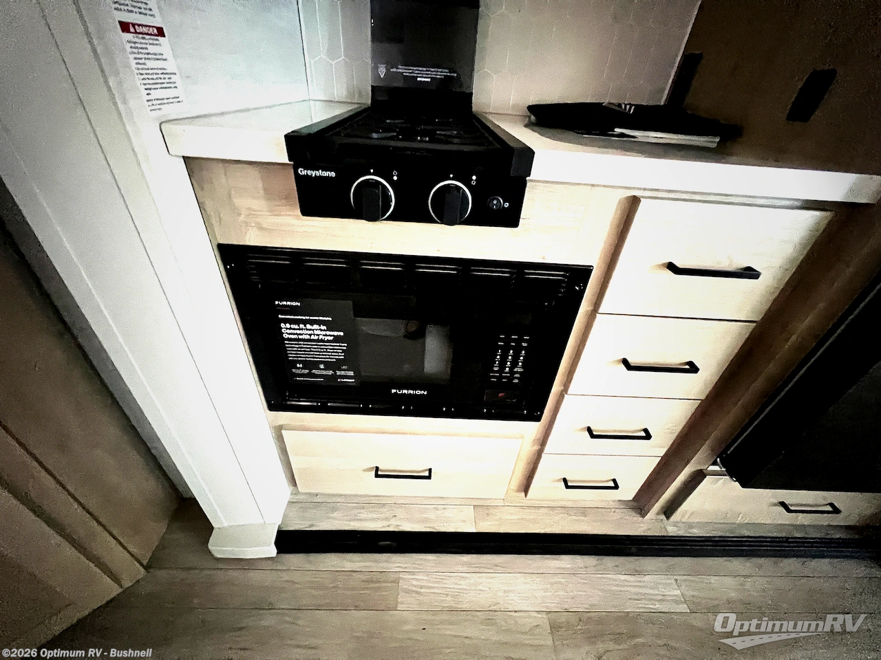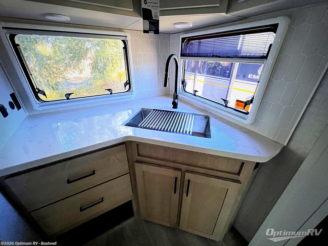 Pack your bags and head to your favorite camping spot in this front bedroom travel trailer! You will sleep soundly on the walk-around residential queen bed with an optional Murphy bed, and there are dual nightstands and dual wardrobes to keep your things tidy. The rear of the unit is shared with the full bath and the kitchen countertop with a large stainless-steel sink, and you'll find the dual-burner LP cooktop and air fryer convection microwave within the large slide out! There is also theater seating with rotating side tables here, which is in perfect view of the HDTV for movie nights. And you're going to love the EmberFlex Dinesk, dining table/bar/desktop that can be reconfigured to fit your needs best!