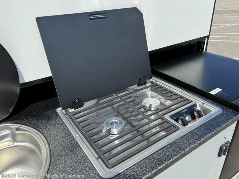 You can easily explore and take on new adventures with this lightweight travel trailer featuring a bunkhouse layout with lower true queen 60" x 80" futon/mattress and an upper 70" x 54" mattress that would be perfect for your children or extra storage. You will find ample space for your things throughout, and a slide out kitchen in back for cooking. Here you can whip up meals and snacks easily with a two-burner LP stove with cast iron grates and glass cover, a stainless steel sink with faucet, a 3.3 cubic foot 12V refrigerator to keep your perishables cold, and a sink plus 27 gallons of fresh water.